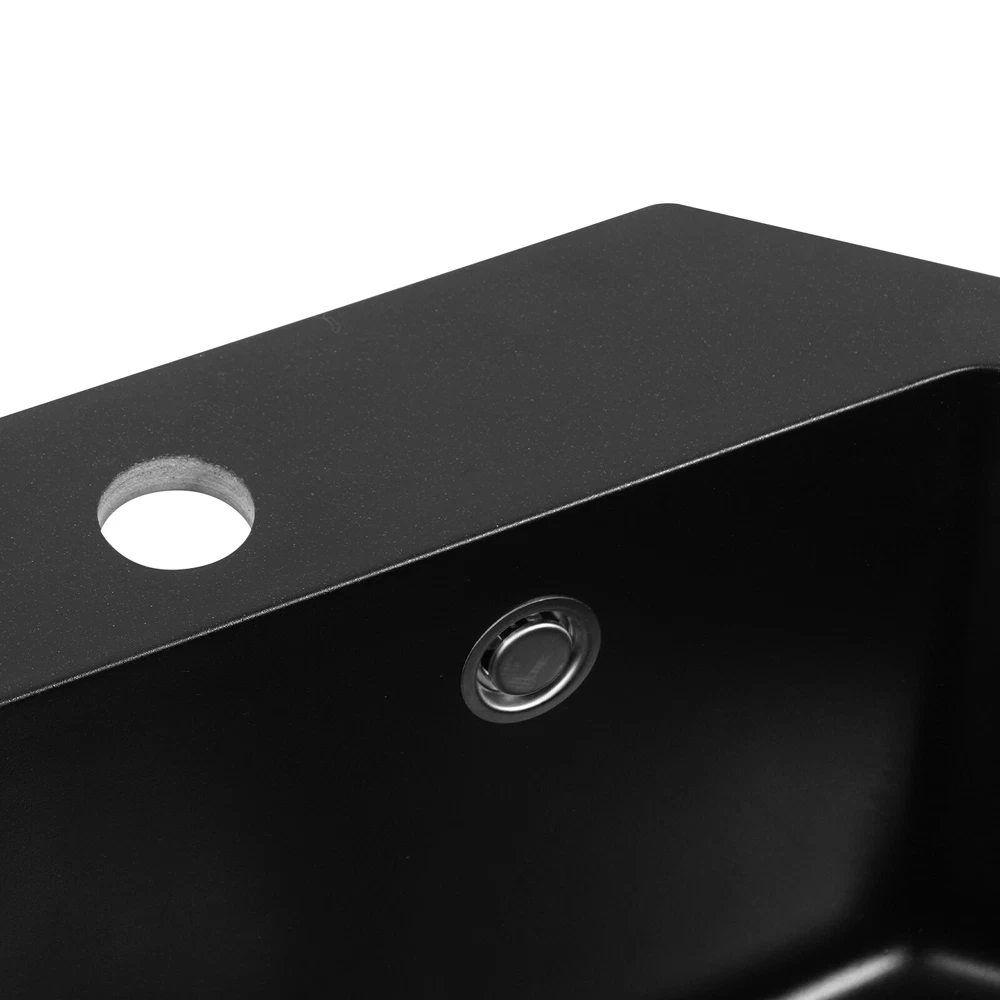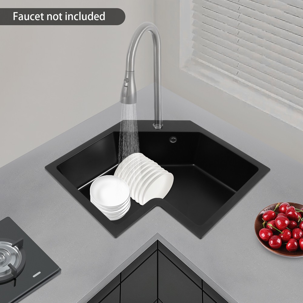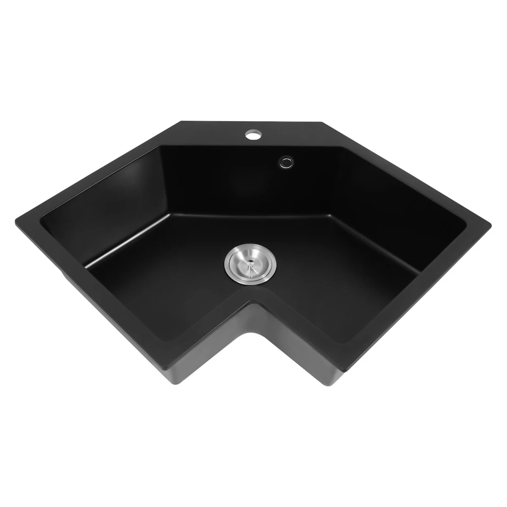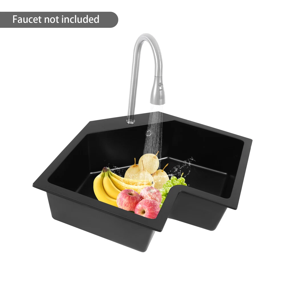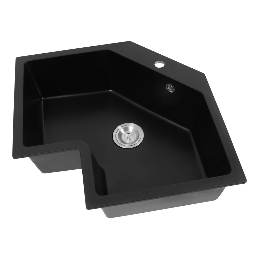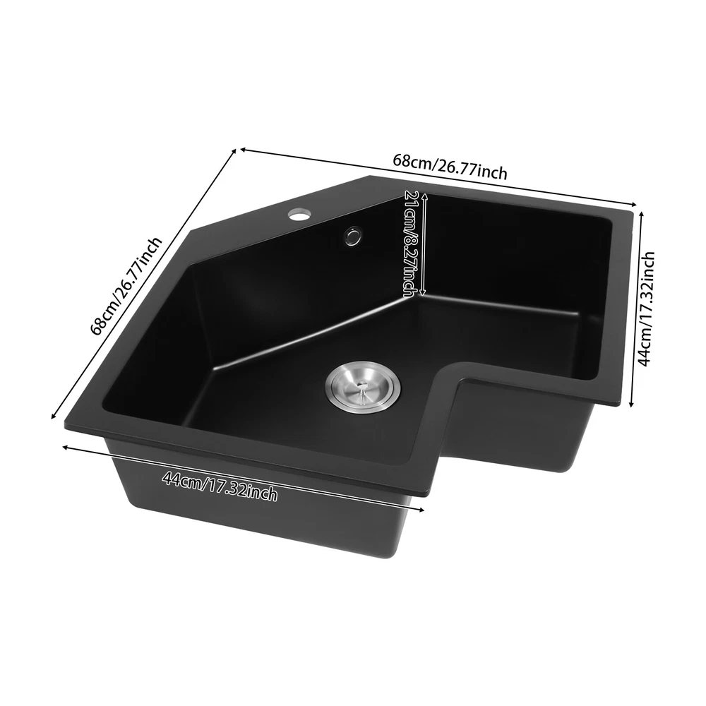 Undermount Flushmount Corner Kitchen Sink Irregular Kitchen Sink w/ Strainer Description This corner kitchen sink is made of high-class materials and adopts excellent workmanship, making it sturdy and corrosion-resistant. Its enlarged and deepened sink not only reduces water splashing but also increases the space for cleaning a lot of cookware. With it, you can enjoy a more convenient life. Don't hesitate, upgrade your kitchen and embrace future life! Key Features Build to Last: It is made of high-class quartz and rubber, so it has good corrosion resistance, oxidation resistance, and impact resistance. It can be used in wet environments such as the kitchen and laundry room. Large Capacity: The deep sink (depth: 8.27") can hold a large amount of dishes, making you more comfortable and efficient when washing. It is a great helper for you to clean dishes or prepare food. Enhanced Load-bearing Capacity: The sink is made of thickened (bottom thickness: 12mm, side thickness: 0.8mm) and reinforced quartz, which can withstand 220.46 lbs weight so you can use it with confidence. Good Sealing Performance: The rubber sealing rings can make the connection tighter, effectively reducing water leakage and saving you costs. Excellent Odor-resistance Performance: The drainage strainer intercepts food and debris for easy disposal and prevents clogging. The specially designed drain pipe drains faster, so you don't have to worry about being troubled by the unpleasant smell. Thoughtful Design: The drainpipe can be freely bent, depending on the installation position, reducing use restrictions. Maximize Space Utilization: It can fit into the corner of your kitchen countertop, utilizing the often underutilized corner space, enhancing your cooking experience, and making your kitchen more organized and efficient. Modern Appearance: With its unique irregular geometric shape, low-ley black color, and smooth lines, it can easily integrate into the kitchen space, showing an aesthetic that is both modern and elegant. Easy to Install: Its simple structure and complete accessories allow you to easily complete the installation in a short time. In addition, 2 different mounting ways (undermount, flushmount) can meet your different needs. Easy to Clean : The smooth surface, simple construction, and rounded corner design that does not easily harbor dirt make the sink easy to rinse with clean water. Buy with Confidence: We stand behind all our guests and look forward to assisting you with your purchase. It is our pleasure to answer your confusion and questions. The end of the story between us is not "we sell and you buy". Details Anti-overflow Hole: It can reduce the risk of overflowing water. Even if you forget to turn off the water, you don't have to worry. Rounded Corners and Edges: The corners are rounded and smooth to reduce abrasions from collisions and improve safety. Application This product can be widely used at homes, restaurants, bars, hotels, cafes, milk tea shops, school canteens, dessert shops, cafeterias, garages, clean rooms, and any other commercial places for manual cleaning of food, fruits, vegetables, dishes, etc. Specifications Material: Quartz, Rubber Color: Black Assembly Required: Yes Shape: Irregular Mounting Type: Undermount, Flushmount Style: Modern Thickness: 12mm/0.47in(Bottom), 8mm/0.31in(Side), 10mm/0.39in(Upper Edge) Load-bearing Capacity: 100kg/220.46lbs Drainpipe Length: About 1m/3.28ft Product Side Length: 44cm/17.32in, 68cm/26.77in Product Depth: 21cm/8.27in Package Size: 81*81*30.7cm/31.89*31.89*12.09in Gross Weight: 15kg/33.07lbs Net Weight: 14.25kg/31.42lbs Package Included 1* Corner Kitchen Sink 1* Drainpipe 1* Strainer All Accessories for Assembly Notes Please check the size carefully before ordering. Please do not scratch its surface with sharp objects to obtain a longer service life. If you want to get a better installation effect, we suggest you ask professional workers to install it. Please allow the slight color difference caused by the shooting light and 1-3cm error due to manual measurement, and make sure you do not mind before you order. Payment Delivery details Terms of sales About us Contact us Payment We accept ebay payment 。 Fees such as import duties, taxes are not included in the item price or shipping costs. These charges are the buyer's responsibility. Delivery details Shipping: 2-9 working days to: USA Terms of sales We maintain high standards of excellence and strive for hundred percent customer satisfaction. Feedback is very important to us. We hope that you contact us immediately before you give neutral or negative feedback, so that we can address your concerns. It is impossible to address issues if we do not know about them! About us Your satis faction is our ultimate goal. We work hard to earn your trust and future business. Our certified technicians have tested each item before shipping. The unit comes with 1 year limited warranty on all manufacturing defects. a) If you receive a defective item, you may return it or ask for a discount. Please contact us within 14 days after you receive the package. b) What you returned must be intact and in its original packaging as re? u. Customer is responsible for shipping costs of the returned item. c) We will cover the cost of shipping back t with the shipping rate indicated in the registration page. We will send you a new unit or refund the full payment you paid. Thank you. Contact us Business Hour Business Hour: Monday To Friday: 8:30 AM to 5:00 PM (Beijing China time) Due to time zones, our reply to your questions may not be immediately. But within above working time, we will reply your email within 24 hours. If it's non-workdays, please kindly be patient and wait till Monday. Please contact us with ebay message. Please feel free to contact us if you have any questions. Monday To Friday: 8:30 AM to 5:00 PM (Beijing China time) Due to time zones, our reply to your questions may not be immediately. But within above worki