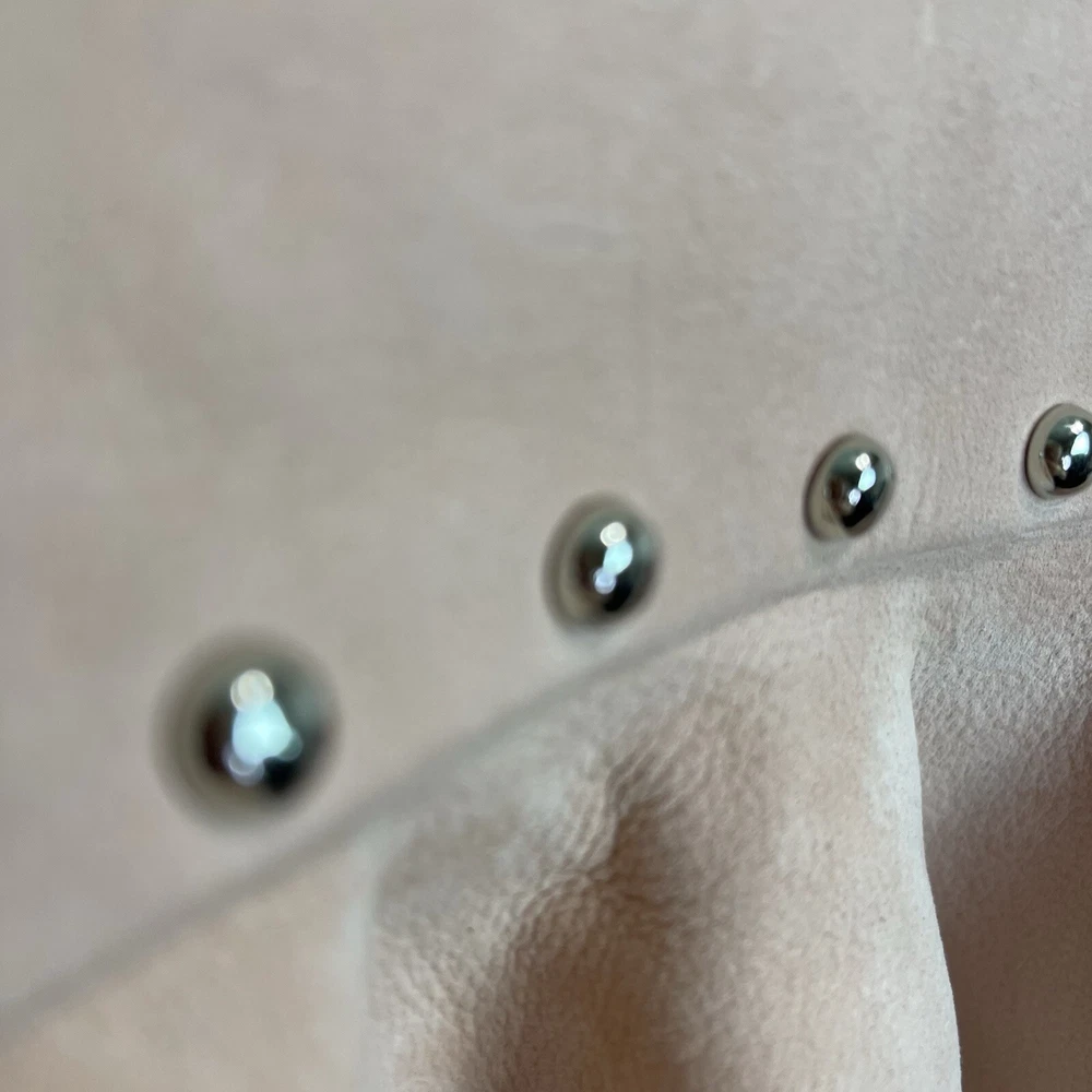 Add a touch of boho chic to your wardrobe with this Understated Leather suede skirt in a beautiful shade of pink. The skirt features silver studs, adding a subtle touch of cowgirl vibe to your outfit. Made of high-quality leather, this mini skirt is perfect for all seasons and is lined for extra comfort. This skirt is a size M and is suitable for regular-sized women. The skirt is perfect for various themes like hipster, festival, rock, streetwear, cowboy, quiet luxury, city, metal, boho, southwestern, retro, and romantic. It is a versatile piece that can be styled to match your personality and style.