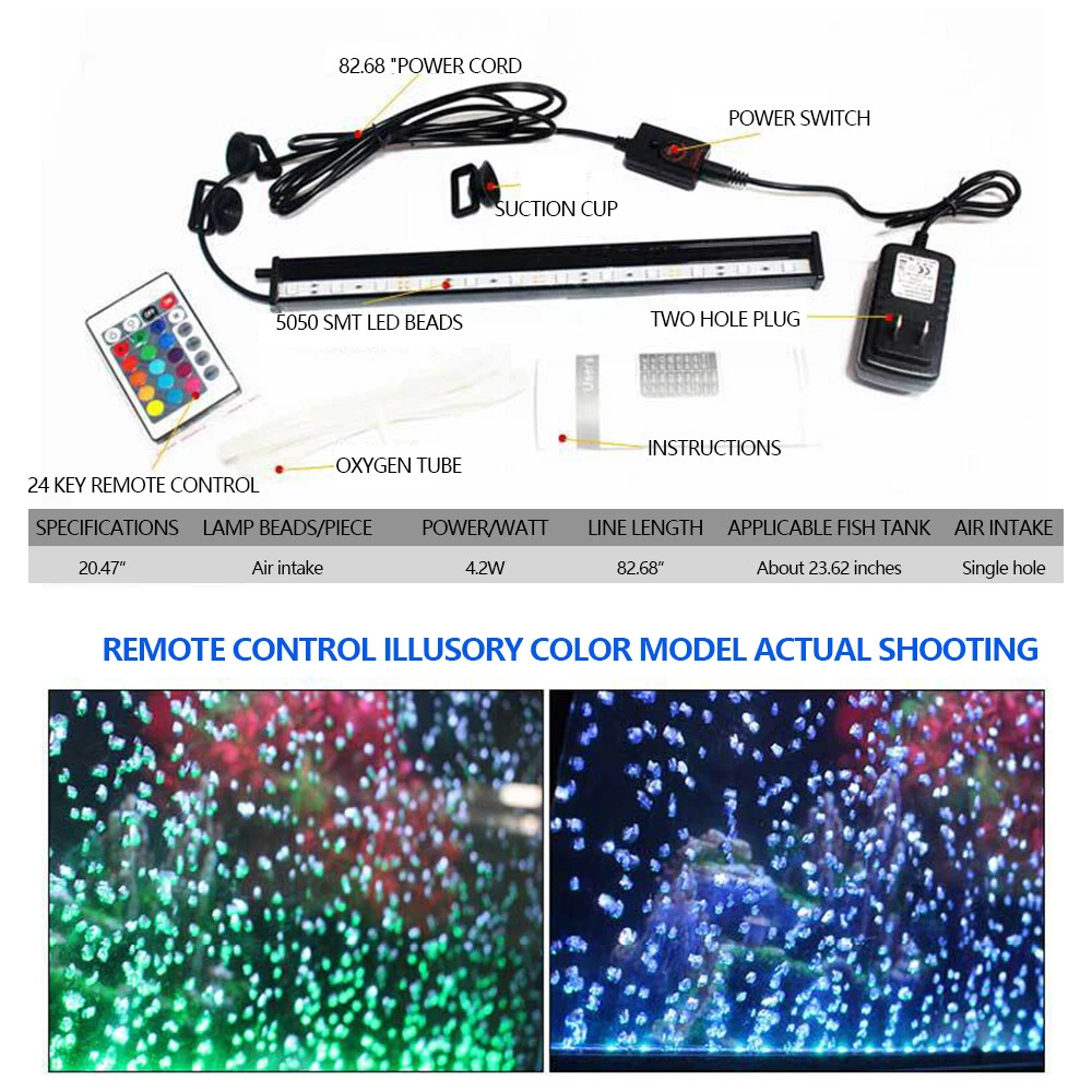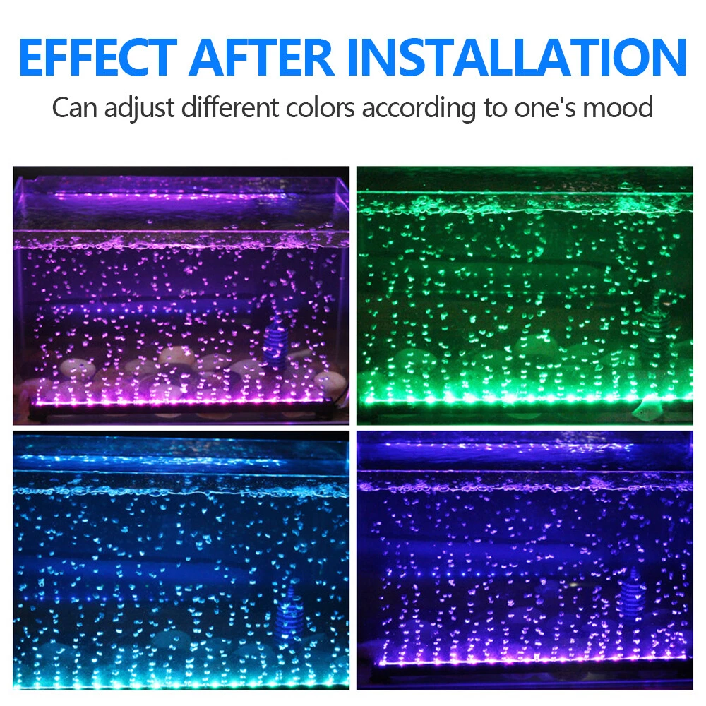 Underwater Aquarium LED Light Fish Tank RGB Submersible Lamp + Remote Specification for 20in-RGB(W/ Bubble+Remote) Type: Aquarium Light Light Length: 52cm/ 20.5 in Power: 4.2W Plug Type: US Plug LED Chips: 5050RGB LED lamp bead number:21 LEDs Proteciton grade: IP68 Package Includes: 1x bubble light 2x remote controller (Batteries not included) 3x suction cup 1x 1m gas pipe Specification for 11in-Blue&White/RGB(No Bubble+Remote) Voltage: 90-260V, 50/60HZ Light Color: Blue+White/ RGB Material: Plastic Lamp bead model: 5730 Length: 11" LED: 18 LED Power:6W Package Included: 1X LED aquarium light Features for 20in-RGB(W/ Bubble+Remote) 🐠Aquarium light: high efficiency, low power consumption. it can save more of energy and cost. 🐠Safety: IP68 Waterproof grade, long service life. 🐠Submersible aquarium light: with imported LED bulb,strong illumination can effectively promotes the photosynthesis. 🐠LED aquarium light: 24-button board with 16 single colors and 4 dynamic colors, energy saving and environmental protection lamp beads, long life. 🐠Attention: Before use, the air inlet of the air stone is on the top, and it is soaked in water at 45° until the air in the air stone is discharged. Soak for 24 hours for better results. Features for 11in-Blue&White/RGB(No Bubble+Remote) : 1. High light 5730 SMD lamp beads, energy saving. 2. IP68 waterproof rating, amphibious. 3. 12v working voltage, make your fish safer. 5. with super bright 7000-7500k white LED and rich 460nm blue light for plants and fish 6. Built-in dimmer: 11inch light with 18LED 7. waterproof and easy to install, you can buy and use with confidence. Three light source options: - Blue and white, cool and bright, suitable for water plant growth; - RGB, ice blue, emerald green, bright red three color lamp beads, brighten the color, make the luster more gorgeous, suitable for ornamental fish; Payment Delivery details Terms of sales About us Contact us Payment 1.We accept PayPal/credit/Gpay 2.All payments must be received within 10 days after auction won 3.Non-pay bidder will get a negative feedback and an unpaid alert from eBay 4.E-checks via Paypal will be hold until it is cleared Delivery details Most Items Free Shipping within the 48 States. We ship within the United States only. The term EXCLUDES the states of Alaska, Hawaii and all off-shore U.S. territories and possessions such as Puerto Rico, Guam and Virgin Islands. We do not ship to APO and FPO . Delivery Time: 4-7 business days (Varies by Destination) Shipping Carriers are responsible on the delivery time. If you have any questions or problems with delivery, please contact carrier directly Standard Order Processing time: All items will ship within 24 hours (Monday - Friday). Payment cleared/received on Friday will be shipped on the next business days (Monday or Tuesday) We are not responsible for carrier transit time. This information is provided by the carrier and excludes weekends and holidays. Note that transit times may vary, particularly during peak periods or in climate weather conditions, and that delivery times frames will need to be extended for any processing time frames in excess of 1-2 business days. Terms of sales We fully guarantee Customers benefit within 30 business days if item DOA (damage on arrival), and please contact us within 30 days from the delivery date to exchange or refund. No need click "Return", please just contact us via Ebay Message. If you insist on returning the item, please choose the reason "nolonger need it' for returning processing. You will get the replacement or refund through the communication between us. About us We strive for 100% Customer Satisfaction and high quanlity products. If you have any questions or any problems on your purchase, please feel free to contact us via Ebay Message Contact us Via eBay message system , you will get our response within 24 working hours during business days from Monday to Friday. We apologize for the late reply during the holidays or weekends. Please send all correspondence through the ebay messaging system. All Technique questions, must be asked via ebay message. Emails will be applied during business hours: 9AM to 6PM Pacific Time. Monday to Friday only (excluding Holidays). After hours emails will be replied on the next business day. Plug Type US Plug Bulb Type LED MPN Does Not Apply Material PVC+ Aluminum Proteciton grade IP68 Brand Unbranded Type Fish Tank Light Energy Star 5 Stars Water Type All Water Types LED Chips 5050RGB Model Remote Features Color Enhancing Application Underwater
