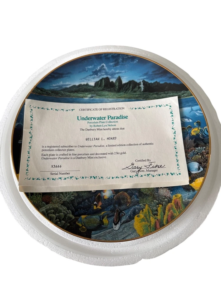 This exquisite porcelain plate features the stunning artwork of Robert Lyn Nelson, capturing the serene beauty of marine life. Part of a limited edition, this collector's piece is a testament to craftsmanship and artistry. It's a timeless addition to any fine art collection. • Diameter: 10.5 inches • Material: 23K gold rim • Limited edition of 75 firings • For decorative use only • Includes certificate of authenticity Condition: Pre-Owned Like New Like new condition with certificates. NO Major damages "Power Selling Mom Consignment"