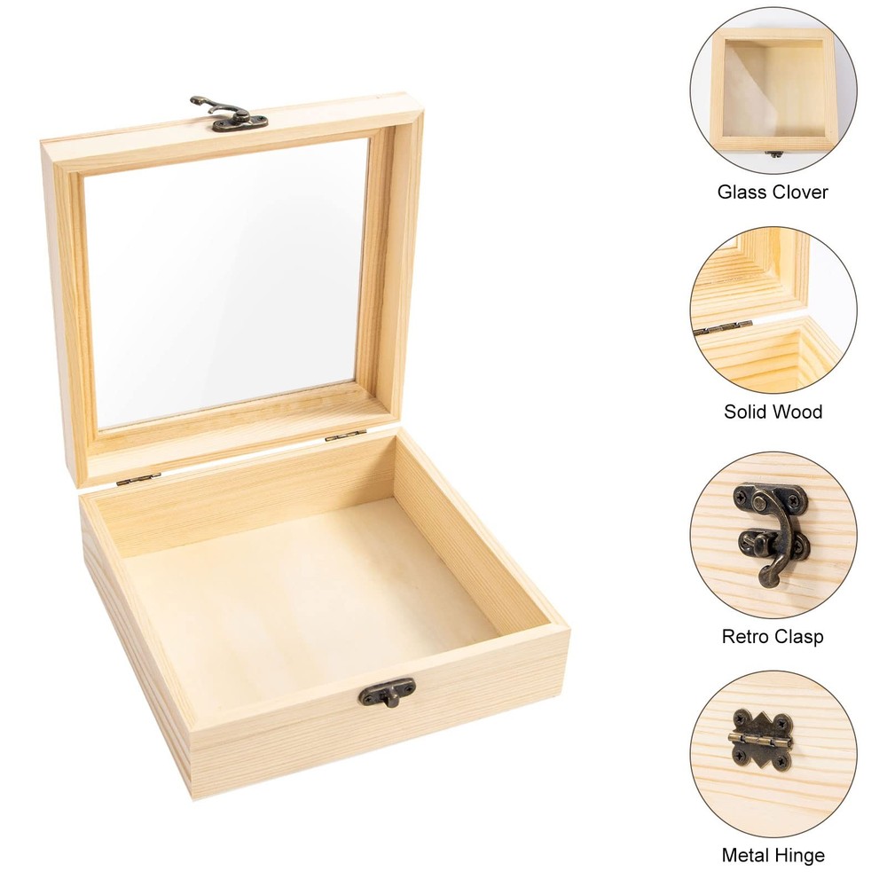 Our Unfinished Wooden boxes are available in different sizes to meet your daily storage, treasure display, home decoration, DIY handicraft and gift giving needs. With this box, what you can image is: convenient storage, artistic decoration, Jewelry showing, unique gift and pleasure feeling. Feature: Natural pine wood Clear glass top Metal clasp Jewelry and souvenir display Solid and durable Smooth and flat surface for crafts Special DIY gift Specifications: Material: Wood Color: Wood color Size: Approx. 7.2'' x 7.2'' x 2.9'' Package includes: 1 x Unfinished Wooden Display Box Solid Pine Wood: Our small wooden box is made of high-quality and durable natural pine wood, which is compact and sturdy with strong bearing capacity, not easy to crack and deform Wooden Display Case: This small storage box is ideal for storing earrings, rings, beads, pins, bracelets, necklaces, brooches, tiny souvenir etc. Glass Cover & Hinged Lid: This display box with clear glass top is not only for storage but also for display jewelry, which will display your jewelry like a piece of art; Hinged Lid with special metal style design that is convenient to open & close and rustic beauty Wood Boxes for Crafts: The surface of the unfinished wooden box is smooth and flat, you can paint, carve, decorate, stain or engrave on it. The box is the place where realize your wild imagination,Due to handmade and hand measurement, please allow 0.4-1 inches error. DIY Special Gift: You can make a unique wood gift box for your family and friends like father's day, birthday, wedding anniversary, graduation, Valentine's Day. Glass cover design will shine your unique love