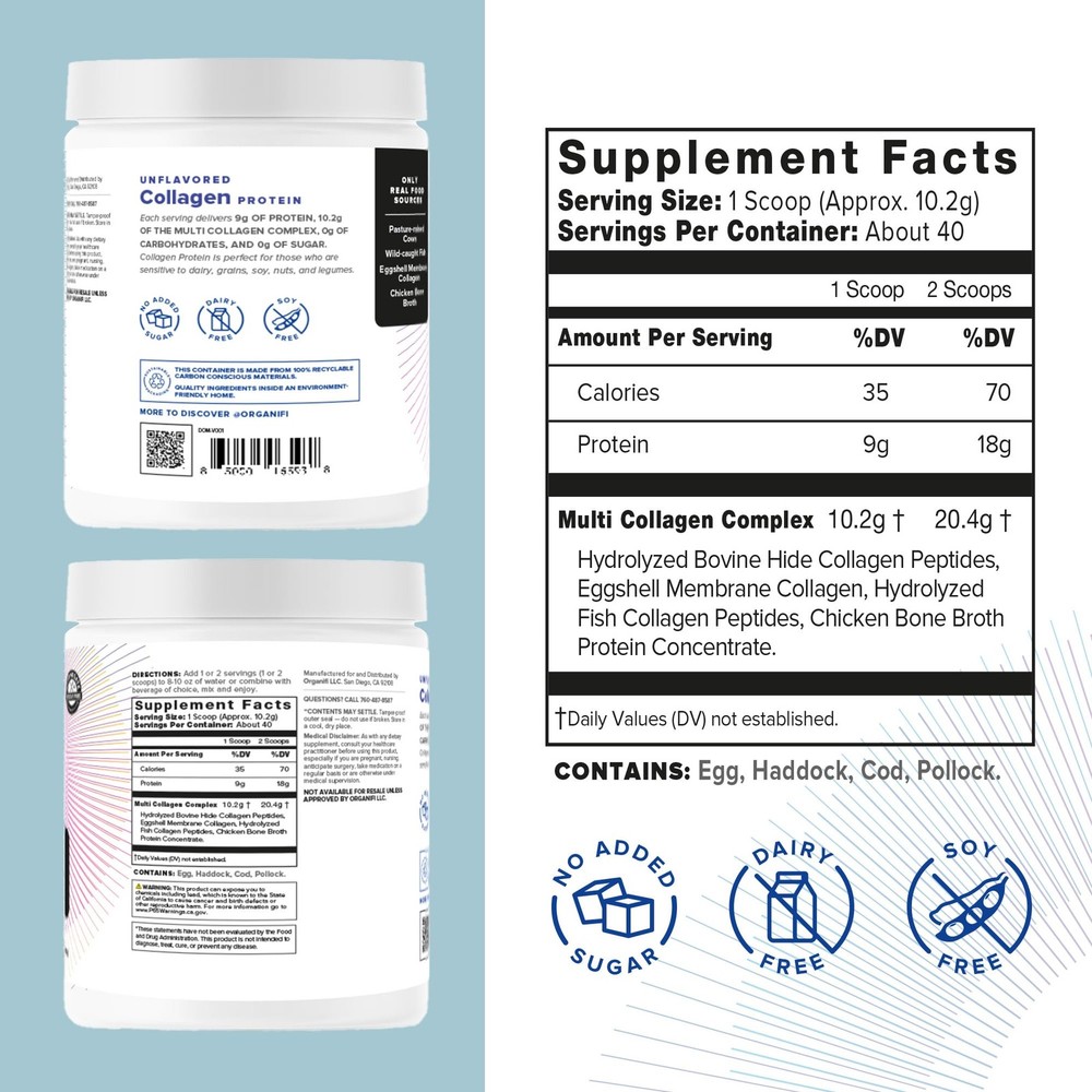 Collagen is a premium supplement enriched with hydrolyzed collagen peptides that offers whole-body replenishment. With a blend of multiple collagen peptides, Collagen has hair, skin, nails, digestion, and more total-body health benefits. Choose Collagen for a premium collagen supplement that goes beyond traditional expectations. Elevate your health journey with our collagen supplements, meticulously crafted to promote vitality and radiance. Experience the difference today! The Science Behind High-Quality Collagen Peptides Powder: At around 30 years old, our collagen fragments and fibroblast function lose steam, leading to decreased collagen production. Collagen's 19 different essential and nonessential amino acids, the building blocks of protein, can counter this. After the body breaks down these amino acids, it distributes them throughout the body for multiple health benefits. Radiant Skin, Stronger Nails, and Fuller Hair: Helping replenish and rebuild the body's most abundant protein is how Collagen supports skin health and promotes nail and hair growth. Collagen creates the infrastructure for elastin and hyaluronic acid, which are responsible for skin's elasticity and hydration, and repairs broken down skin fibers, or cellulite. Consuming high-quality collagen helps feed your hair nutrients to keep it thick and shiny. Collagen Helps You Glow: Adding collagen protein powder to your daily regimen can reduce fine lines and wrinkles, especially when you pair it with Glow. Glow, 's natural collagen support supplement, has 12 plant-based superfoods to promote natural collagen creation in the body. Together, Collagen and Glow can help you maximize collagen's benefits, including prolonging your youthful appearance. 5 Collagen Types, 4 Real Food Ingredients: Hydrolyzed bovine hide collagen peptides, eggshell membrane collagen, hydrolyzed fish collagen peptides, and chicken bone broth protein concentrate are Collagen's 4 real food ingredients. Combined, they offer 5 types of collagen: Types I, II, III, V, and X. Contributing to the World We Live In: ’s top-quality blends are shared across the globe. We started with a simple idea to make nutrition easy and delicious for everyone. This turned into a mission to unite the world through community, wholeness, and habit transformation.