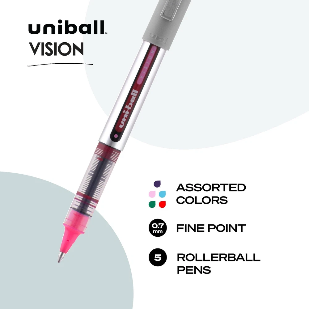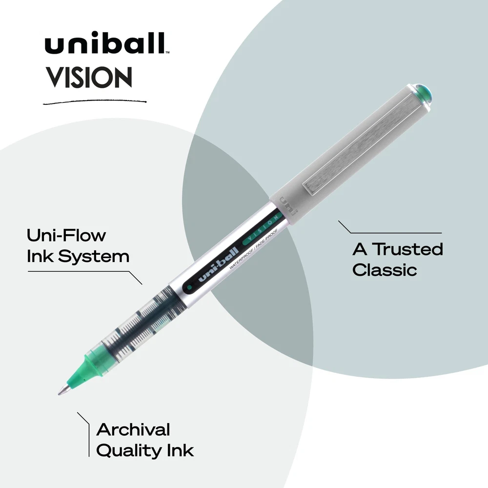 Product Description Step into a world of timeless elegance and unparalleled craftsmanship with Uniball, a brand that has woven its legacy into the fabric of fine writing instruments. With a heritage rooted in innovation and a commitment to excellence, Uniball has consistently delivered a writing experience that stands the test of time. Immerse yourself in the art of writing with Uniball's meticulously crafted pens, proudly made in Japan. Our legacy of precision and quality is evident in every stroke, ensuring that your thoughts flow seamlessly onto paper with each movement of the pen. From Gel Pens to Rollerball Pens, Ballpoint Pens to Fineliner Pens, and Mechanical Pencils, Uniball offers a comprehensive range that caters to every writing style and preference. Dive into a world of versatility with Uniball's diverse range of tip sizes, spanning from the ultra-micro 0.38 for intricate detailing, to the bold 1.0 for striking emphasis. Whether you're sketching, journaling, note-taking, or bringing ideas to life, Uniball empowers you to effortlessly transition between strokes, giving your writing a unique dimension that captivates the eye and stirs the soul. As you hold a Uniball pen in your hand, you're not just embracing a writing instrument – you're embracing a legacy of craftsmanship, innovation, and the pursuit of perfection. Each pen is a testament to our dedication to providing you with an unmatched writing experience, where every word is an ode to the art of communication. Start your story with Uniball, where heritage meets modernity, and each stroke is an invitation to immerse yourself in a world of boundless expression. Join a community of discerning individuals who appreciate the value of quality, heritage, and the power of the written word. Experience the magic of Uniball for yourself and discover the joy of writing that transcends time and leaves an indelible mark on every page. From the Manufacturer Vision Rollerball Pen features an innovative system that regulates a steady flow of waterproof ink to the point for consistent smoothness and color intensity. Uni Super Ink helps prevent check and document fraud. Solid, stainless steel point is quiet, responsive and won"t bend under pressure. Uncapped pen offers a visible ink supply. Ink is acid-free, fade-resistant and water-resistant. Nonrefillable. ROLLERBALL PEN: Capture the details with the superior precision of our roller ball pens; Our fine-point ink pens come filled with vibrant, smooth-flowing ink that won't fade. UNI FLOW INK SYSTEM: Equipped with an exclusive ink system, our fine-point pen delivers smooth-flowing pen ink, allowing you to create concise, flawless documents with vibrant lines. UNI SUPER INK: Water- and fade-resistant ink helps you compose long-lasting, high-quality documents you can archive; Our pens offer protection against water, fading, and fraud for both personal writing and professional writing. QUALITY CONSTRUCTION: Equipped with a visible ink window, our writing pens ensure you don't run out unexpectedly; Convenient clip attached to the writing pen ensures that your favorite ink pen is always at hand. VISIONARY PERFORMANCE: Designed for everyday use, our fine-tip color pens combine solid writing, vivid lines, and a classic look enhanced with colorful accents.