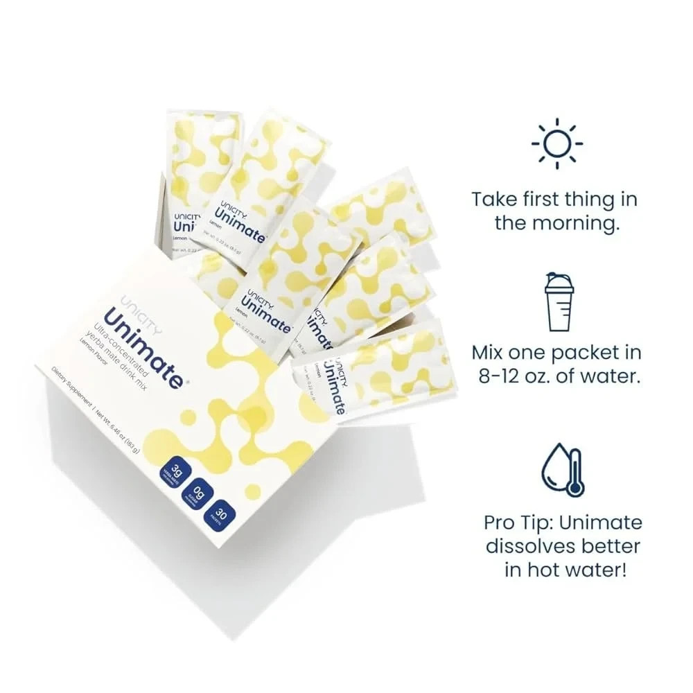 Unicity Feel Great Combo Pack - Orange Balance (1 Box) & Natural Lemon Unimate KEY FEATURES: Includes 2 boxes: 1 Orange Balance + 1 Lemon Unimate Each box contains 30 easy-to-use single-serve stick packs Naturally flavored drink mixes—zesty orange and refreshing lemon Just add to water—mixes smoothly in seconds Convenient for daily routines, work, or travel Lightweight, portable packaging for on-the-go use Great for morning and afternoon hydration habits Manufactured in facilities that follow quality assurance standards