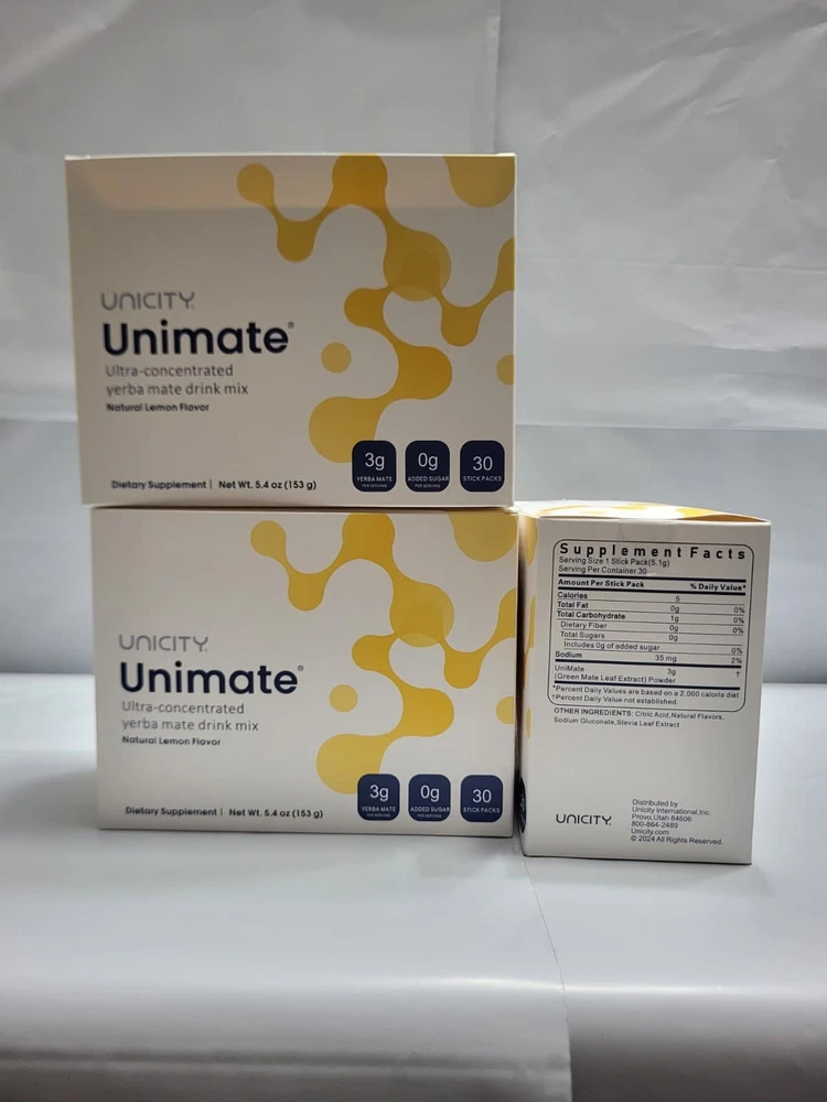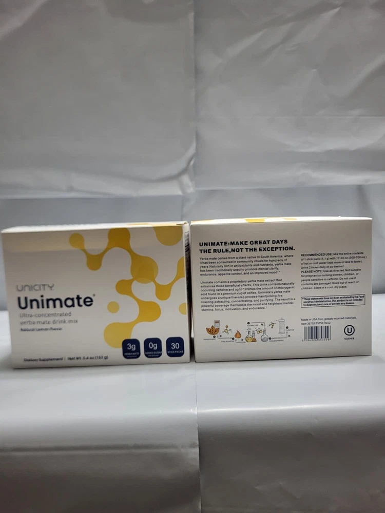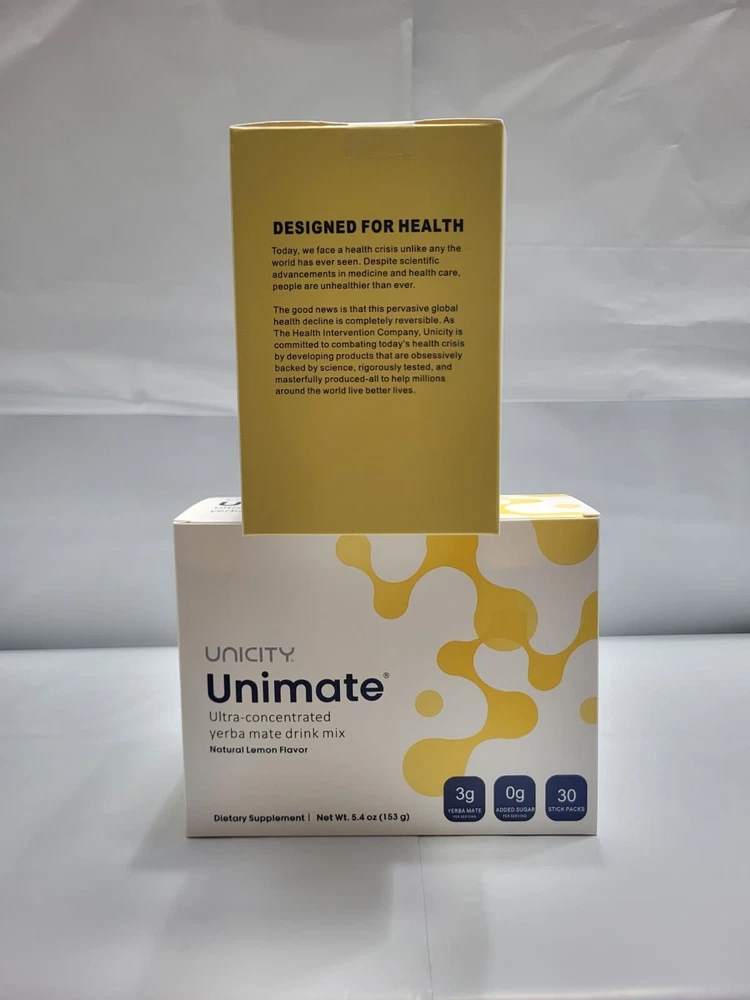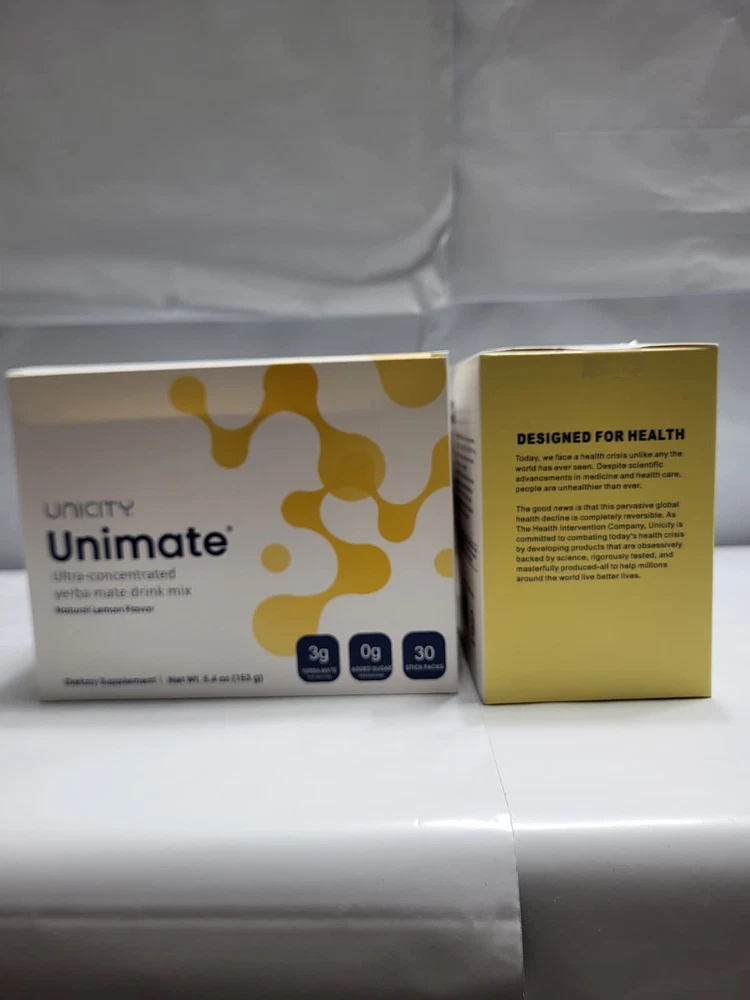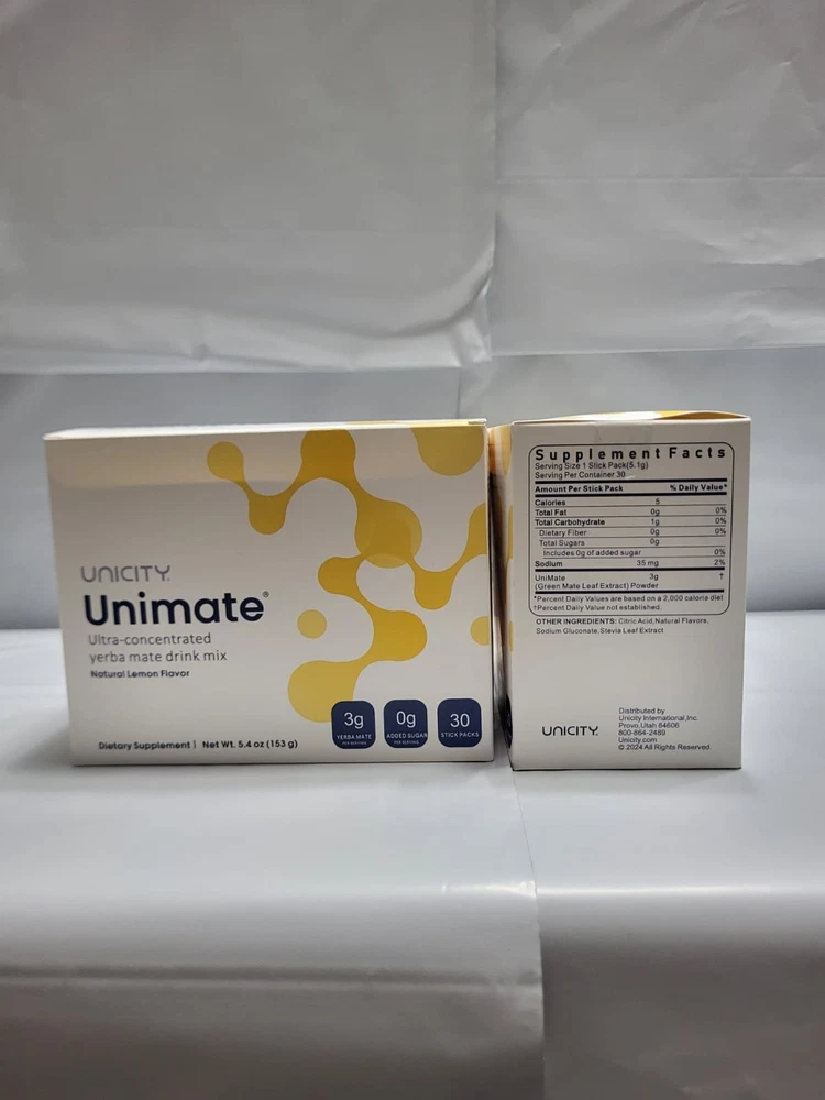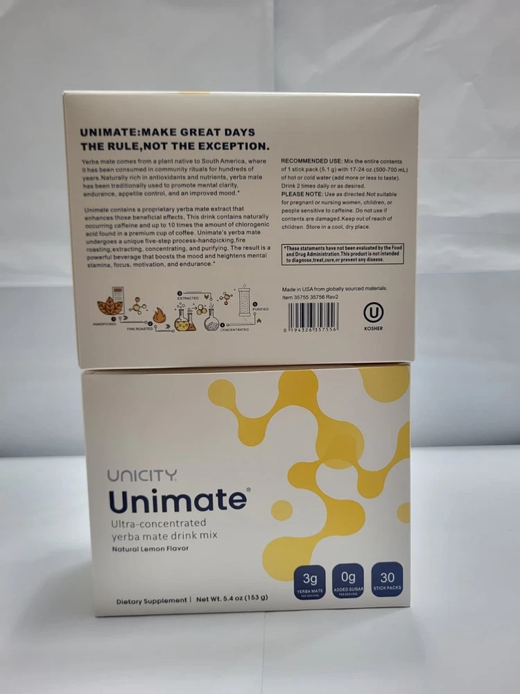NEW & SEALED Unicity Unimate Lemon Flavor Packs come in a 30-count box, offering a refreshing lemon taste in convenient single-serve packets. Designed for daily use, these easy-to-mix packs are perfect for on-the-go routines and long-term freshness. Customer satisfaction is our highest priority, and we are committed to providing only genuine, high-quality products that meet our strict standards before shipping.