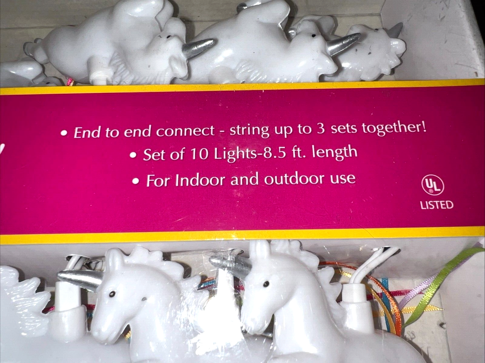 Bring some magic to your indoor and outdoor space with these "Unicorn" 10 String lights. The 8.5ft long string lights are perfect for creating a whimsical atmosphere for any occasion. The unicorn shape adds a touch of fun, and These DEI brand string lights are ideal for use in indoor and outdoor areas, making them perfect for parties, weddings, and other special events. The theme is unicorn. Whether you're looking to add some ambiance to your home or garden or simply want to bring some fun to your space, these string lights are the perfect choice.