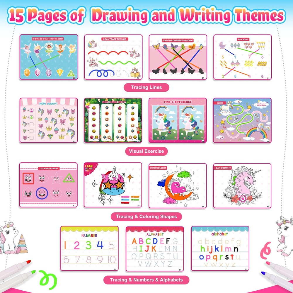 Features: NEWEST VERSIONMY UNICORN BUSY BOOK is the newest version of the busy book.Engaging illustrations, vivid velcro and fantastic doodle pages are some of the different elements that always attract children to learn new things. SUPER THEME BUNDLEWith 30 pages of high quality content, the busy book has a wide variety of learning topics and covers a wide range of knowledge.Not only can children learn about numbers, letters, colours and other knowledge represented in patterns, but they can also write and express themselves as they wish on the doodle pages. EDUCATIONAL TOYSThe bright colours of the busy book entice children to get their hands on it and complete it.This process will help to improve children's hand-eye coordination, creativity and imagination. SAFETY DESIGNThe material of the busy book is non-toxic and harmless, and the rounded corners are designed for the safety of children at all times.We have also included a storage bag for easy storage of the book and Velcro. IDEAL GIFTThe newest edition of the busy book has a very wide range of themes, vibrant colours and beautiful packaging.This would be a very good choice as a gift or toy for a child.Parents can build stronger bonds of communication with their children together.