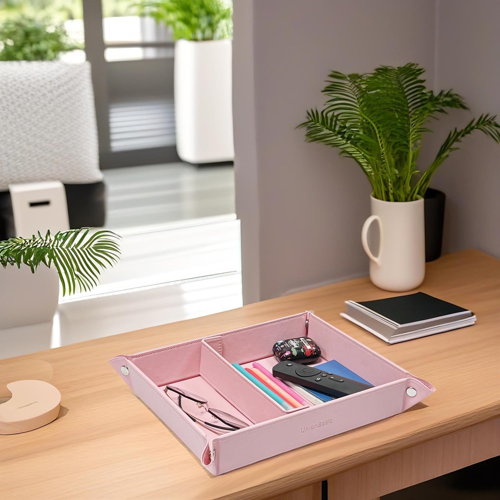 This valet tray is a stylish and practical must-have! The faux leather feels premium, and the stitched design adds a touch of elegance. Love how it keeps my jewelry, keys, and phone organized—plus, the snap corners make folding and storing a breeze. The candy pink color is adorable, and it’s so easy to clean with just a quick wipe. Perfect size for daily essentials!