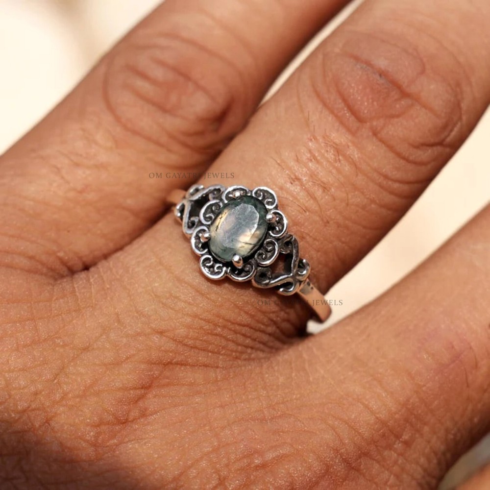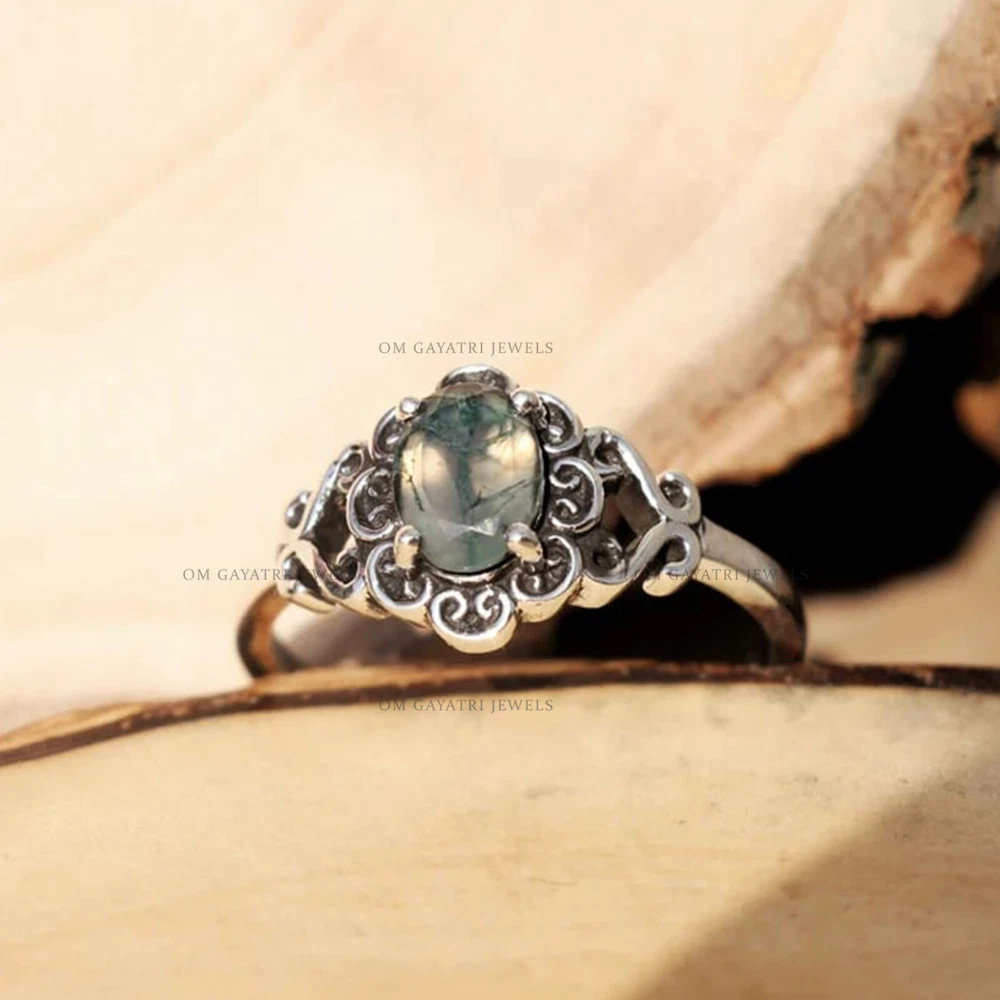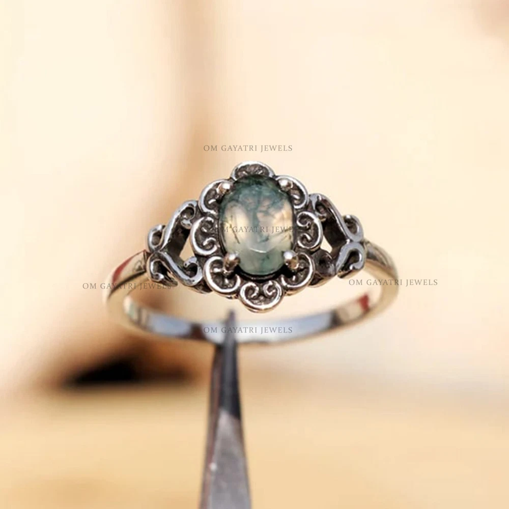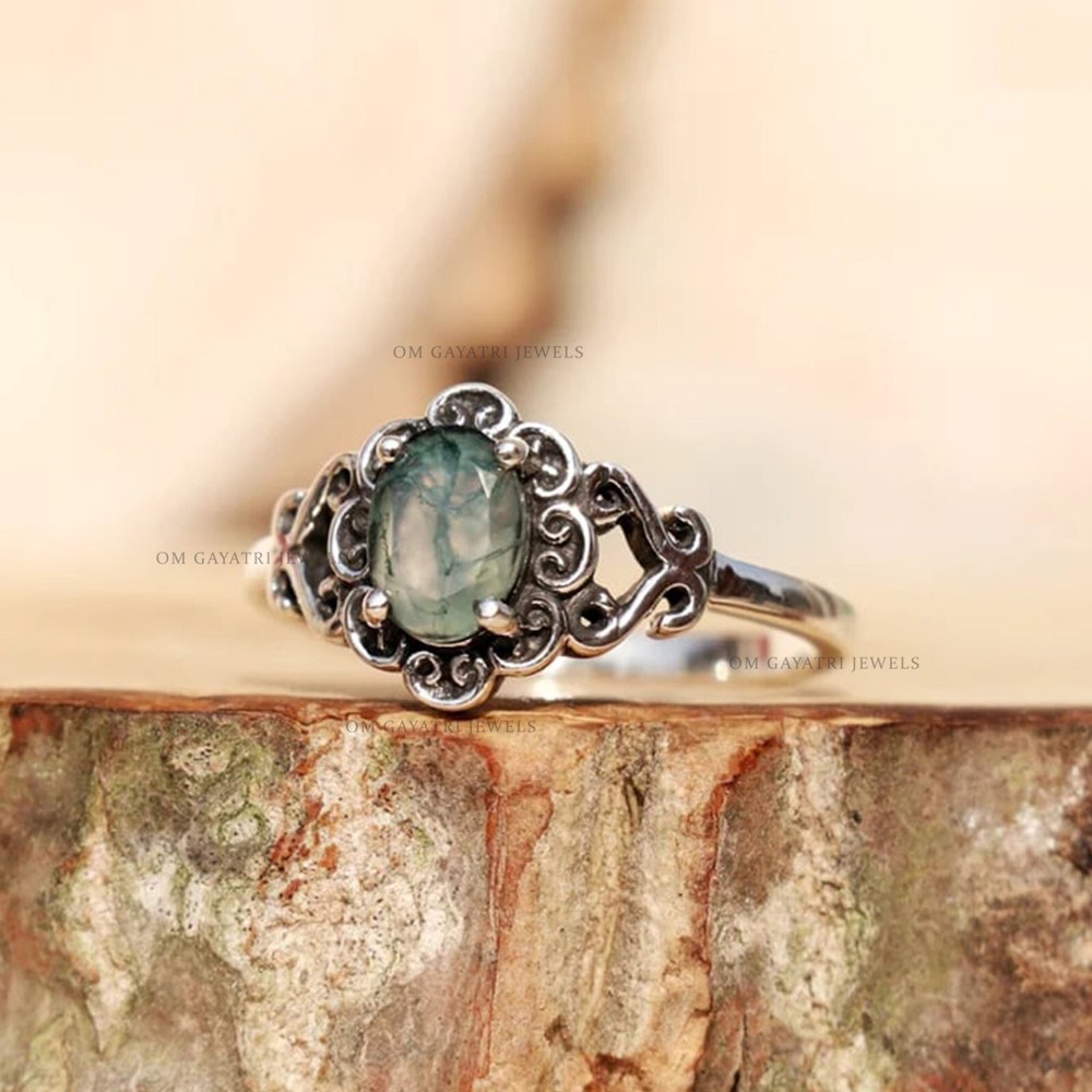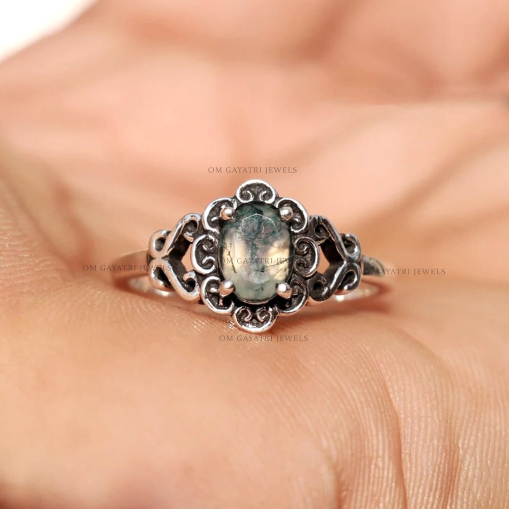This unique handmade ring features a beautiful oval-shaped moss agate gemstone, set in 925 sterling silver. The ring is stackable and has a bezel setting style, with a band width of 2mm. The main stone measures 6mm in width and 8mm in length, with a depth of 2.5mm. The ring is perfect for any occasion, whether it be for engagement, Christmas, wedding, anniversary, birthday, or Valentine's Day. The vintage-inspired design and art deco era make it a one-of-a-kind piece. It is signed by the seller and comes with a seller warranty. Make it a customized gift for someone special with this stunning moss agate gemstone ring. Unique Moss Agate Gemstone 925 Sterling Silver Handmade Ring 6x8mm Agate Ring Gemstone:- Moss Agate Stone Size:- 6x8mm Stone Shape:- Oval Stone Category:- Faceted Metal:- 925 Sterling Silver