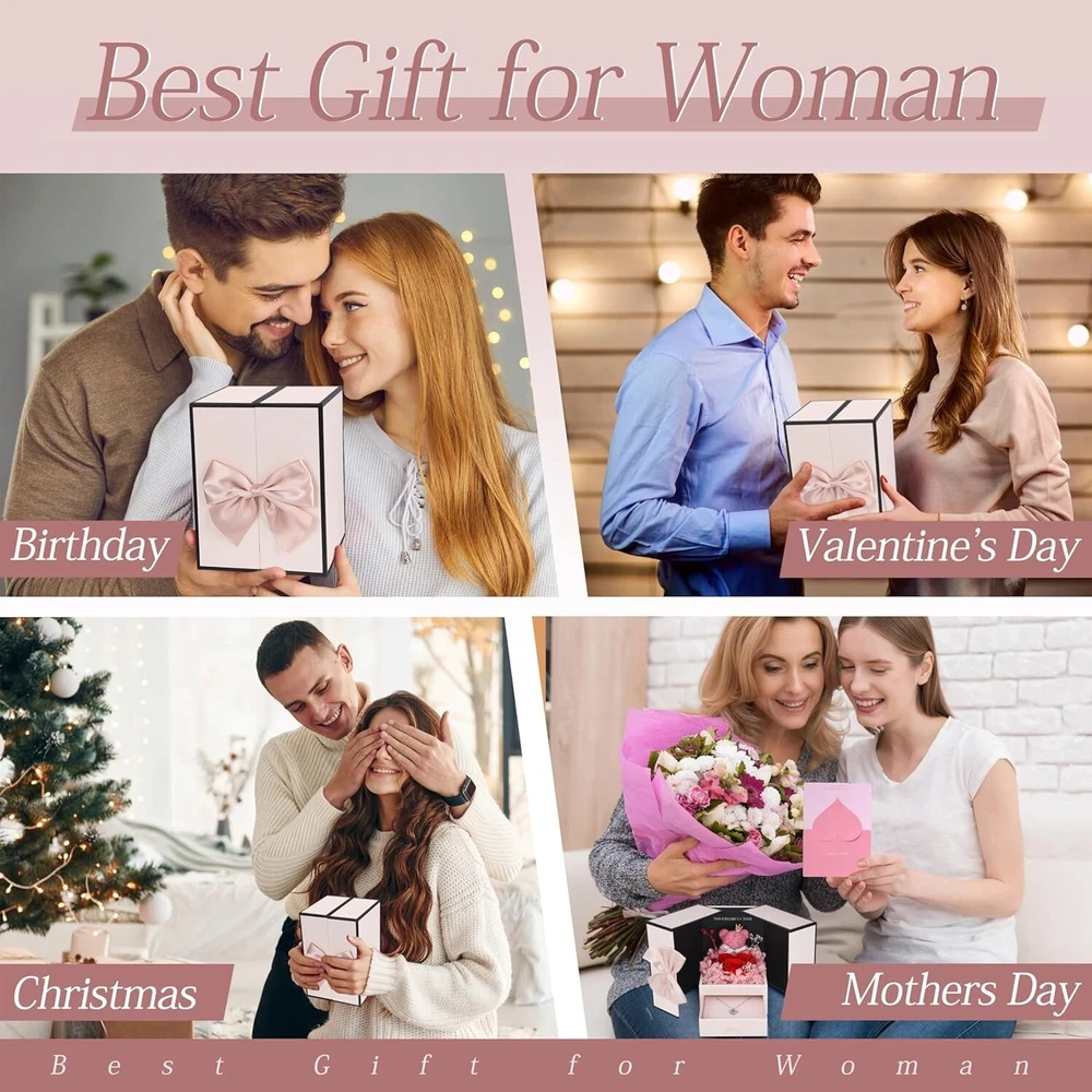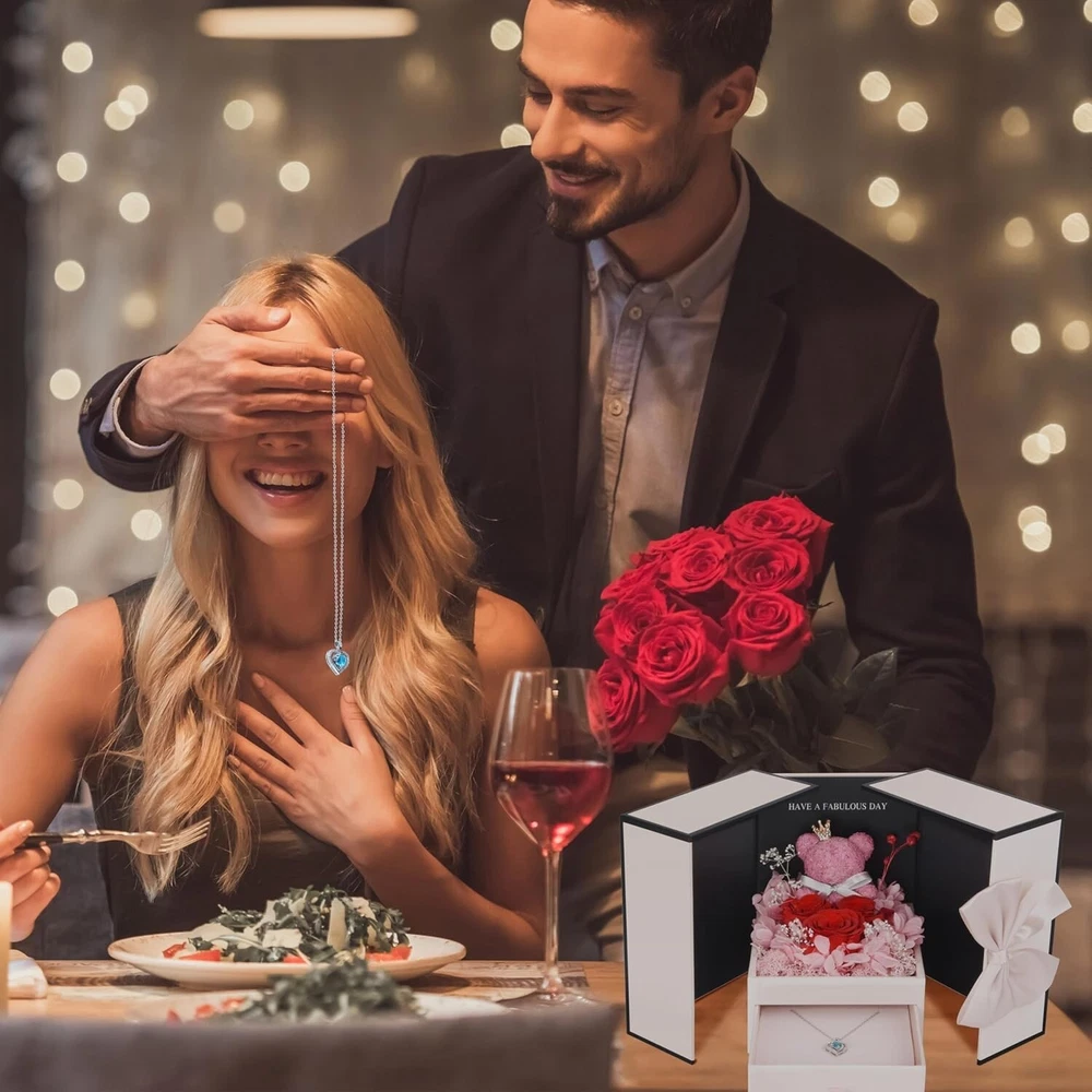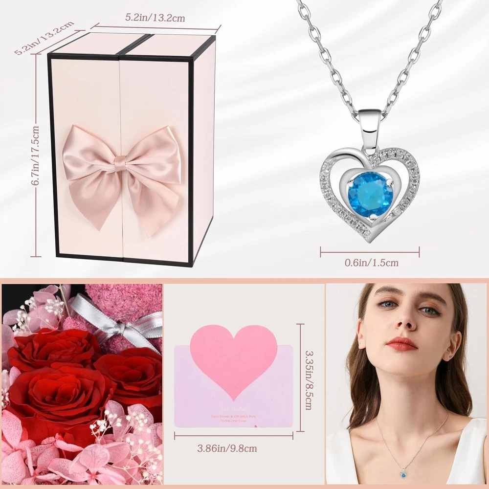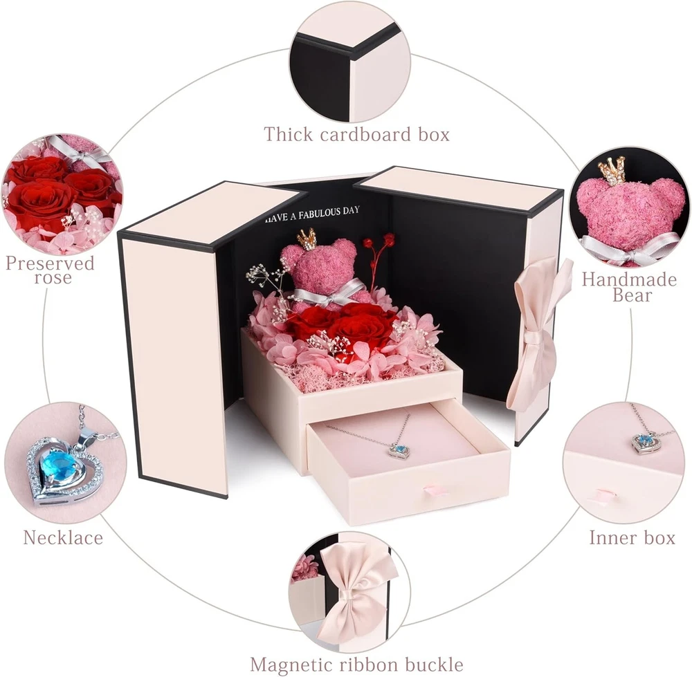 【Valentines Day Gifts for Her】The rose teddy bear gift box set contains a shiny necklace with sapphires. The deep blue and red roses represent the warm and deep feelings of each gift. It is a unique gift for girlfriends, wifes, and mothers. 【The Eternal Rose Symbolizes Everlasting Love】The rose bear flower is made of 3 red real roses through special craftsmanship. The romantic rose bear is surrounded by many petals, it is also handmade. The rose is processed by special craftsmanship. As long as it is stored normally, it can be kept for 3-5 years! 【With Sapphire Necklace】The sapphire necklace is stored at the bottom of the jewelry box. The shining blue diamond will be a nice surprise. The chain is made of brass and has an adjustment buckle. It can be adjusted according to the favorite length and is suitable for most people to wear. 【Exquisite Packaging】The rose bear gift box is finely crafted and not easy to damage. There is no need to worry about this presents for mom being damaged during transportation. The hard box packaging can be perfectly delivered to every customer. 【Great Gift Idea】Whether it is Christmas, Mother's Day, Anniversary, Birthday, it will be a great gift for your female friends, sisters, mothers, family and lovers, and they will be very happy to receive the Rose Bear Gift with Sapphire Necklace. 【Tips】If the bow falls off when you receive the product, please don’t worry. It is a magnetic bow. Just put it back in the middle of the box to decorate it. We also provide greeting cards for writing, saving your time of buying greeting cards separately. I believe that this gift with handwritten blessings will be a unique surprise.