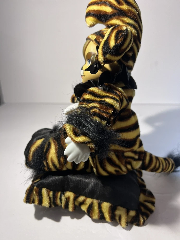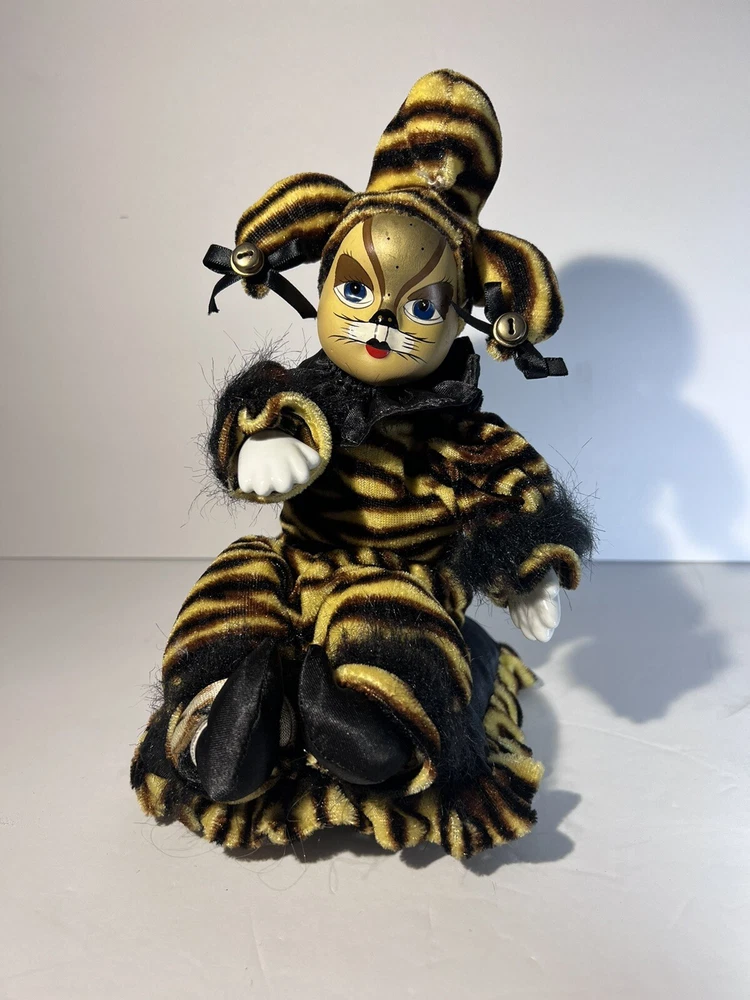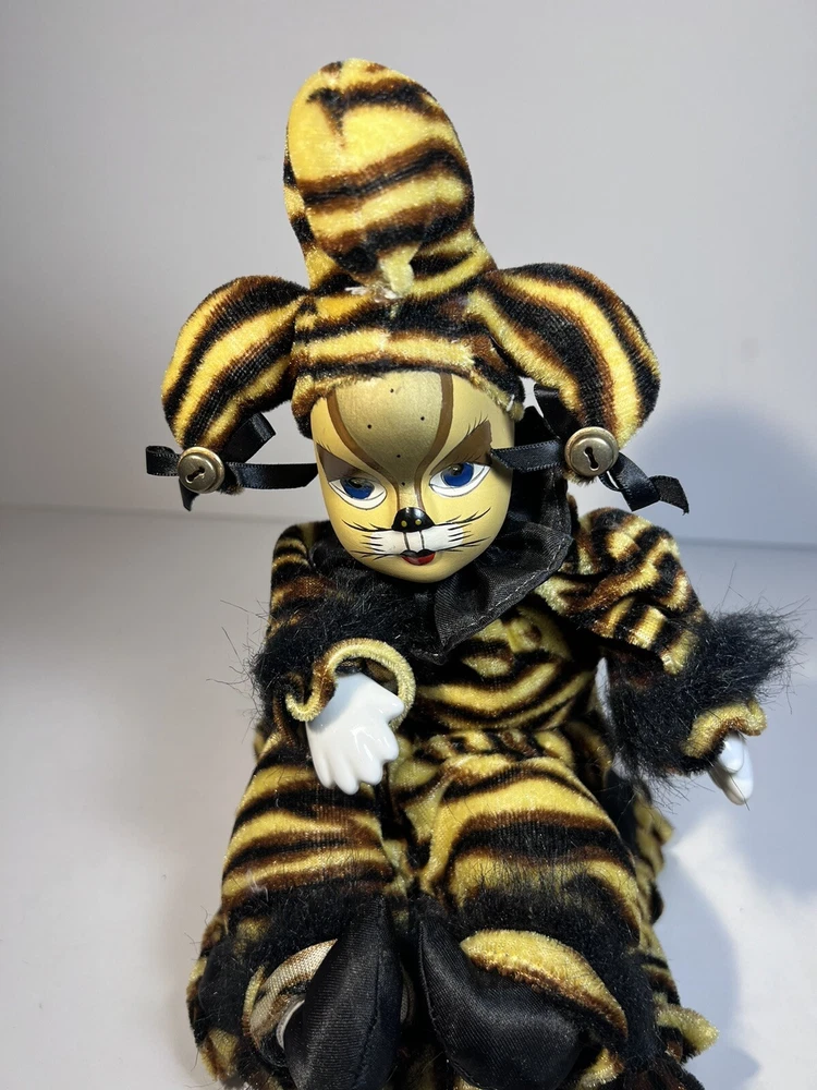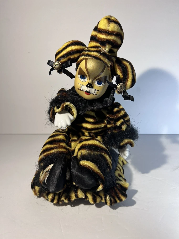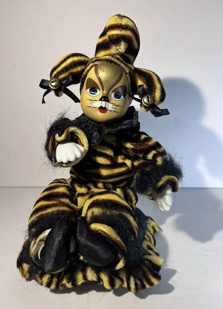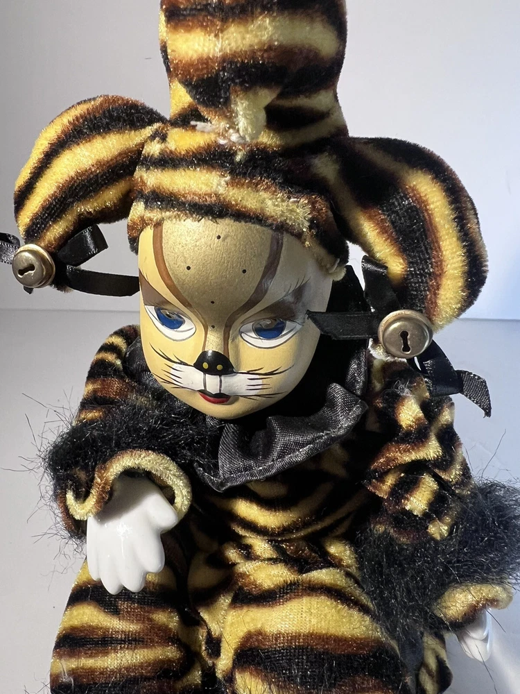 Unique Vintage Bengal Tiger Jester Cat 9” Doll Porcelain Face & Hands Musical. Working. Music plays. head moves