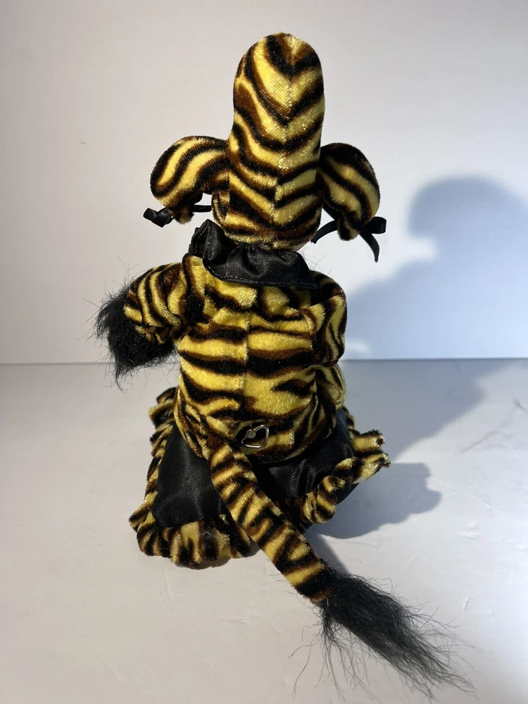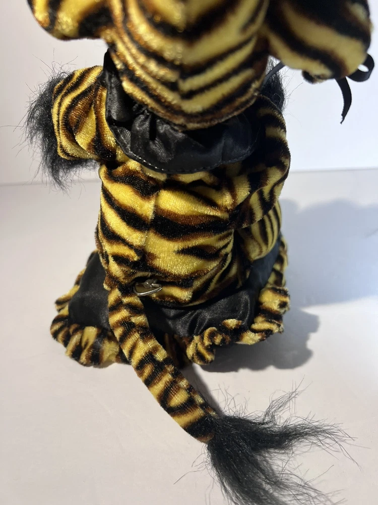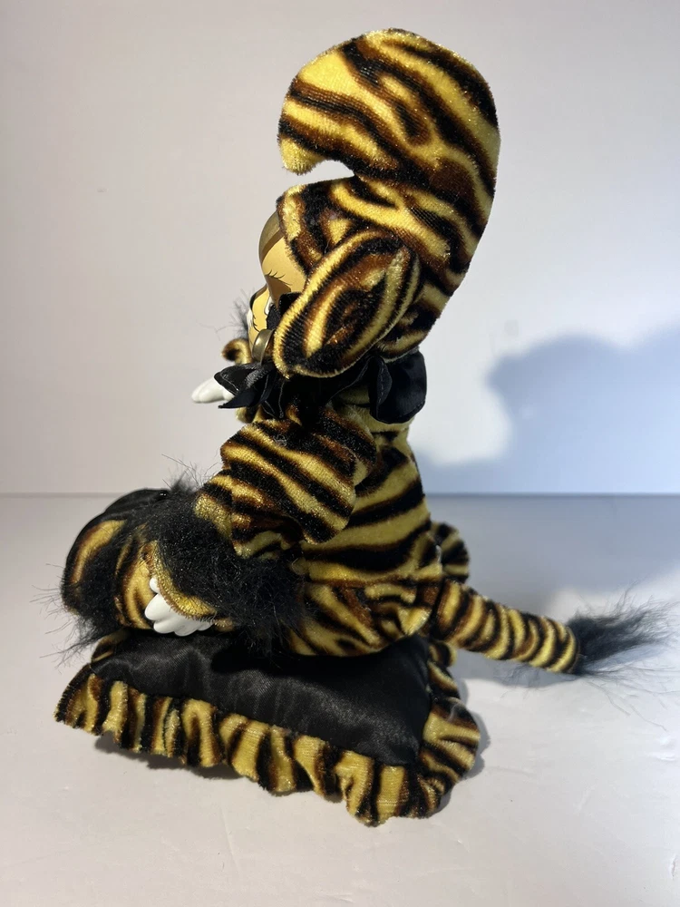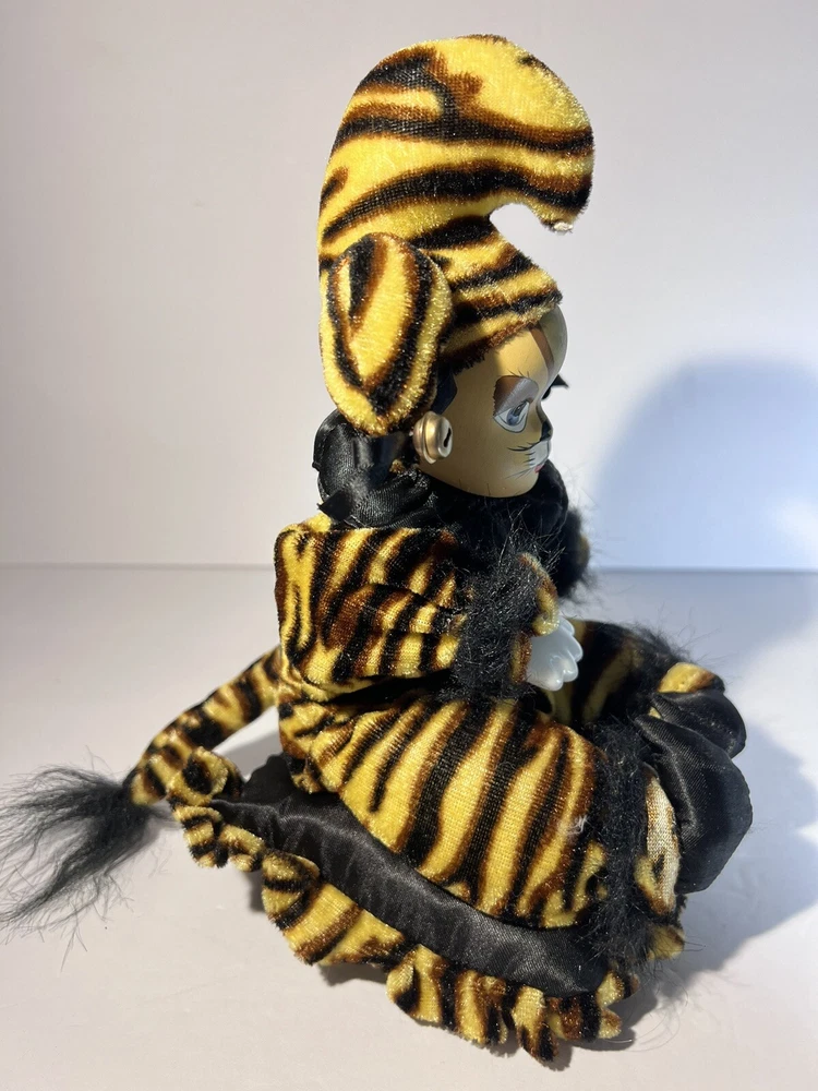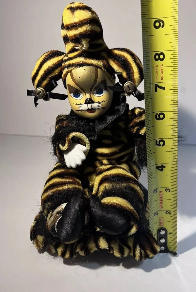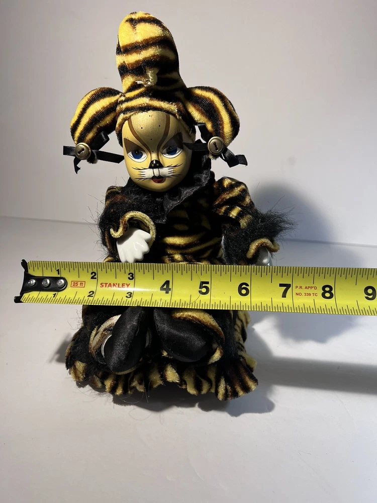 Unique Vintage Bengal Tiger Jester Cat 9” Doll Porcelain Face & Hands Musical. Working. Music plays. head moves
