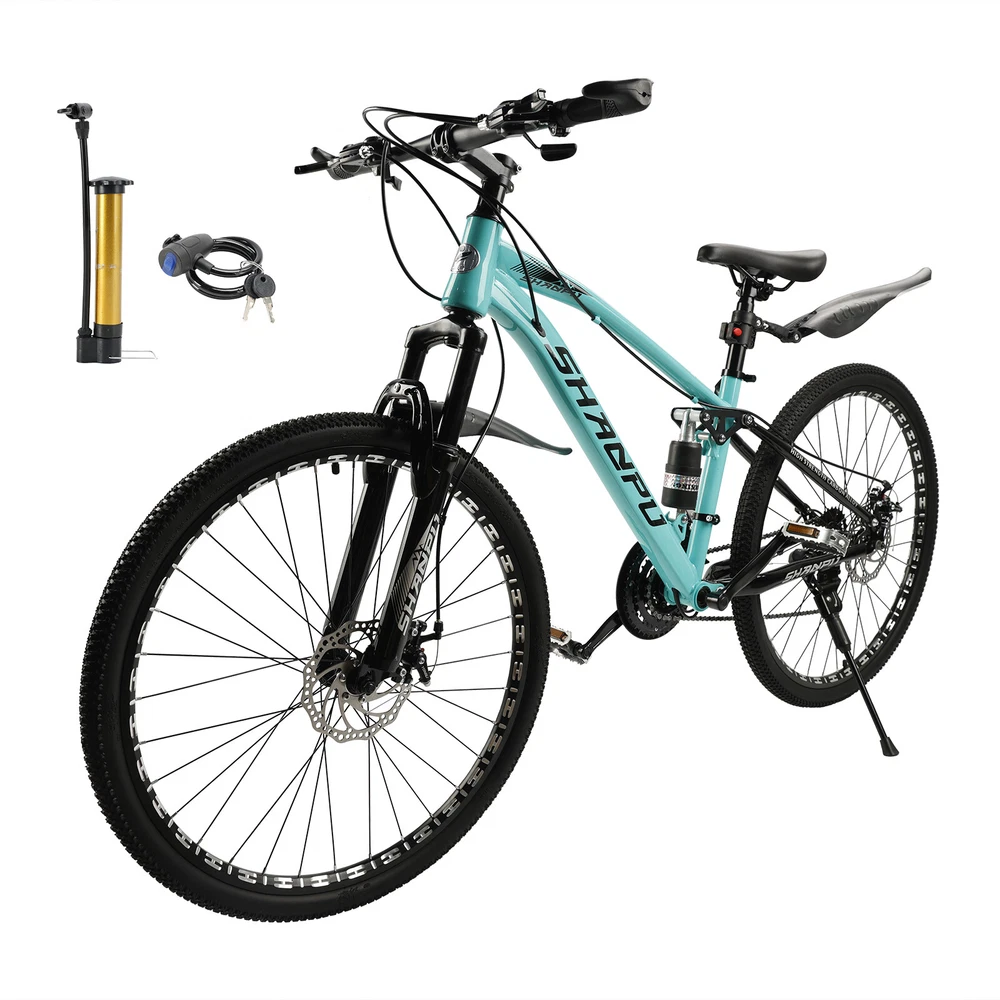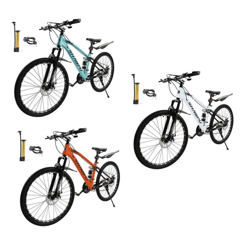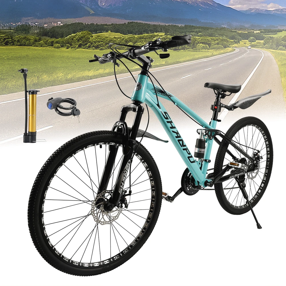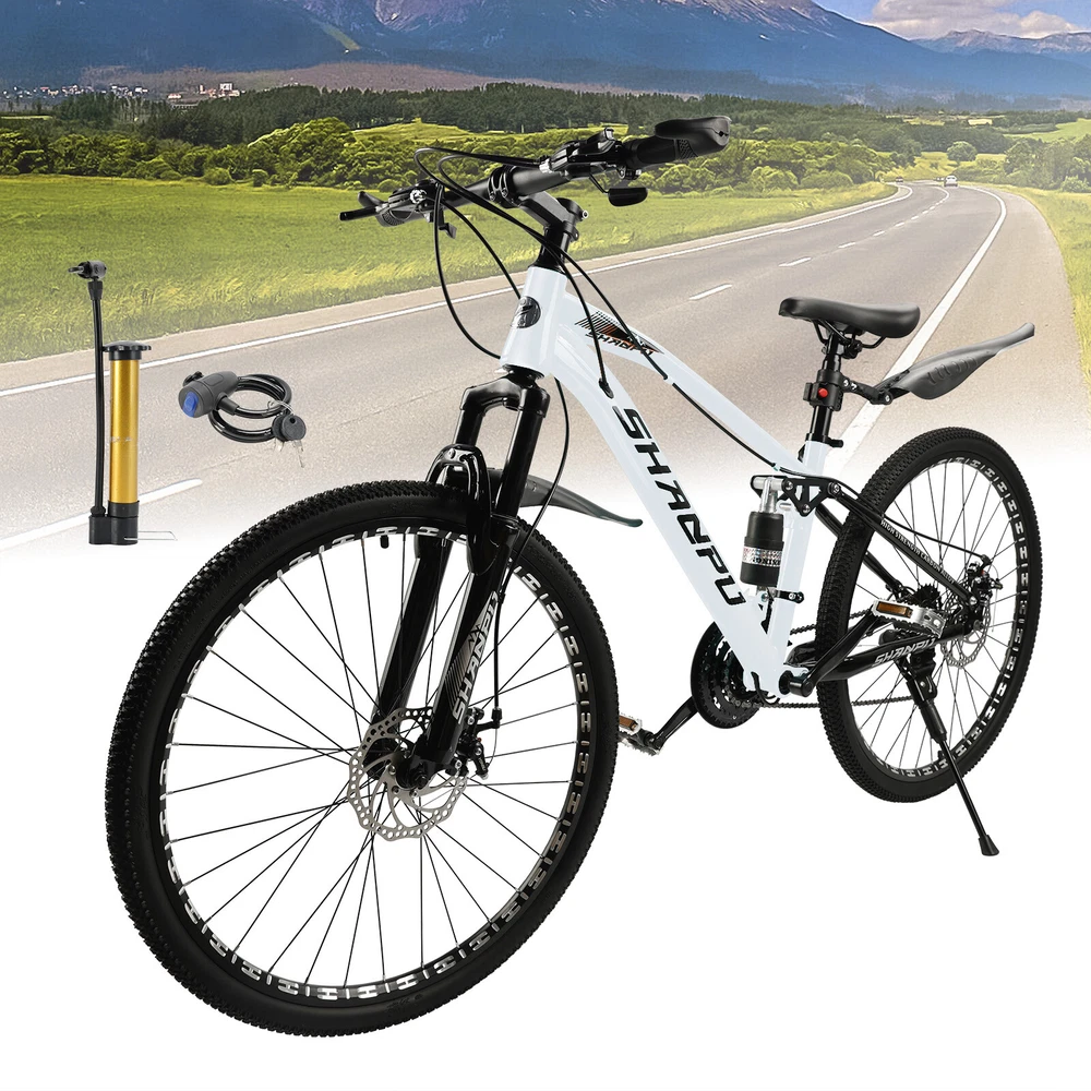 This mountain bike is an absolute game-changer! The 26-inch frame makes it super comfortable for both teens and adults, whether you're hitting trails or cruising through the city. The full suspension smooths out bumps effortlessly, and the disc brakes give reliable stopping power. Love that it comes mostly pre-assembled—setup was a breeze. Perfect for commuting, weekend adventures, or just staying active. The sleek design turns headsoric while being super functional. Definitely worth for anyone looking for a versatile, high-quality ride!