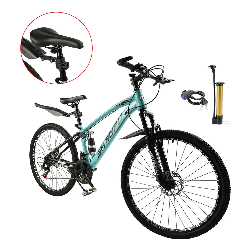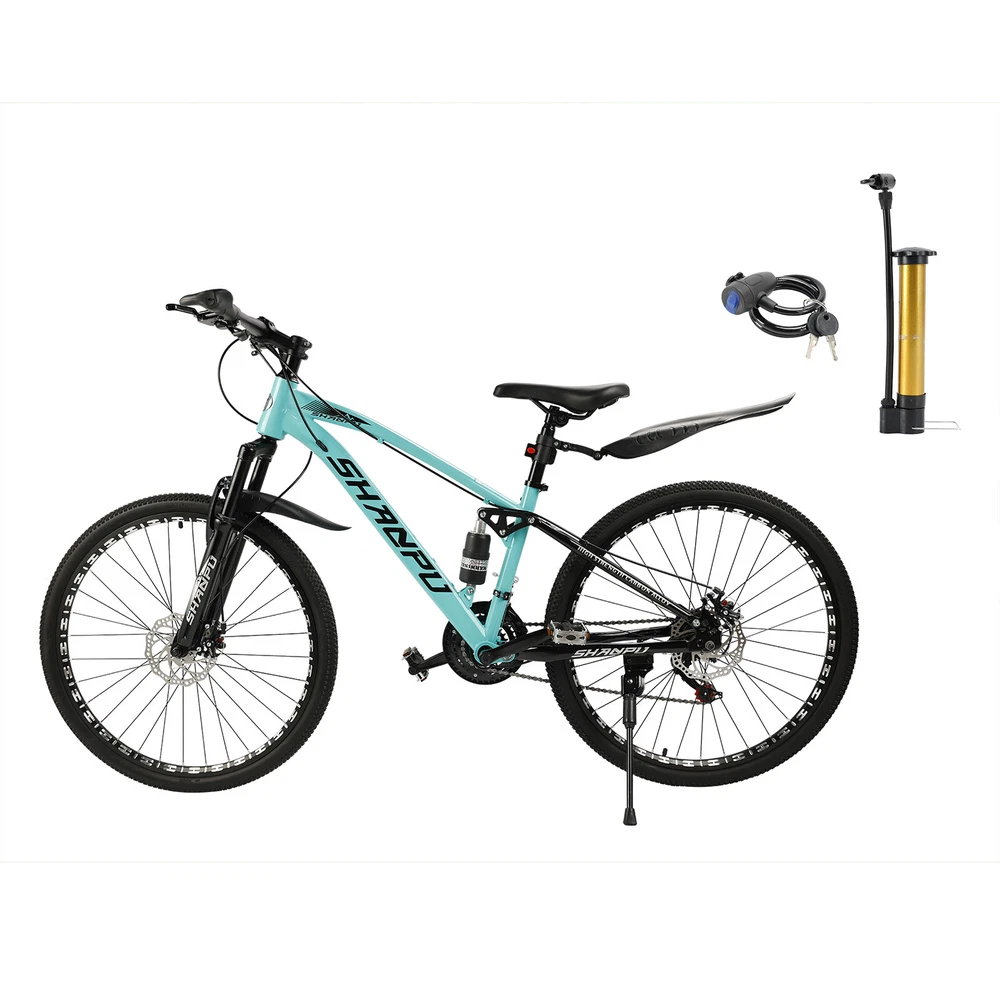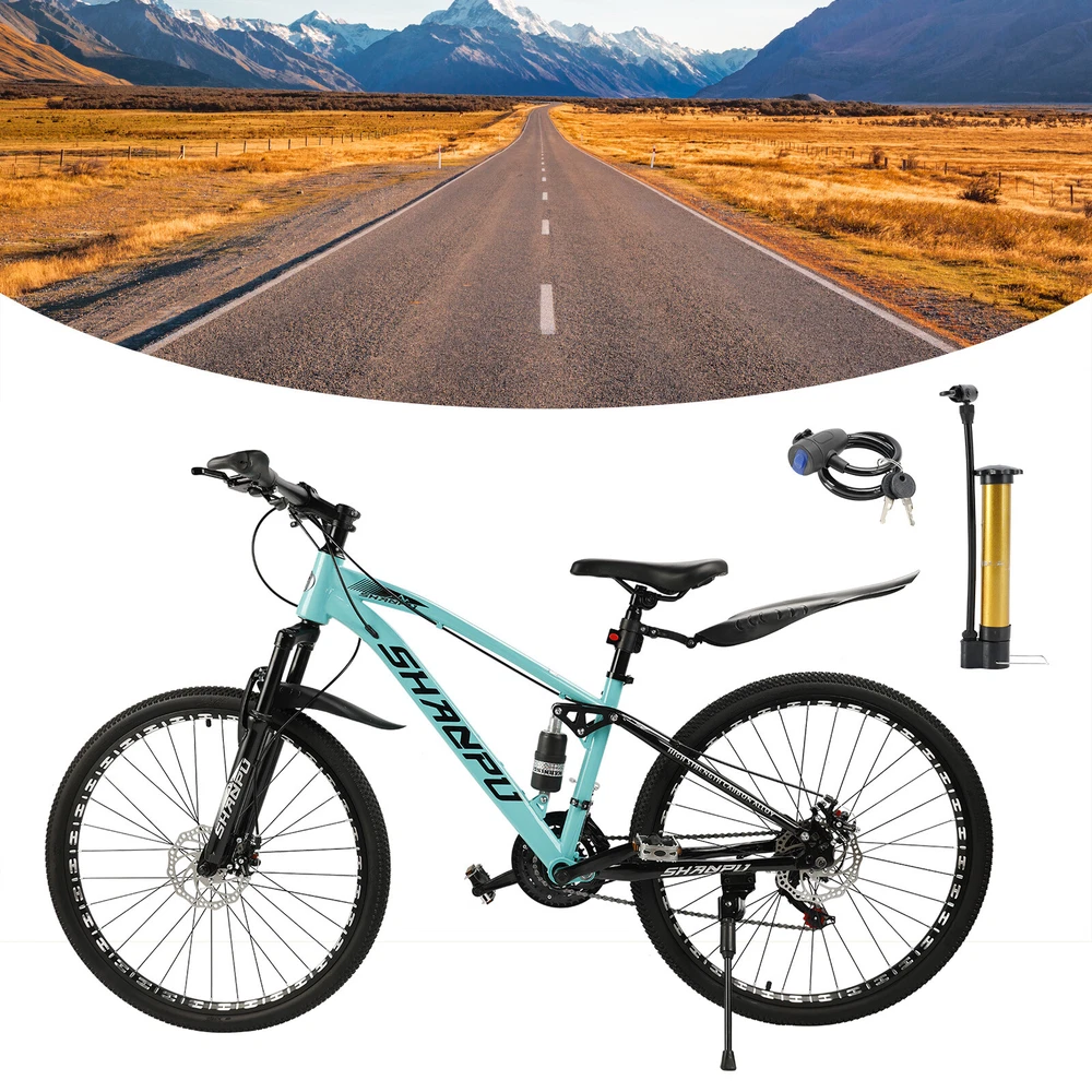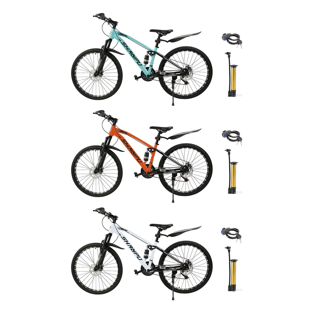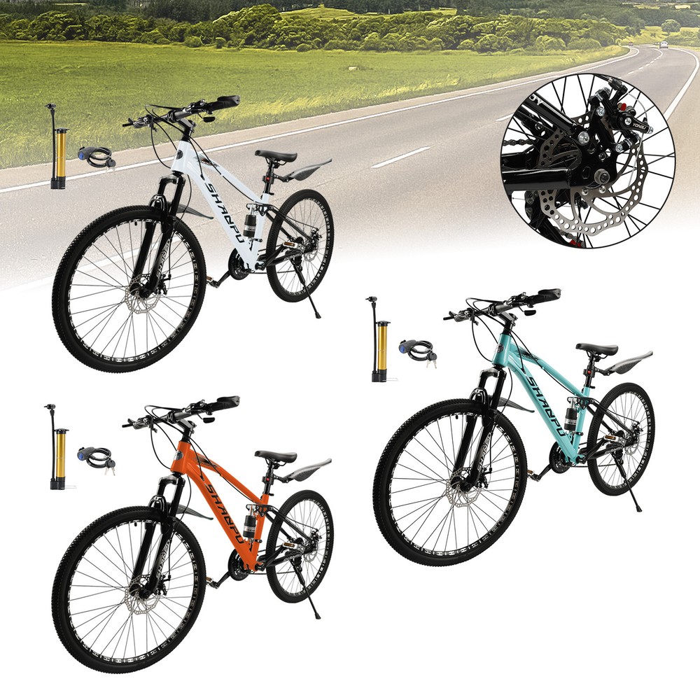 This mountain bike is an absolute game-changer! The 26-inch frame makes it super comfortable for both teens and adults, whether you're hitting trails or cruising through the city. The full suspension smooths out bumps effortlessly, and the disc brakes give reliable stopping power. Love that it comes mostly pre-assembled—setup was a breeze. Perfect for commuting, weekend adventures, or just staying active. The sleek design turns headsoric while being super functional. Definitely worth for anyone looking for a versatile, high-quality ride!