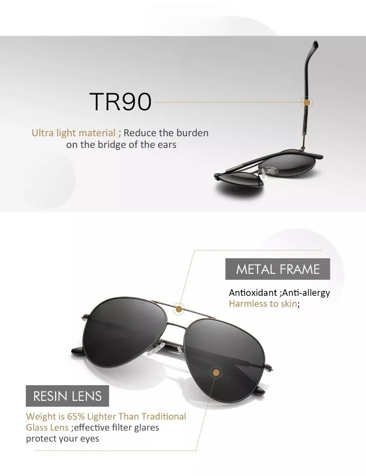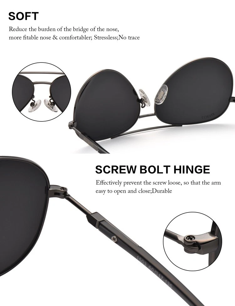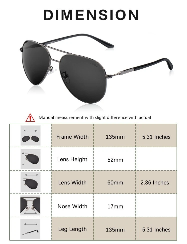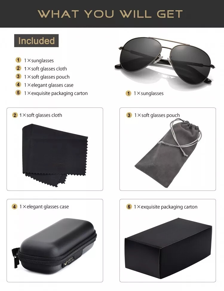 CARE: To avoid damage, never clean your Polarized Aviator Sunglasses with paper towels or clothing, and also avoid using household detergents or soaps. Fun fact: Don't keep any sunglasses in the car during the summer, as the heat will damage the lenses. 100% UVA/UVB Protection 100% Polarized lens that filter, balance and enhance the colors that our eyes naturally perceives and promise you a better clarity of [Natural Vision]. Light Weight High Quality Metal for Superior comfort wearing experience. POLARIZED LENS ▶ 100% UV400 eye protection effectively filter & block glares Designed for driving & outdoor activities High-definition lens gives you a natural & clear vision Durable & Shatterproof ANTIOXIDANT PLATING FRAME ▶ Antioxidant plating Anti-allergy & skin-friendly tested Harmless to skin LIGHT-WEIGHT ARM ▶ Light-weighted & elastic arm Stress-free wearing experience SKIN-FRIENDLY NOSE PADS ▶ Environmental & skin-friendly materials Enables you a long-time wearing without fatigue 100% SATISFACTION GUARANTEED ▶ First Choice as A Gift Unisex Aviator Style Good for Driving & All Out Door Activities for all Day Limited Time Special Pricing and Elegant Glasses Accessories for Free CONTACT US: For any problems during the transaction, e.g. you not receive the item on time, the item with issues, etc. Pls contact us first, we promise to give you a satisfactory solution, rather than leaving neutral or negative feedback without contacting. Many thanks!