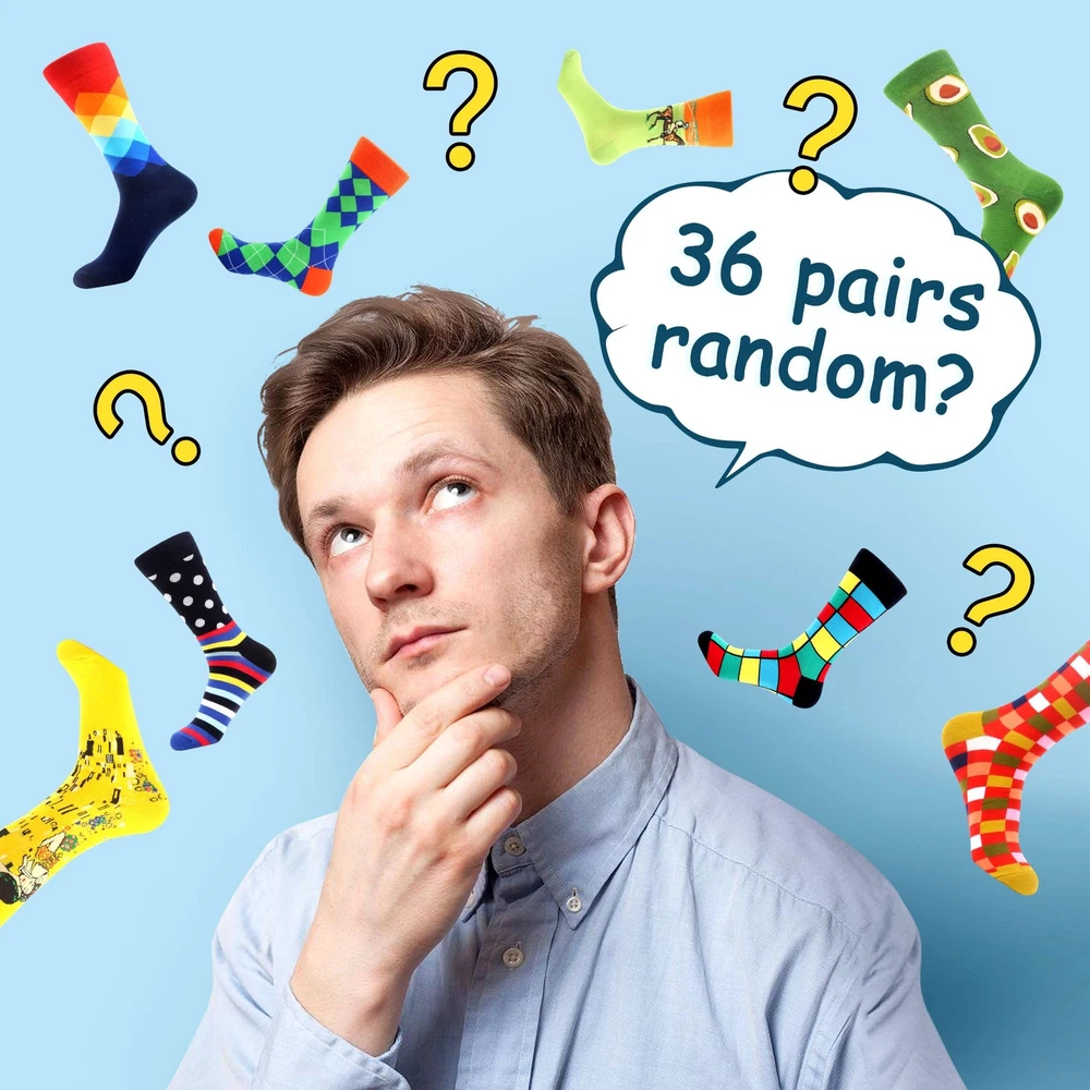 Why we need a pair of nice socks According to scientific statistics,in average,we need wear socks 8-10 hours a day at least.it's more closed with you than your family. So we need to change socks and wash it every day. have focused on socks for a long time. Each sock must pass through our strict inspection. The top thing we care is the quality,the composition and the pattern of the socks. We insist on developing high quality socks to satisfy our customers. About socks Material This item contains 80% Cotton,15% Nylon,5% Spandex. We use 200 Knitting Technology to make sure socks tight.in order to make socks feel soft, we use high quality combed cotton,it's different with other cottons.more soft. Colorful Fashion funny soft crew socks add more happiness to your life Soft and comfortable cotton fabric on your feet, accompany you around every corner, go on a trip with you and living your colorful life.We want to add joy and happiness to your colorful life by our products which can also display our enthusiasm and profession on these socks. Service Adheres to provide you the highest quality products and the best service with the most favorable price.If you didn't like our socks,we would like refund to you or sent an new item to you after you return to us. If you have any other questions,please feel free to contact us, we are glad to be at your service! ONE SIZE FITS MOST: Fits most men with US size 7-13 feet, and women size 8 and up Notice: We have hundreds of socks styles, you may receive styles other than the pictures. Due to the different sock patterns, the length of the style may be different by 1-3cm. 36 pairs of socks, different styles can be used by every member of the family to get favorite socks, Let's share these funny socks with your family. More Choice: our random socks suitable for men or women of all ages. Including various styles of socks, such as dress socks, Argyle, Geometric, Polka Dot, Striped, Plaid, Color Block etc. Great Idea for home decoration, donation or company share gift. Great choice for gift giving on Holiday like Christmas, Birthday, Thanksgiving, etc