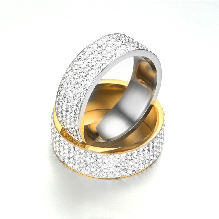 Men Women Stainless Steel Crystal Band Ring Gold Silver Wedding Band Ring Sz6-13 Condition: 100% Brand New and High Quality ! Material: Stainless Steel Color: Silver, Gold Size: 6,7,8,9,10,11,12,13 Width: 8mm Weight:5.6g Package Included: 1PCS Fashion Ring(OPP bag)