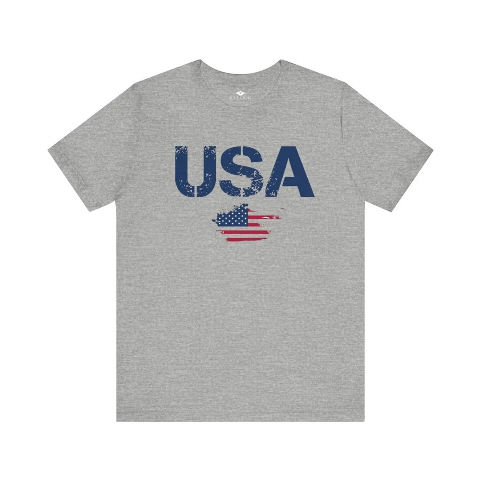Stay stylish and patriotic with our Unisex round neck slim fit short sleeve USA Flag Printed T-Shirt. Made with premium materials, this shirt boasts a comfortable and flattering fit for both men and women. Show your love for the USA in style. Overview: This classic unisex short sleeve tee fits like a well-loved favorite. Soft cotton and quality print make users fall in love with it over and over again. These t-shirts have-ribbed knit collars to bolster shaping. The shoulders are tapered for a better fit over time. Dual side seams hold the garment's shape for longer. Fabric: Made with 100% Airlume combed and ring-spun cotton, a lightweight fabric (4.2 oz/yd² (142 g/m²)) that is easy to layer, breathable. Perfect for active and leisure wear. Fit: The retail fit that is perfect for casual and semi-formal settings. The crew neckline adds a classic, neat style that's perfect for accessorizing. Origin ; manufactured in the US and internationally in humane, no-sweatshop, sustainable way. Fabric blends: Ash and Heather Prism colors - 99% Airlume combed and ring-spun cotton, 1% polyester; Heather and Solid Blend colors - 52% cotton, 48% polyester; Athletic Heather and Black Heather - 90% cotton, 10% polyester.