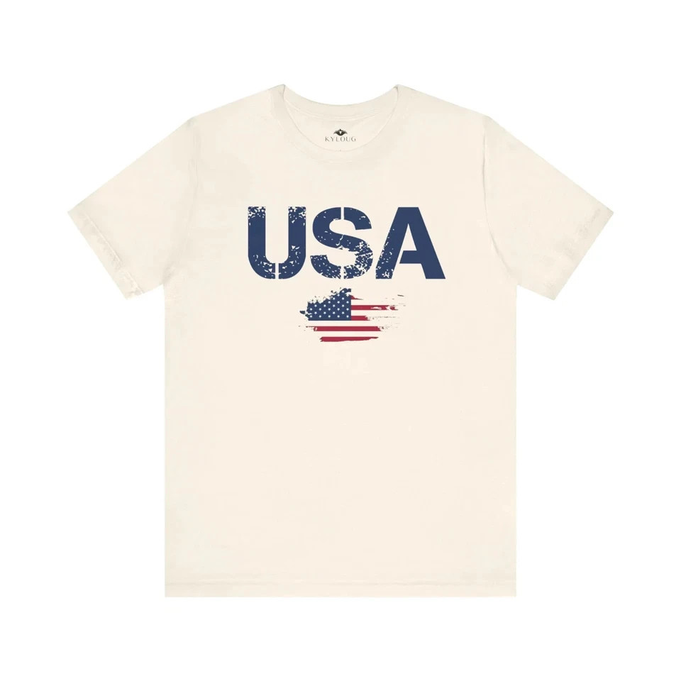 Stay stylish and patriotic with our Unisex round neck slim fit short sleeve USA Flag Printed T-Shirt. Made with premium materials, this shirt boasts a comfortable and flattering fit for both men and women. Show your love for the USA in style. Overview: This classic unisex short sleeve tee fits like a well-loved favorite. Soft cotton and quality print make users fall in love with it over and over again. These t-shirts have-ribbed knit collars to bolster shaping. The shoulders are tapered for a better fit over time. Dual side seams hold the garment's shape for longer. Fabric: Made with 100% Airlume combed and ring-spun cotton, a lightweight fabric (4.2 oz/yd² (142 g/m²)) that is easy to layer, breathable. Perfect for active and leisure wear. Fit: The retail fit that is perfect for casual and semi-formal settings. The crew neckline adds a classic, neat style that's perfect for accessorizing. Origin ; manufactured in the US and internationally in humane, no-sweatshop, sustainable way. Fabric blends: Ash and Heather Prism colors - 99% Airlume combed and ring-spun cotton, 1% polyester; Heather and Solid Blend colors - 52% cotton, 48% polyester; Athletic Heather and Black Heather - 90% cotton, 10% polyester.
