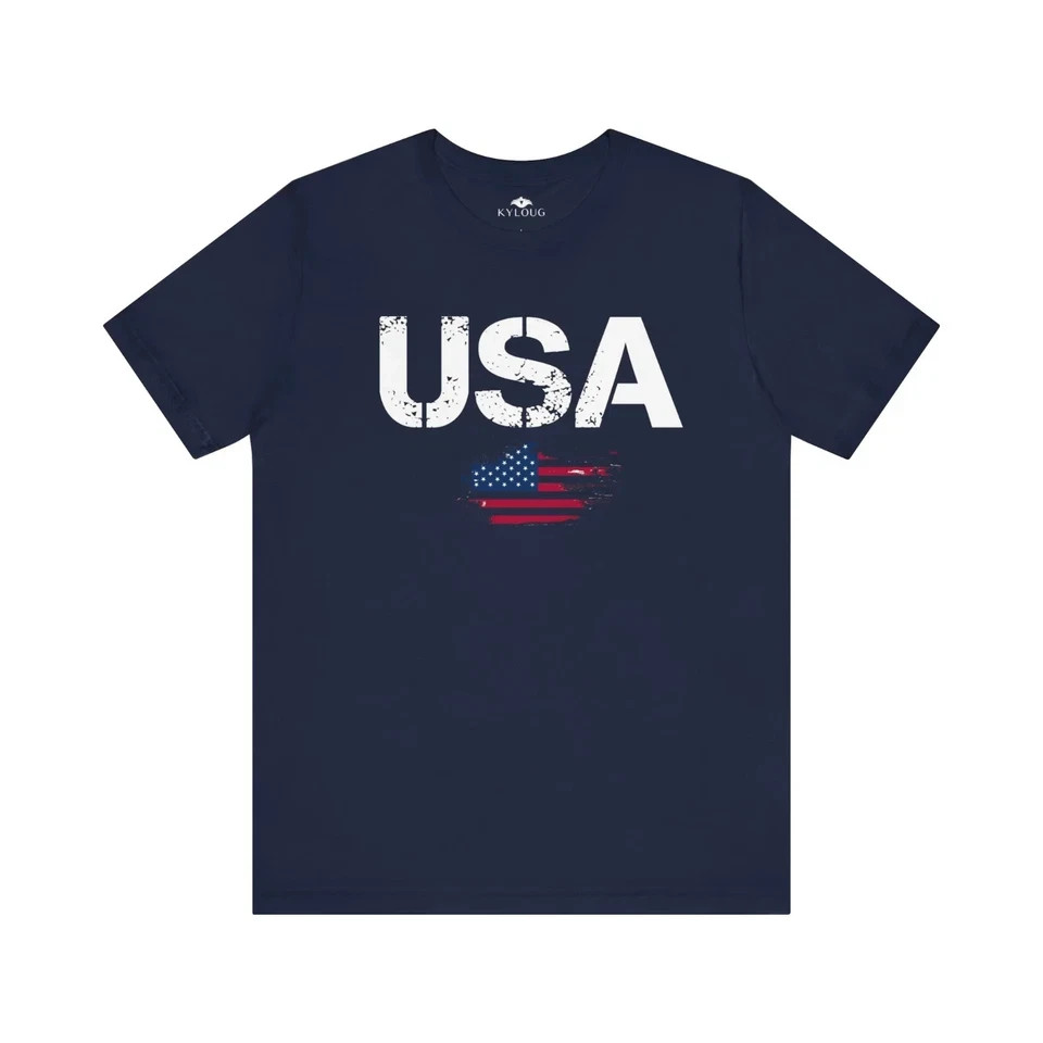 Stay stylish and patriotic with our Unisex round neck slim fit short sleeve USA Flag Printed T-Shirt. Made with premium materials, this shirt boasts a comfortable and flattering fit for both men and women. Show your love for the USA in style. Overview: This classic unisex short sleeve tee fits like a well-loved favorite. Soft cotton and quality print make users fall in love with it over and over again. These t-shirts have-ribbed knit collars to bolster shaping. The shoulders are tapered for a better fit over time. Dual side seams hold the garment's shape for longer. Fabric: Made with 100% Airlume combed and ring-spun cotton, a lightweight fabric (4.2 oz/yd² (142 g/m²)) that is easy to layer, breathable. Perfect for active and leisure wear. Fit: The retail fit that is perfect for casual and semi-formal settings. The crew neckline adds a classic, neat style that's perfect for accessorizing. Origin ; manufactured in the US and internationally in humane, no-sweatshop, sustainable way. Fabric blends: Ash and Heather Prism colors - 99% Airlume combed and ring-spun cotton, 1% polyester; Heather and Solid Blend colors - 52% cotton, 48% polyester; Athletic Heather and Black Heather - 90% cotton, 10% polyester.