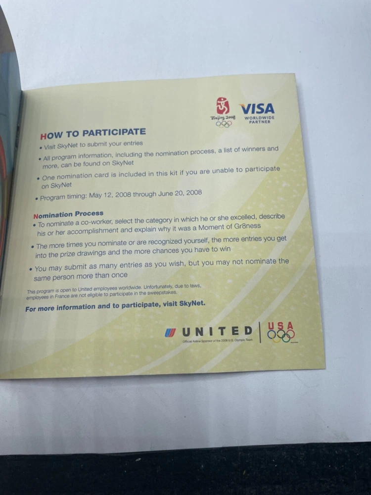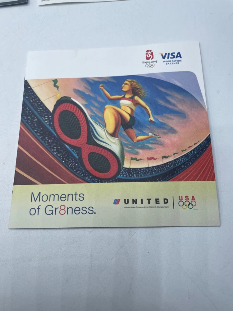 United Airlines Pamphlet and Pin Beijing Olympics 2008 Moments of Gr8ness Items are in used condition with normal signs of wear (marks, bends, writing on paper, yellowing, discoloring). The pin seems to have yellowed a bit with age, but still new in plastic. Comes with assortment of paperwork. Please look over photos.