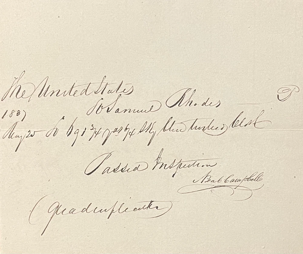 The United States to Samuel Rhodes , August 25,1837 for sky blue trouser cloth. Passed Inspection Neal Campbell. We will also Combine Shipping. Large expensive items will require more due to packing/shipping/insurance considerations. See our other fine items on eBay! Visit our ME Page. On Fri Jul 25 19:57:25 PDT 2003, seller added the following information: Pay me securely with any major credit card through PayPal! FREE! Sellers: Add a FREE map to your listings. FREE!