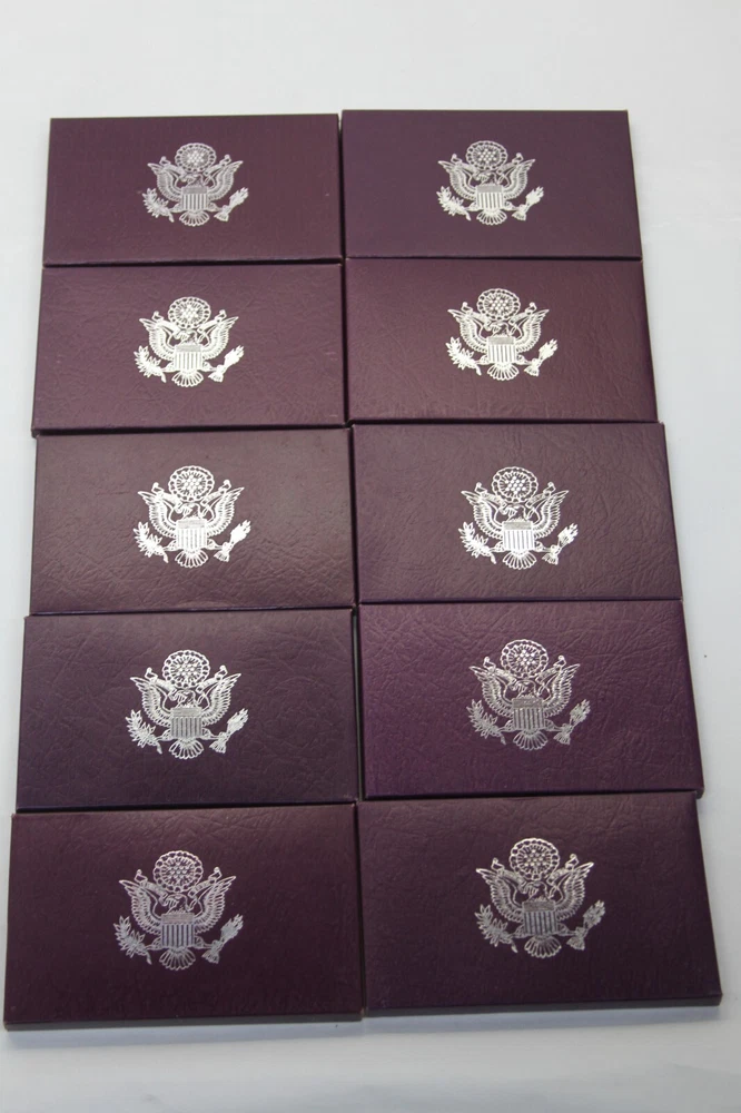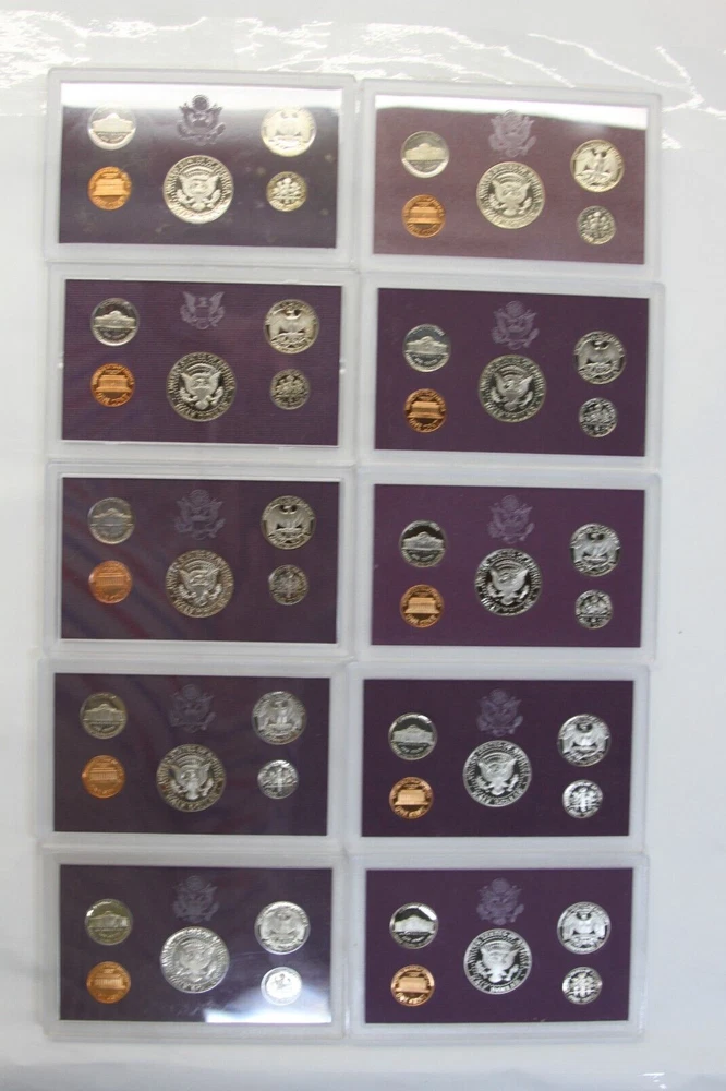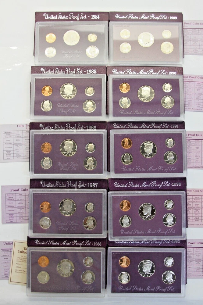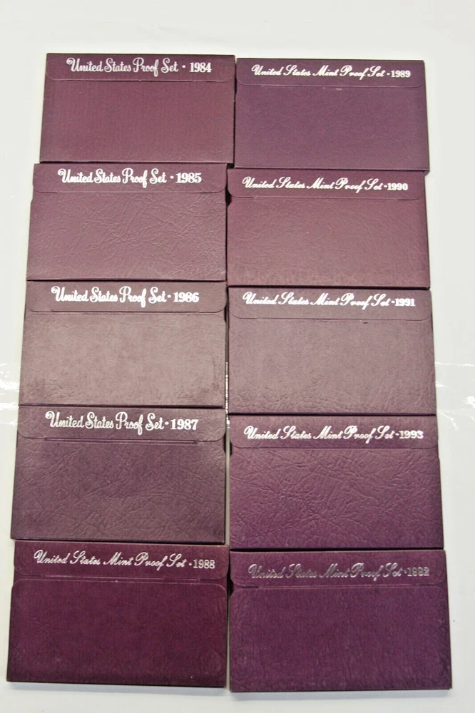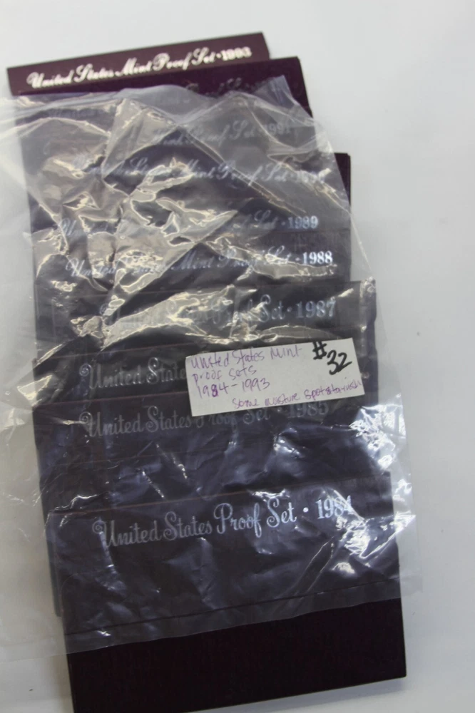 United States Mint Proof Set - ITEM #32 Includes: Lot of 10 Sets - 1984-1993 Very Good for ages. Some staining on cards and there are some with small tarnishing and clouding inside and on the coins and a few of the boxes have some damage. See all pictures for details. CONDITION: AS-SEEN IN PICTURES We are not coin dealers. We have inherited a very large coin collection (1,000+) of various Amercian coins. We have no need for any of them and will be listing them on ebay as time permits. If you have questions, I can try my best to answer but I have no real knowedge of coins, the condition or value other than what's on the coin's packaging and a little research to find a resonable price for each one. Please understand, we are trying to move these and do not want them back. So, if you are interested in purchasing one or more be sure to look at all the photos, read the description and ask questions when in doubt. These are as-seen sales with a NO RETURN - NO EXCHANGE POLICY. Thank you.