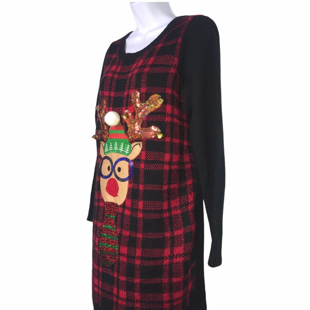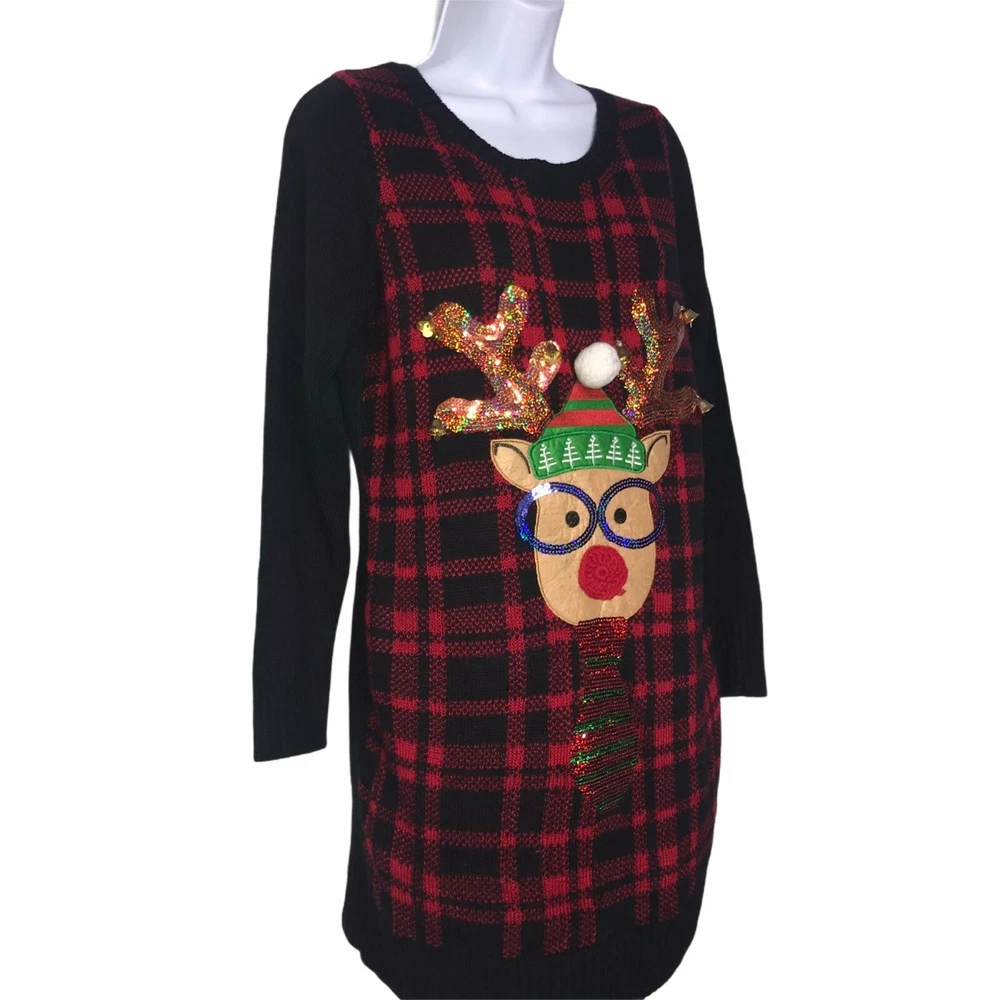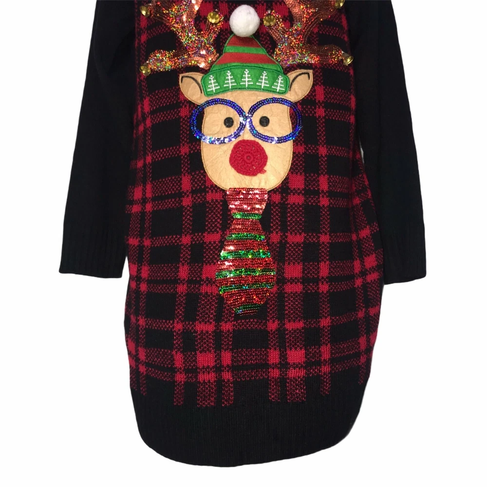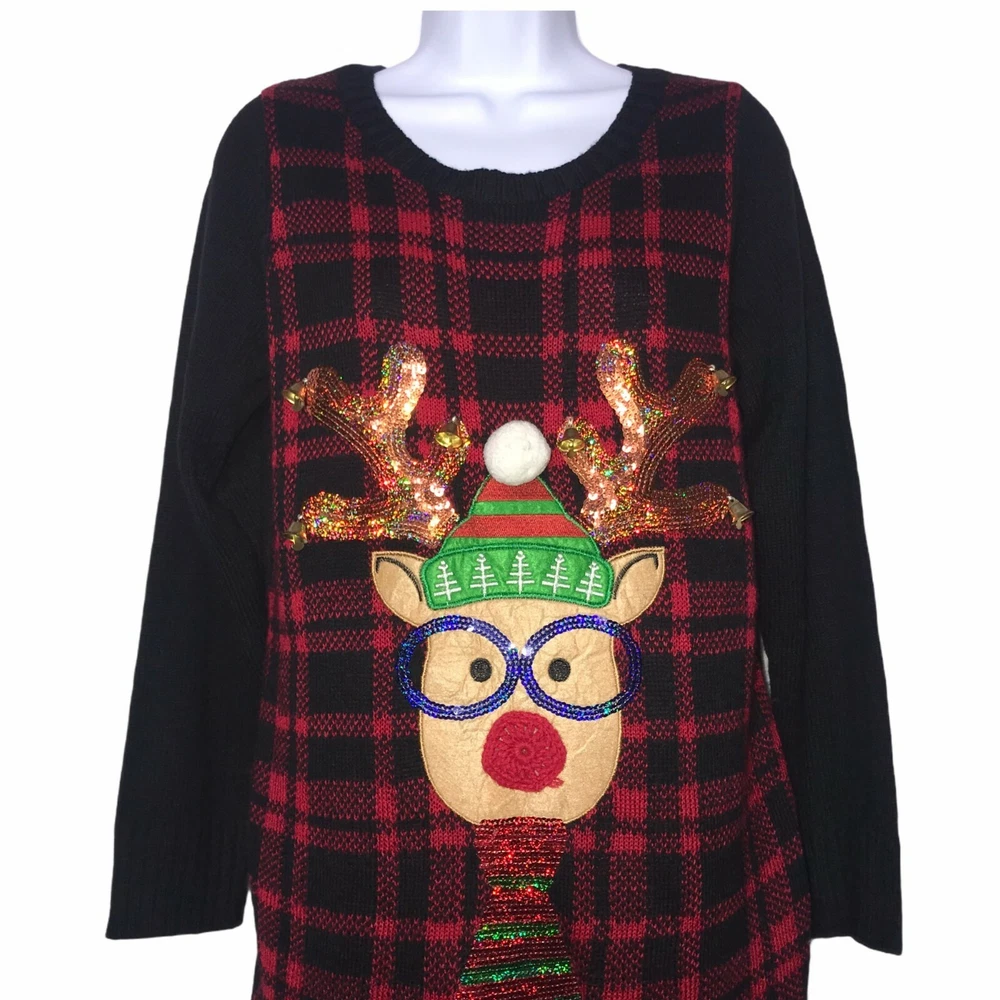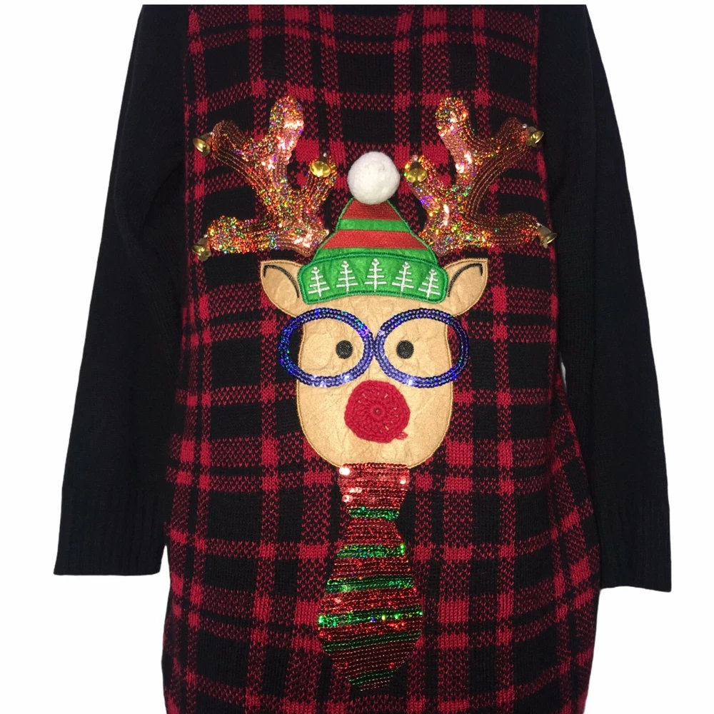 Brand: United States Sweaters Type: Sweater Style: Pullover Tunic Neck: Crew, Ribbed Color: Black, Red, Gold, Blue, Green Pattern: Check, Checkered, Solid Features: Reindeer Wearing Sunglasses, Metallic, Embellished, Sequins, Pom, Bells Sleeve: Long Material: Lightweight, 100% Acrylic Size: Small Condition: Excellent Other: Christmas, Ugly, Party, Contest, Holiday Laundering: Hand Wash Length: 32.5″ Chest: 19″ Sleeve: 24″ Measurements are approximate. Orders shipped within 1-2 business days. 1208054901