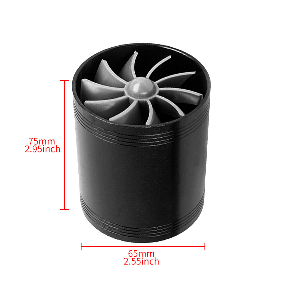 Car Air Intake Turbonator , Dual Fan Turbine Super Gas Fuel Saver Turbo for RV, camperr, Truck, Convertible, SUV Feature 【Product Name】Car Air Intake Turbonator Dual Fan 【Size】As the pictures show 【Color】Black (We also have black/red/blue/silver, if you like other colors, you can email us to send you a link or directly into the store to find) 【Material】Aluminum alloy + Plastic 【Quantity】1 Set Specification 【Features】 Increase the intake air volume of the combustion chamber by the turbofan, improve the combustion efficiency of the combustion chamber gas and thus enhance the horsepower. 【Working Principle】 ABS new material fan blade draws air into the combustion chamber at a higher rate, Improve the atomization degree of the combustion chamber, increased horsepower and gasoline savings. 【Material】 ABS new material fan blade+Aluminum alloy pipe. ABS material is corrosion resistant, heat resistant, high hardness and does not produce metal debris entering the combustion chamber. Aluminum alloy pipes are corrosion resistant, durable and lighter in weight. 【Installation Position】 The turbine is installed in the intake hose of the engine, and the best position is 10cm-30cm / 3.94 "- 11.8" before the throttle valve. 【Note】Suitable for car models with inlet pipe diameter greater than 2.5 inches. 【Note】Installation instructions are not included with the product. If you have any installation problems, please contact us by e-mail, we will provide you with electronic installation instructions or installation video. Fitment: Universal Fitment If there is any fitment uncertainty as to whether or not your car will be able to use this product, you can contact us by email! Package included: 1* Car Air Intake Turbonator Dual Fan Note Manual measurement may exist 1-2cm error, please understand Please be reminded that due lighting effects, monitor's brightness/contrast settings etc, there could be some slight differences in the colour tone of the website's photo and the actual item. If there is an unexpected delay in transit of your goods, or if you find there are some unexpected problems with the product after you receive it, we sincerely hope you will email us first instead of opening a case or give bad reviews, it is very important to us and I appreciate your understanding. We guarantee that you can get a satisfactory solution.