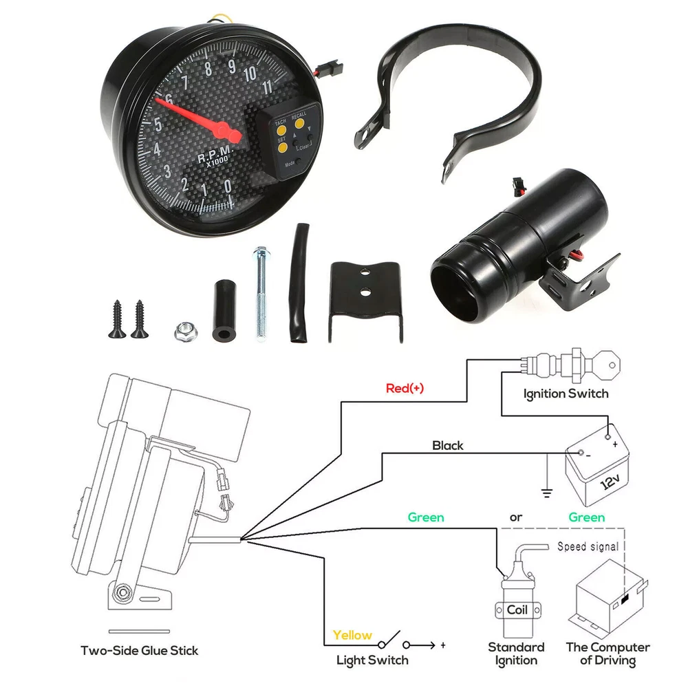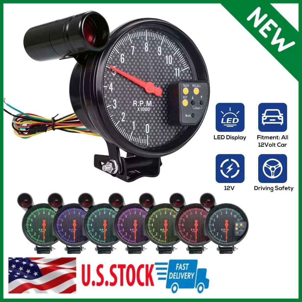 Features: 1. 5inch diameter, with black face, smoked lens and super bright LED background light. 2. 0-11,000 RPM measurement, shift light RPM is adjustable. 3. The stepping motor is sufficient for quick response of all sorts of professional motor sports. 4. The gauge dial is invisible while the ignition switch is off. Once the ignition switch is turned on, a clear display appears by colored LED illumination. 5. Provide high precision in the accuracy of information generated. 6. Adjustable color, choose the color of backlights according to personal preference. 7 colors are available. Specifications: Gauge Color: Carbon fiber fase Light Color: Light Color: Dark Blue/Yellow/Pink/Light Blue/Green/Red/Clear, 7 Colors with one gauge Material: ABS Gauge Display: LED Shift light: Green First and then turn Red Measurement Range: 0~11,000 RPM Powered By: DC12V Switch Unit Length: Approx. 5cm / 2" Indicator Size: 7.62 * 3cm / 3 * 1.2in (L * W) Diameter: 5 inch Fitment: 4 6 8 cylinders petrol engine Package Size: 24 * 20.7 * 12.8cm/9.6*8.2*5.2in Package Weight: 1017.4g / 35.9oz Package List: 1* Tachometer Gauge 1* Shift Light 1* Mounting Bracket 1* Meter Cup 1* Installation Manual On Oct 12, 2024 at 04:43:48 PDT, seller added the following information: