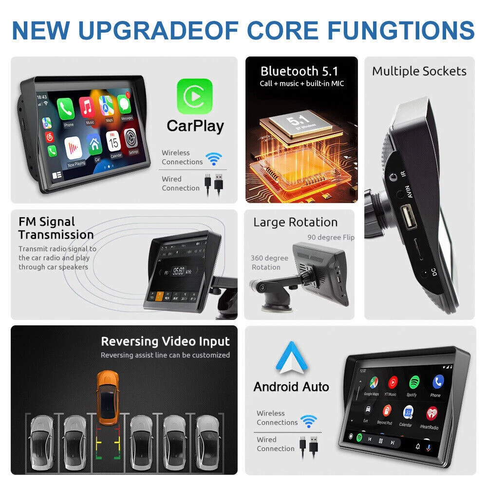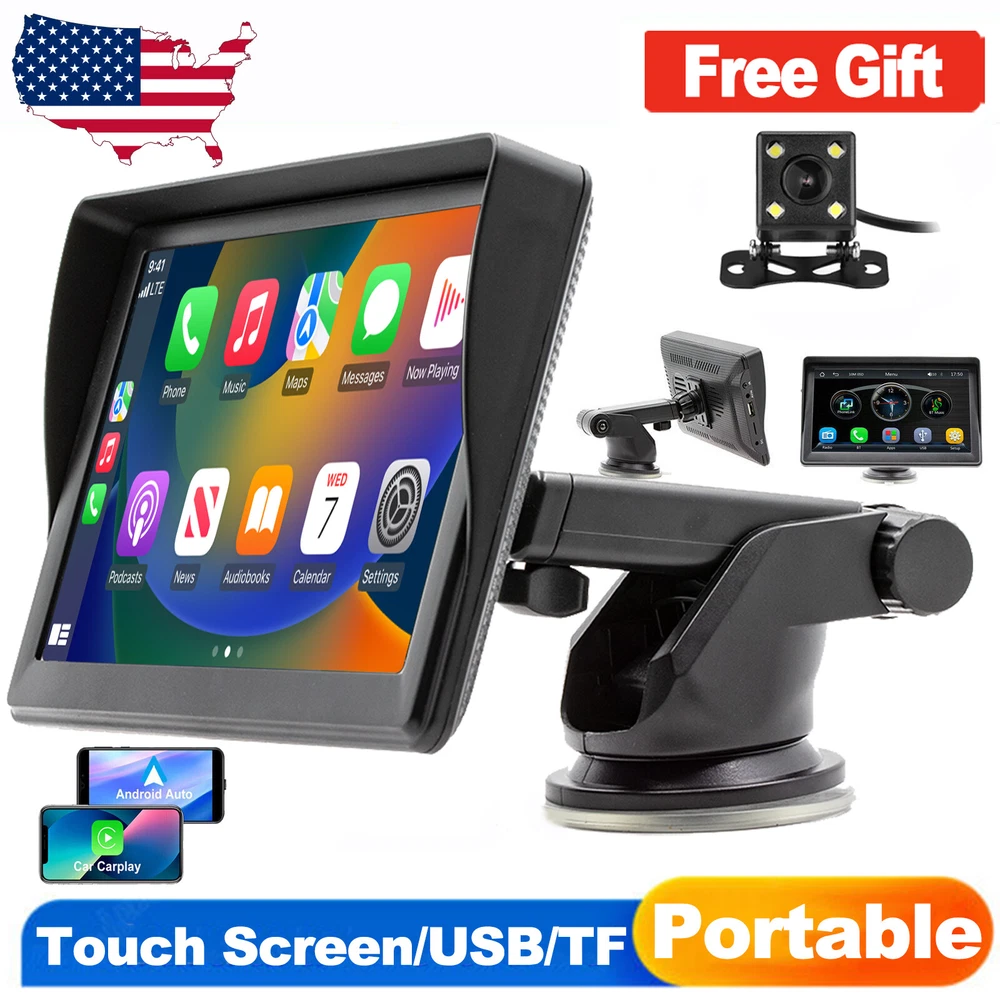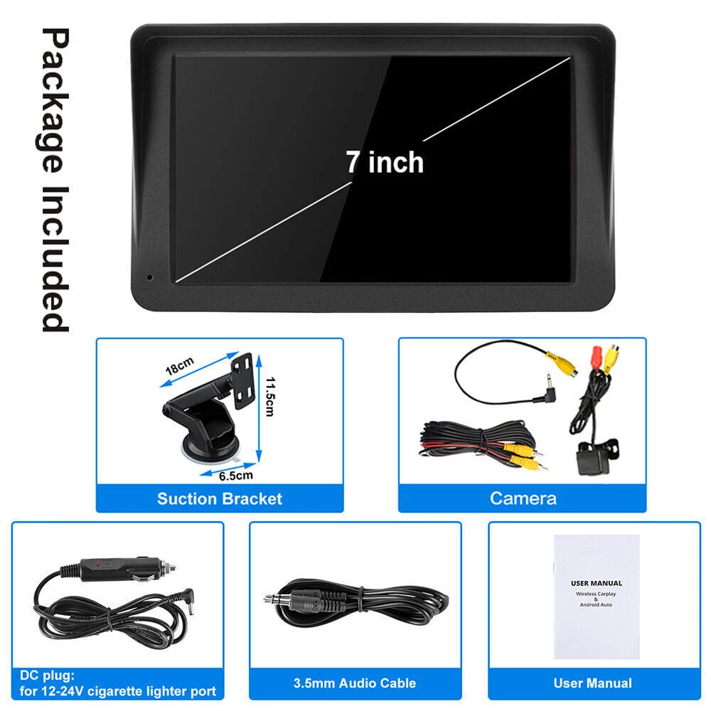 Product Description: Specifications: Display resolution:1024x600 Screen size:7 "HD Radio transmission frequency:FM 88.6~95.7MHz Working voltage:12~24V Reverse image:support Built-in speaker:support GPS: not supported USB interface:USB 2.0 TF card:support(Not included) Working temperature:-10~60 ℃ Bluetooth version:5.1 Wifi frequency:2.4G Screen: HD 1024 x 600 Language:Chinese/English/French/German/Italian/Japanese/Portuguese/Russian/Spanish/Polish/Turkish/Korean, etc Voltage: 7-32V Wallpaper Replacement: Supported EQ: Support Reversing sound mute: Switch Reversing line: switch Camera: CVBS Installation method: Vertical stand Intelligent interconnection: support IOS CarPlay/Android Auto/Bluetooth music/FM transmission/Airplay/Autolink/FM transmitter Cooling method: Passive cooling Reset: Support Firmware version: Support CarPlay:wireless Android Auto:wireless Airplay/Autolink:wireless SD card: Supports local audio playback Mirror: Flip left and right, flip up and down Touch calibration: Support Display Settings: Supported Time setting: Supported BT for CarPlay:Supported Time saving: Built-in capacitor Camera System: PAL/NTSC Item Incl uded: 1 x Car Multimedia Monitor 1 x User Manual 1 x Rear View Camera & Video Cable 1 x Monitor Suction Cup Gasket 1 x AUX Cable 1 x Packaging Box 1 x Power Cable The Bluetooth hands-free system and built-in clear mic allows you to answer the phone while driving, without having to hold your phone all the time, and support voice control at the same time, so you will always keep your eyes on the road ahead. Ensure that you reach your destination safely. And you can listen to wonderful music on the way home from get off work. 7 inch portable car stereo, built-in Apple Carplay and Android Auto. After the first successful connection, it can be recognized automatically. Making it easier to access your phone functions including music,GPS navigation, voice assist control,calls,notification ,messages and much more. This carplay radio can be firmly attached to your dashboard, you can adjust the height of the stand according to your personal visual habits, plug and play, so you can save a lot of installation costs. Note that this portable device cannot save any settings after a power outage because it does not have its own battery. It syncs time and date via CarPlay and Andr oid Auto. This car audio systems HD screen car radio supports all iOS and Android smartphone mirror link. Sync your maps, movies and more to the 7" big screen. The resolution 1024*600 HD capacitive monitor will give you highly responsive and clear viewing experience, and you can toggle day/ night mode to ensure that the brightness does not affect driving. Input audio through FM signal, transmit the signal to the original car.Radio can be set to transmit frequency: FM88.6~95.7MHz.It also comes with RCA jacks for subwoofer connection to improve sound effect if necessary.External subwoofer can be connected to support active subwoofer. The portable multifunctional stand on the back of the MP5 Player can be adjusted at will to watch videos from different angles. There is a spherical angle adjuster, which can be rotated 270° and can extend the length. The bottom layer is a silicone vacuum suction cup, which is more stable and safe while driving.