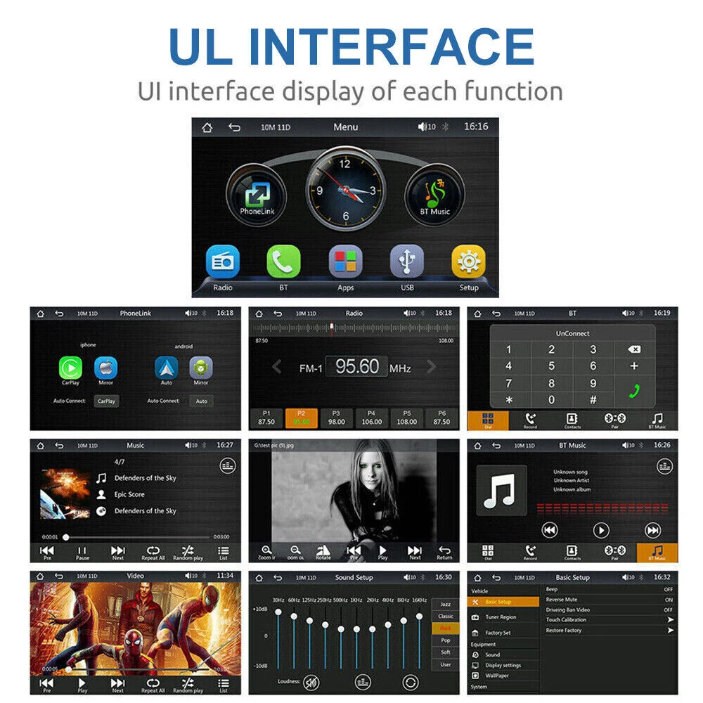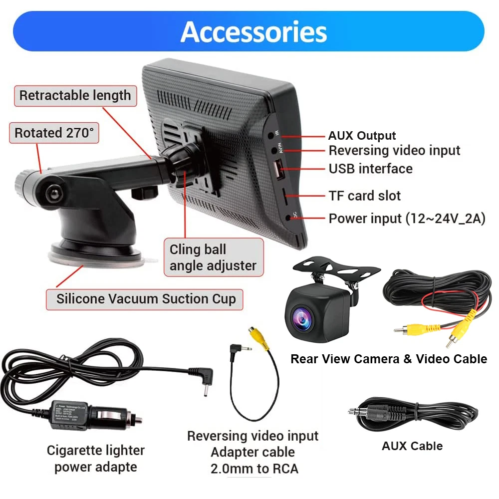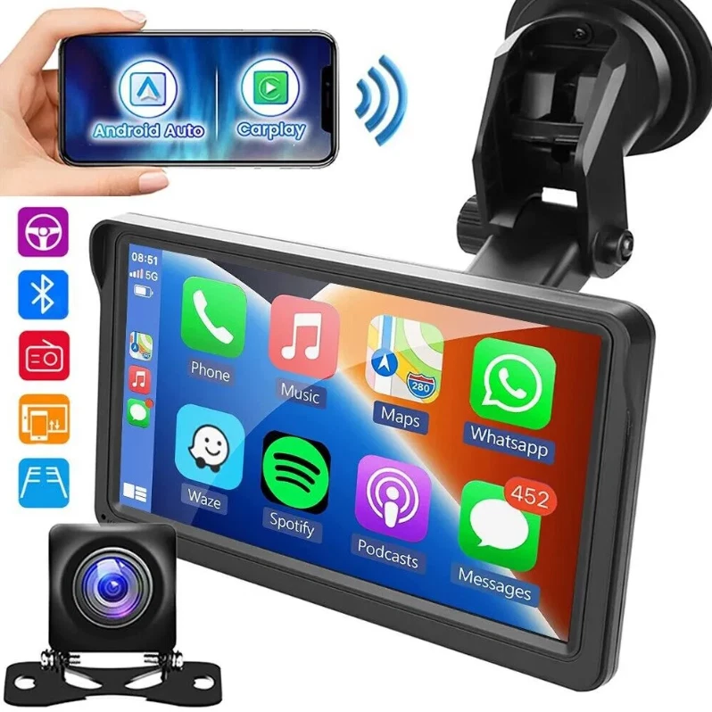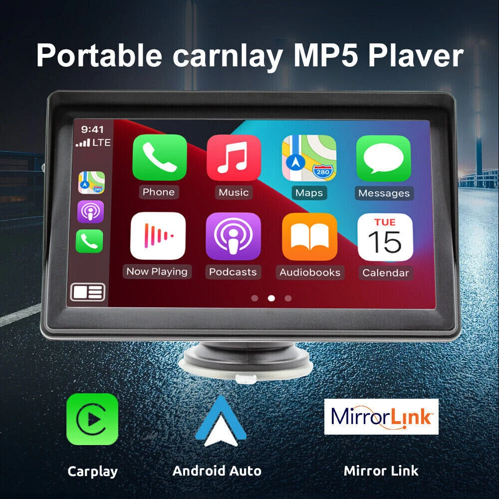 Product Description: Specifications: Display resolution:1024x600 Screen size:7 "HD Radio transmission frequency:FM 88.6~95.7MHz Working voltage:12~24V Reverse image:support Built-in speaker:support GPS: not supported USB interface:USB 2.0 TF card:support(Not included) Working temperature:-10~60 ℃ Bluetooth version:5.1 Wifi frequency:2.4G Screen: HD 1024 x 600 Language:Chinese/English/French/German/Italian/Japanese/Portuguese/Russian/Spanish/Polish/Turkish/Korean, etc Voltage: 7-32V Wallpaper Replacement: Supported EQ: Support Reversing sound mute: Switch Reversing line: switch Camera: CVBS Installation method: Vertical stand Intelligent interconnection: support IOS CarPlay/Android Auto/Bluetooth music/FM transmission/Airplay/Autolink/FM transmitter Cooling method: Passive cooling Reset: Support Firmware version: Support CarPlay:wireless Android Auto:wireless Airplay/Autolink:wireless SD card: Supports local audio playback Mirror: Flip left and right, flip up and down Touch calibration: Support Display Settings: Supported Time setting: Supported BT for CarPlay:Supported Time saving: Built-in capacitor Camera System: PAL/NTSC Item Incl uded: 1 x Car Multimedia Monitor 1 x User Manual 1 x Rear View Camera & Video Cable 1 x Monitor Suction Cup Gasket 1 x AUX Cable 1 x Packaging Box 1 x Power Cable The Bluetooth hands-free system and built-in clear mic allows you to answer the phone while driving, without having to hold your phone all the time, and support voice control at the same time, so you will always keep your eyes on the road ahead. Ensure that you reach your destination safely. And you can listen to wonderful music on the way home from get off work. 7 inch portable car stereo, built-in Apple Carplay and Android Auto. After the first successful connection, it can be recognized automatically. Making it easier to access your phone functions including music,GPS navigation, voice assist control,calls,notification ,messages and much more. This carplay radio can be firmly attached to your dashboard, you can adjust the height of the stand according to your personal visual habits, plug and play, so you can save a lot of installation costs. Note that this portable device cannot save any settings after a power outage because it does not have its own battery. It syncs time and date via CarPlay and Andr oid Auto. This car audio systems HD screen car radio supports all iOS and Android smartphone mirror link. Sync your maps, movies and more to the 7" big screen. The resolution 1024*600 HD capacitive monitor will give you highly responsive and clear viewing experience, and you can toggle day/ night mode to ensure that the brightness does not affect driving. Input audio through FM signal, transmit the signal to the original car.Radio can be set to transmit frequency: FM88.6~95.7MHz.It also comes with RCA jacks for subwoofer connection to improve sound effect if necessary.External subwoofer can be connected to support active subwoofer. The portable multifunctional stand on the back of the MP5 Player can be adjusted at will to watch videos from different angles. There is a spherical angle adjuster, which can be rotated 270° and can extend the length. The bottom layer is a silicone vacuum suction cup, which is more stable and safe while driving.