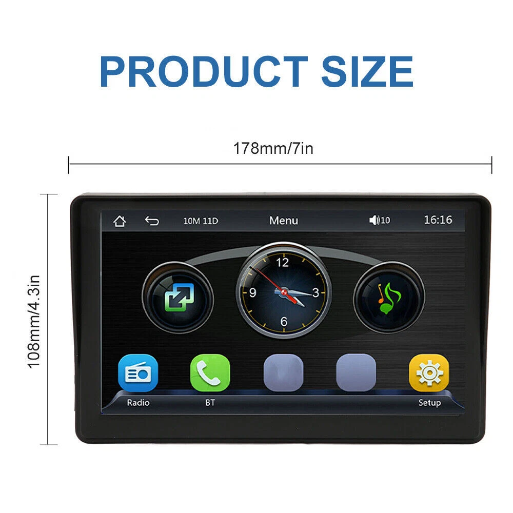 Screen resolution: 1024*600 Model: 7" Universal Portable Car Stereo Radio Bluetooth version: 5.1 Features: Auxiliary Input, Bluetooth Ready, HD Radio Ready, Memory Card Input, USB Input MPN: Does Not Apply Funtion: Car play/Bluetooth/FM /Mirror link/Android Auto Audio format: MP3/WMA/WAV/APE/FLAC USB interface: USB 2.0 Brand: Unbranded UPC: Does not apply Unit Size: NO Type: Portable Car Stereo Radio gtin13: Does not apply