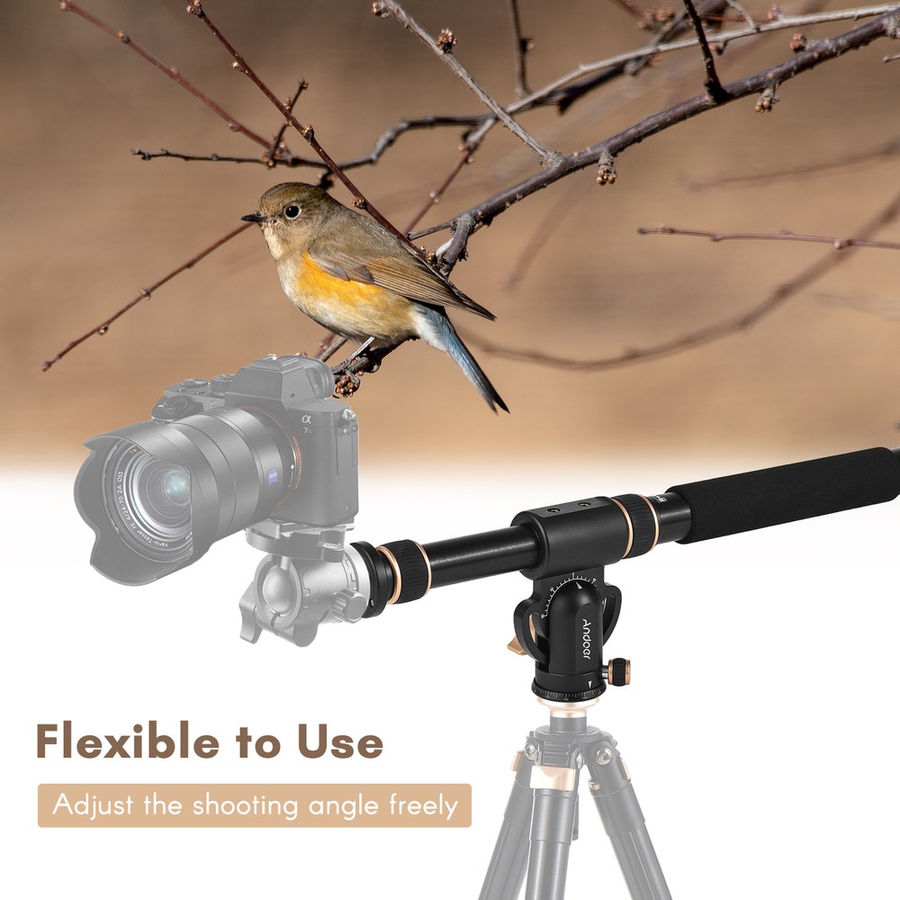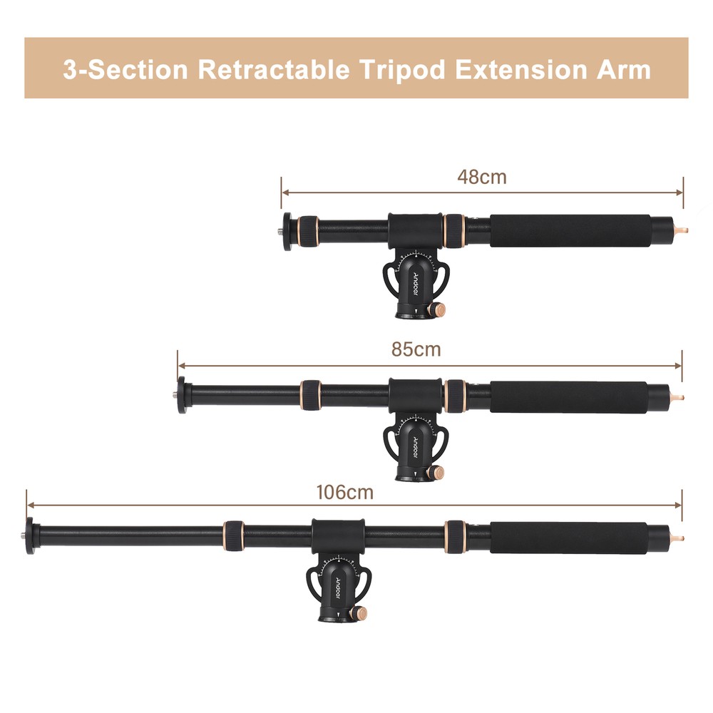 Features: 【Horizontal & Vertical Tripod Extension Arm】 The horizontal tripod extension arm is specially designed for overhead or flat lay photography and videography, also can be used as a normal vertical extension arm for tripod by unscrewing the sandbag hook at the end of the arm. 【Retractable Tripod Extension Arm】 The length of the tripod extension arm can be adjusted from 48cm/18.9in to 106cm/41.7in freely. 3-section telescoping tubes(32mm/28mm/25mm) and knob type locking system design, easy and quick to operate. 【Rotatable Tripod Extension Arm】 Equipped with a rotating base that allows you to achieve 360° horizontal rotation and 180° vertical adjustment without any ball head between the extension arm and tripod, meets your needs of different photography angles. 【 Tripod Extension Arm】 The tripod extension arm is made of alloy material, very and sturdy, and load capacity is to 5kg. With a hook for hanging sandbag(not included) to keep the stability of the extension arm. 【Multi-functional Tripod Extension Arm】 Designed with a double threaded screw (1/4 inch and 3/8 inch), the tripod extension arm is compatible with most DSLR cameras, camcorders or ball heads. Specifications: Material: Alloy Load Capacity: 5kg Tube Diameter: 32mm/ 28mm/ 25mm Retractable Length: 48cm-106cm/ 18.9in-41.7in Item Weight: 900g/ 2lbs Packing List: 1 * Tripod Extension Arm 1 * Carrying Bag 1 *