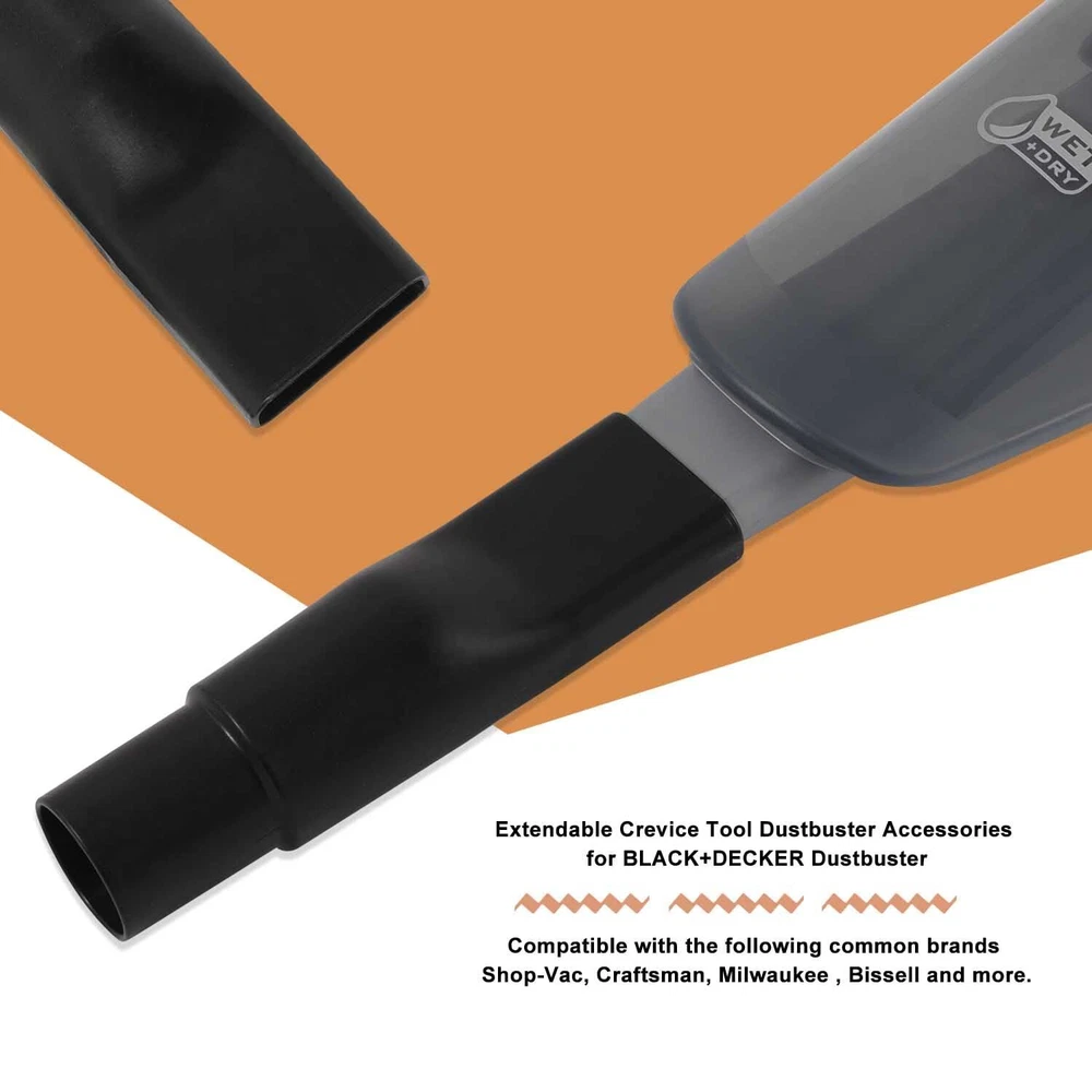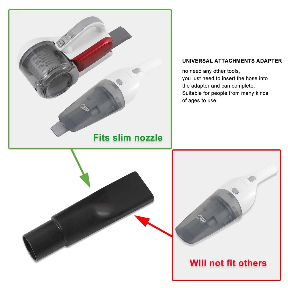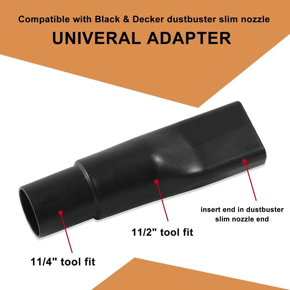 Universal Attachments Adapter Kit - Extendable Crevice Tool Dustbuster Accessories, Compatible with BLACK+DECKER Dustbuster, Fits Hand Vacuum Models with the Slim Nozzle and Extendable Crevice Tool. NEW Universal Vacuum Adapter specifically designed for the BLACK& DECKER Dustbuster Series of hand vacuum models with the extendable crevice tool and Flip-up brush nozzle The Dustbuster Hand Vacuum is exceptionally convenient and powerful, however, as reviews have pointed out, it finds a shortcoming as it lacks the availability of vacuum attachments. No longer an issue with this must-have accessory Simply insert the universal adapter into the suction end of your Dustbuster Hand Vac and attach any extension or vacuum attachment to maximize your vacuum's capability to pull debris and dust out of hard to reach areas This smart must-have universal adapter is an extremely helpful addition to the vacuum to easily and creatively clean the dust and debris out of hard to reach cracks of cars ,boats, and houses previously not possible with the dustbuster hand vac and the onboard crevice extension 6 pieces vacuum cleaner attachements includes 1-3/8''(35mm) to 1-1/4''(32mm) Hose Adapter, 1- 1/4 inch wet or dry vacuum crevices tool, 1- 1/4 inch utility nozzle , 1- 1/4 inch horsehair bristles round brush, 1-1/4 inch Nozzle Combination Tool, 1 -1/4 inch upholstery tool Shipping We offer FREE shipping on all orders! We ship within Three business days of payment, usually sooner. We use a selection of shipping services such as UPS, FedEx, USPS etc. We only ship to the lower 48 states, no APO/FPO addresses or PO Boxes allowed. Local pickups and combined shipping options are not provided at this time. Return You can return a product for up to 30 days from the date you purchased it. Any product you return must be in the same condition you received it and in the original packaging. Please keep the receipt. Payment We accept payment by any of the following methods: PayPal Please pay as soon as possible after winning an auction, as that will allow us to post your item to you sooner! Feedback Customer satisfaction is very important to us. If you have any problem with your order, please contact us and we will do our best to make you satisfied. Contact Us If you have any queries, please contact us via ebay. We usually respond within 24 hours on weekdays. Please visit our eBay store to check out other items for sale! Thank you for shopping at our store.