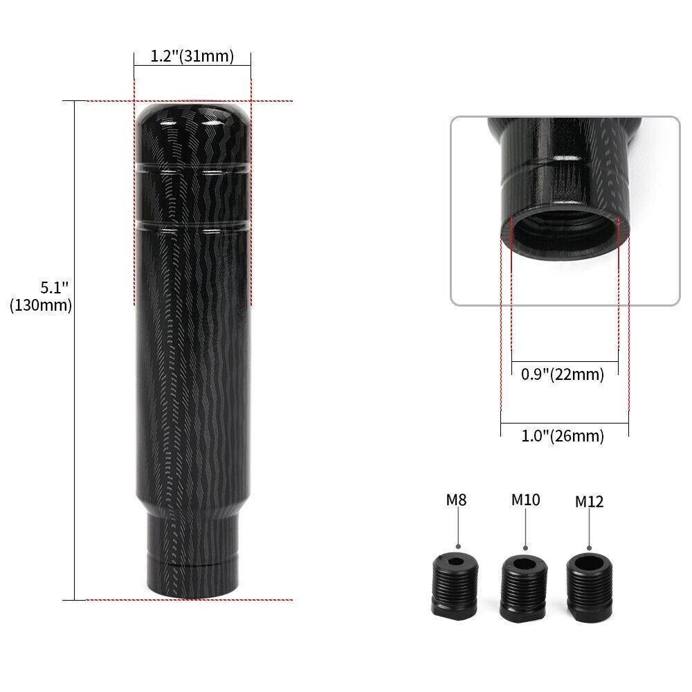 Adapters: M8, M10, M12 UPC: Does not apply gtin13: Does not apply Items Included: Screws, Shift Knob Universal Fitment: Yes Length: 130mm / 13cm / 5" Diameter: 31mm / 1.2" Package included: 1 x Shift Knob, 3 x Adatpers NOTE: Not Real Carbon Fiber, Just Painted OE/OEM Part Number: NOT OEM Color: Carbon Fiber Look Manufacturer Warranty: 6 Months Country of Origin: China Type: Manual Material: Aluminum Brand: ANNX Manufacturer Part Number: SFN128