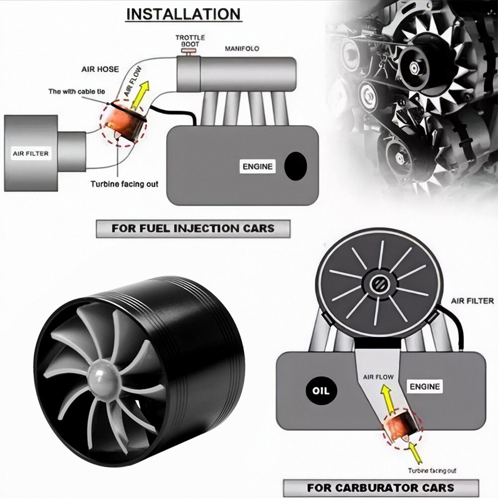 Car Air Intake Turbonator Single Fan, Single-Sided SUV Turbo Car Engine Turbo, Multi-Functional Turbo Supercharger, Auto Engine Performance Upgrade for RV, camperr, Truck, Convertible, SUV Feature 【Product Name】Car Air Intake Turbonator Single Fan 【Size】As the pictures show 【Color】Black (We also have black/red/blue/silver, if you like other colors, you can email us to send you a link or directly into the store to find) 【Material】Aluminum alloy + Plastic 【Quantity】1 Set Specification 【Multi-Functional Supercharging】 Enhance your car's torque and energy efficiency with improved intake, while making your throttle more responsive and promoting combustion. Experience advanced technology at its finest. 【Quality Assurance】 This car turbine is made of Sturdy and aluminum alloy material, this car turbine is and strong with long service life 【Hassle- Assembly】 Installed in the intake hose between the bellows and the throttle. Choose the right rubber collar according to the diameter of the intake hose. 【Wide Application】 Streamline your vehicle's engine with our innovative car turbine. Ideal for enhancing auto, rv, car, travel, , truck, convertible car, and SUV performance. 【Effortless Driving】 Our car turbine's lightweight design allows for a more effortless driving experience, providing a comfortable and relaxed ride without sacrificing performance. 【Note】Install 10cm to 30cm in front of the throttle valve. 【Note】Installation instructions are not included with the product. If you have any installation problems, please contact us by e-mail, we will provide you with electronic installation instructions or installation video. Installation instructions Installed in the original air box and throttle between the air intake hose, in the installation of the original car depends on the size of the diameter of the air intake hose and configuration of the power wheel itself with the thickness of the rubber collar, the power wheel with the three rubber collar has a different thickness, installation in accordance with the size of the diameter of the intake hose to the appropriate choice. Fitment: Universal Fitment If there is any fitment uncertainty as to whether or not your car will be able to use this product, you can contact us by email! Package included: 1* Car Air Intake Turbonator Single Fan Note Manual measurement may exist 1-2cm error, please understand Please be reminded that due lighting effects, monitor's brightness/contrast settings etc, there could be some slight differences in the colour tone of the website's photo and the actual item. If there is an unexpected delay in transit of your goods, or if you find there are some unexpected problems with the product after you receive it, we sincerely hope you will email us first instead of opening a case or give bad reviews, it is very important to us and I appreciate your understanding. We guarantee that you can get a satisfactory solution.