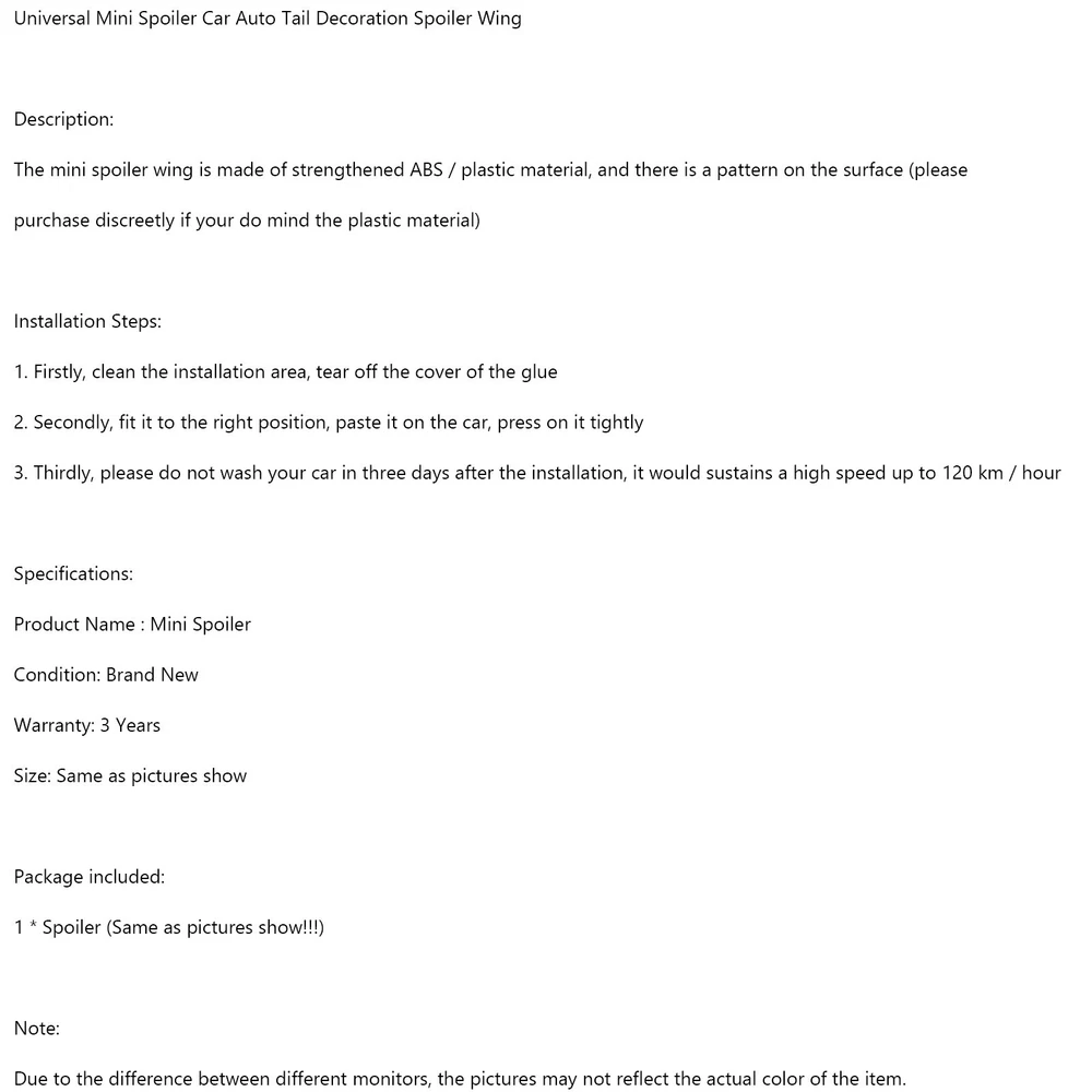 You may also like Carbon Fiber Look Rear Trunk Spoiler Wing For Benz W206 C63S Style 2022-2024 60.69 USD Free shipping Carbon Fiber Style Rear Trunk Spoiler Wing For BMW G30 G38 F90 M5 MP 2017-2023 63.69 USD Free shipping 57"145cm Universal Racing GT Style Down Force Trunk Spoiler Wing Glossy Black #8 95.69 USD Free shipping Glossy Black Rear Spoiler Wings Fit For Toyota Camry LE SE XSE XLE 2018-2024# 94.69 USD Free shipping Universal Lightweight Aluminum Rear Car Trunk Wing Racing Spoiler Bracket 135cm 72.69 USD Free shipping Universal Car Rear Trunk Wing Racing Spoiler With LED Brakes Light For Sedan .. 52.69 USD Free shipping Glossy Black Rear Spoiler Wings Fit for Toyota Camry LE SE XSE XLE 2018-24 62.69 USD Free shipping Universal Hatch Aluminum Rear Trunk Wing Racing Spoiler With Turn Signal LED .. 79.69 USD Free shipping R style Rear Roof Cover Spoiler Wing Diffuser For HONDA CIVIC 10th Sedan 16-21 59.69 USD Free shipping Universal Sedan Aluminum GT Rear Trunk Wing Racing Spoiler Silver .. 55.69 USD Free shipping ZL1 1LE Style Rear Trunk Wing Spoiler Fits Chevy Camaro 2016-2022 Gloss Black 205.69 USD Free shipping Universal Sedan Aluminum GT Rear Trunk Wing Racing Spoiler Black New 44.69 USD Free shipping Black Universal Hatch Aluminum Rear Trunk Wing Racing Spoiler With LED Light# 52.69 USD Free shipping M3 Style Rear Trunk Spoiler Wing Fit BMW 3 Series F30 F35 2012-2019 Gloss Blk #8 39.69 USD Free shipping Glossy Black Rear Window Roof Spoiler Fit Toyota Camry LE SE XSE XLE 2018-24 57.69 USD Free shipping All Models For Honda For Suzuki For Kawasaki For Yamaha For BMW For Polaris For CFmoto For Ducati For Benelli For Trident For Triumph For Aprilia Other part You may also like Short Clutch Brake Lever fit for Trident 2022 Bonneville T120 Bobber 2019 US GLD 27.69 USD Free shipping Voltage Rectifier Regulator For Compu-Fire 40A 3-Phase Charging Systems 55402、 49.11 USD 51.69 USD Free shipping 5% off 95760-3Z102 Parking Assist Rear View Backup Camera For Hyundai i40 49.69 USD Free shipping Long Brake Clutch Levers For Buell XB12 XB9 Ulysses XB12XT XB12X Silver #3 28.69 USD Free shipping Windshield Cowl Panel Cover 51717027083 For BMW 525i 530i 545i 525xi 530xi 550i# 69.69 USD Free shipping PRODUCT DESCRIPTION Universal Mini Spoiler Car Auto Tail Decoration Spoiler Wing Description: The mini spoiler wing is made of strengthened ABS / plastic material, and there is a pattern on the surface (please purchase discreetly if your do mind the plastic material) Installation Steps: 1. Firstly, clean the installation area, tear off the cover of the glue 2. Secondly, fit it to the right position, paste it on the car, press on it tightly 3. Thirdly, please do not wash your car in three days after the installation, it would sustains a high speed up to 120 km / hour Specifications: Product Name : Mini Spoiler Condition: Brand New Warranty: 3 Years Size: Same as pictures show Package included: 1 * Spoiler (Same as pictures show!!!) Note: Due to the difference between different monitors, the pictures may not reflect the actual color of the item. About Us Payment Shipping Returns Contact Us About VIPIH VIPIH is one of the international leading distributors specialized in distribution of motor parts of the world's prime motorcycle part suppliers on a global scale with the full responsibility in procurement, shipping, sales and marketing and after sales service. VIPIH fulfills all needs of its clients completely and on a timely basis with the know-how it has built up since it was established and the comprehension knowledge of the sectors standards. The perfectionist approach in product quality, high service availability, strict principle of business follow-up, reliability and the good reputation which has gained strength as a result of customer satisfaction are the most striking components of VIPIH's success. VIPIH is presently capable of supplying all demands for motor parts from the petrol pump to rectifier in a wide range. Free delivery with worldwide shipping options available. If you need any further information before ordering,please get in touch with expert advice. About Item All items sold by us are being described to the best of our abilities, as accurate as possible, and with utmost conscientiousness on our part. However, to avoid any potential oversights, I respectfully request your assistance in helping us to make this a mutually satisfactory transaction by THOROUGHLY reviewing item description and photos, and asking all questions PRIOR TO BIDDING. Customer Satisfactory 1.We back our commitment with superb service, 100% full money back and a customer satisfaction guarantee. 2.I am here and ready to assist you with any questions or concerns you might have before or after the purchase. 3.My goal is to make sure you are a happy customer and pleasant shopping with us. Feedback If you are satisfied with the purchase and our total service, your comment is very important in our business success. Please take a minute to leave us a positive feedback with an overall Detailed Selling Rating (DSR) of 5. Our eBay account setup auto feedback, so eBay system gives you automatically Positive feedback back after your positive feedback left. If you plan to give us a neutral/negative feedback Or open ebay/paypal case, please write to us immediately so that we can do our best to resolve your problem. 1.We only accept PayPal. 2.PayPal is the only online payment method we accept. Please make sure you have a valid/confirmed PayPal account prior bidding. 3.Payment must be made within 3 days of the auction end time. Non-Paying bidders will be reported. 4.Our eBay account automatically open a dispute for a unpaid item, when we don't receive your payment after 4 days. United States Buyers Parcel will via USPS or UPS from us United States warehouse Shipping Time Usually ,Parcel will be delivered 2-10 working day include Handling time. Sometimes shiping time may has a little delay, such as Bad wether,Holidays We sta