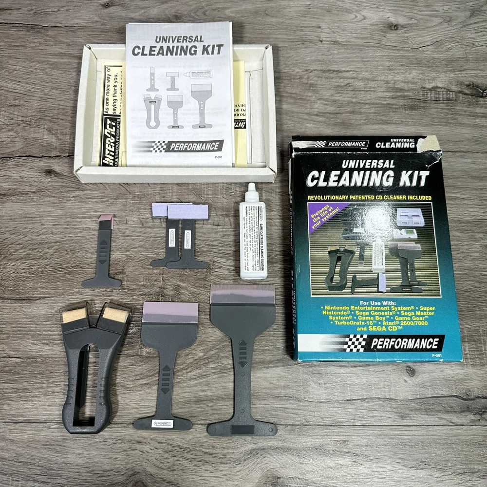 Universal Cleaning Kit NES Sega Genesis Master Nintendo Atari Gameboy. In used condition please see pictures for details. These are opened and looks to be complete. They still have a bottle of liquid in them and feels full. I had others in the buy which had no liquid and tossed those. This came from a large sega collection of many new old stock items and lightly used items.