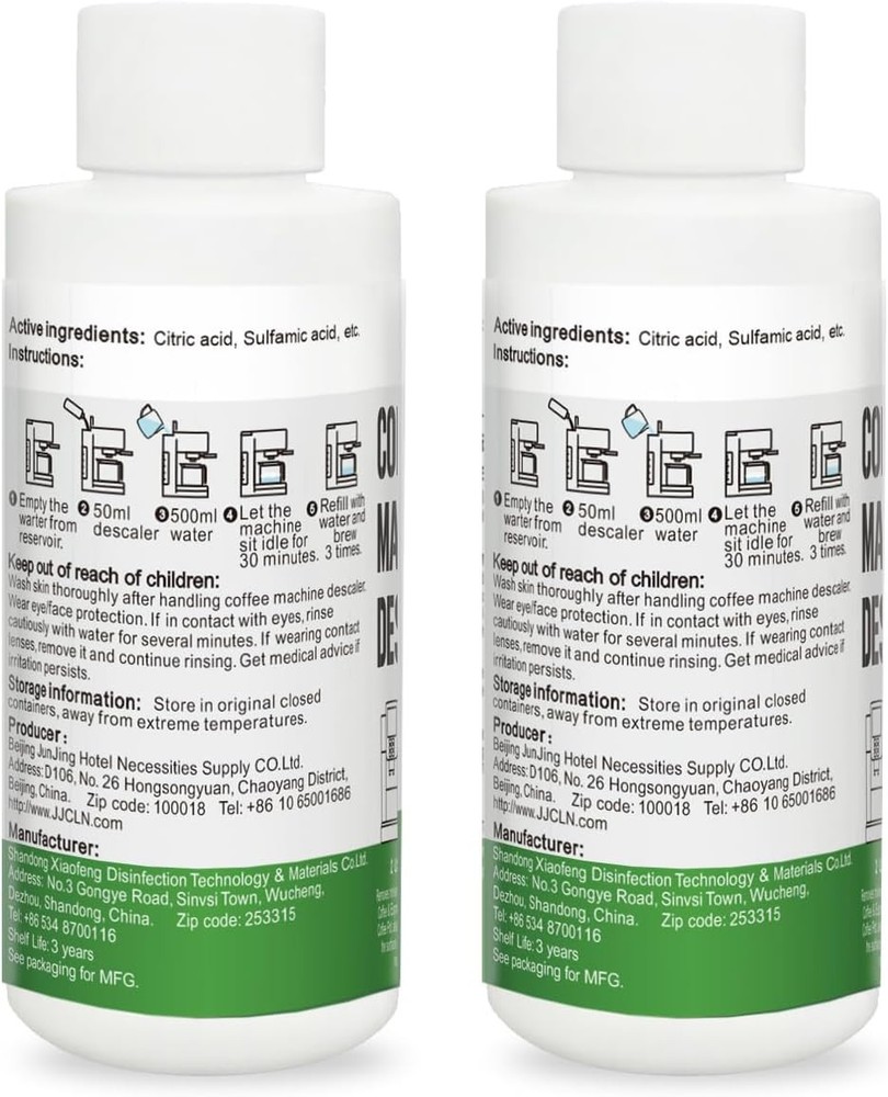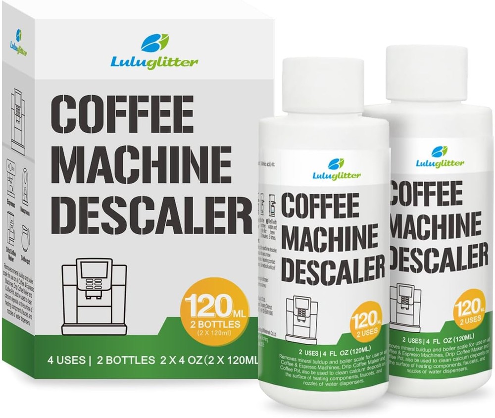 Coffee Machine Descaler, Universal Descaling Solution For Coffee Makers & Espresso Machines,Coffee Maker Cleaner And Descaler, Limescale Remover Product Details Package Dimensions : 5.35 x 3.66 x 1.89 inches; 11.36 ounces Item model number : descaler120 Manufacturer : junjing cleaner Brand: LULUGLITTER Unit Count: 1.0 Ounce Number of Items: 1 Contains Liquid Contents: Yes Manufacturer: junjing cleaner POWERFUL DESCALING SOLUTION: Our coffee descaler and cleaner is a multipurpose solution meant to remove mineral and limescale deposits on a wide variety of machines. It deeply penetrates oil and can work as a decalcifier for other home appliances SAFE For Use: Our coffee maker cleaner and descaler is made from natural concentrated citric acid that is odorless, powerful, and safe for your coffee maker and your family Extend Machine Life – Regular use of our coffee descaler significantly extends the lifespan of your machine. By using our solution, you can keep your coffee maker functioning like new for years Universal Descaling Solution -- Compatible with Keurig, Nespresso, Breville, Delonghi, Jura, Ninja, OXO, Gaggia, and Philips, is eco-friendly and specially formulated to clean your machine safely 2 BOTTLES, 4 USES - This package comes with 2 bottles of descaling solution, for a total of 4 uses. It can be used in any model machines.
