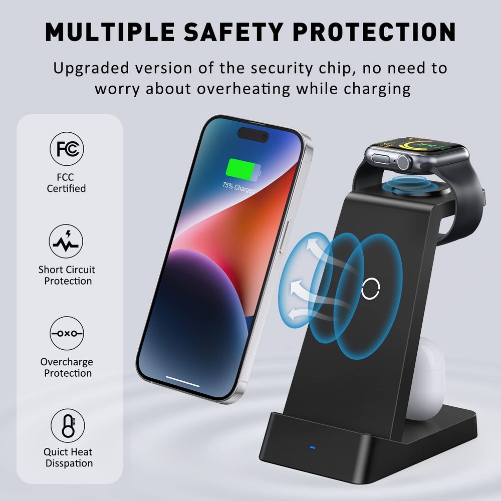 Safety Fast Charging Equipped with high quality 18W fast charger and 3.3ft type-c cable, enable fully charge in just 2 to 3 hours, get a boosted at 30% faster than other wireless charger. Besides, with advanced FCC approval, our 3 in 1 charging station uses the latest chip to boost efficiency and improve heat dissipation, and provides temperature control and voltage, and short-circuit prevention. Also there are cooling holes on the back, no need to worry it gets extremely hot. 3 in 1 Wireless Charging Station This wireless charging dock can charge, watch and at the same, saves your costs.Wide compatibility to cover Android and IOS devices, including 14/14 Plus/14/13 Mini/13/13/13 Max/12 Mini/12/12/12 Max/11/11/11 Max/XS/XS Max/XR/X/8/8P or Series, 7/SE/6/5/4/3/2,/3/2/1. A must device for fans. Product Dimensions:2.82 x 4.14 x 5.12 inches Item Weight:9.6 ounces 1*3 in 1 wireless charging station 1*usb type-c cable 1*18w power adapter 1*user manual