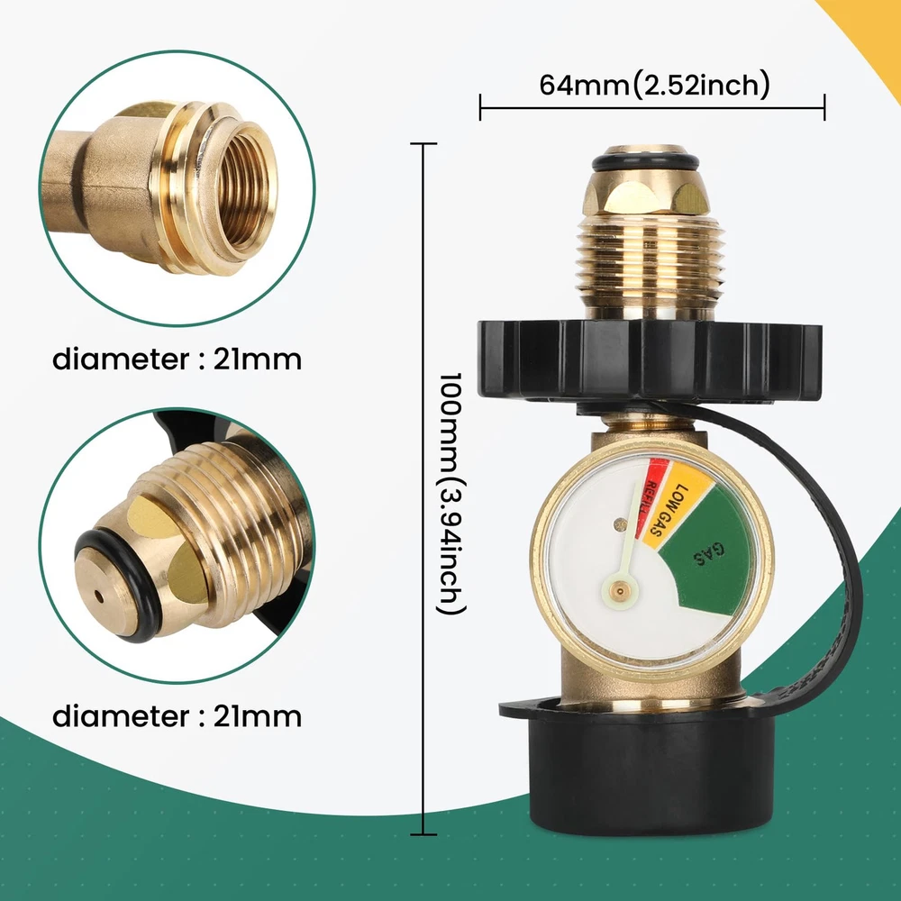【Fluorescent Pointer】The pointer of this 100 lb propane tank gauge is made of fluorescent material, you can clearly know the propane level of the propane tank in dark environment. The rotatable gauge allows the gauge to be in a position suitable for reading. (Tips: This propane tank gauge 100lb only provides a reference interval and it is not accurate to every pound.) 【Role and Function】The upgraded pol to qcc1 adapter converts your large propane tank's POL connection to QCC Type1 & POL connection, It offfers both types of connections for your propane tank. It is more convenient for daily use by using this pol propane tank gauge. 【Packing list】Propane adapter pol to qcc1 X 2, dust cover X 1. This pol to type 1 propane adapter is equipped with an handwheel, you just need to tighten the propane tank adapter by the handwheel and then you can put it into use, tools is no need. (tips: before starting to use, please make sure the installation is correct, no gas leakage) 【Preferred Material】The propane tank refill adapter pol lp tank valve to qcc1 kit is made of 100% solid brass with high strength and hardness, so it can withstand harsh weather and hot and cold changes, dent corrosion, scratches, etc. It will provide you with long term secure connection, more worry free.
