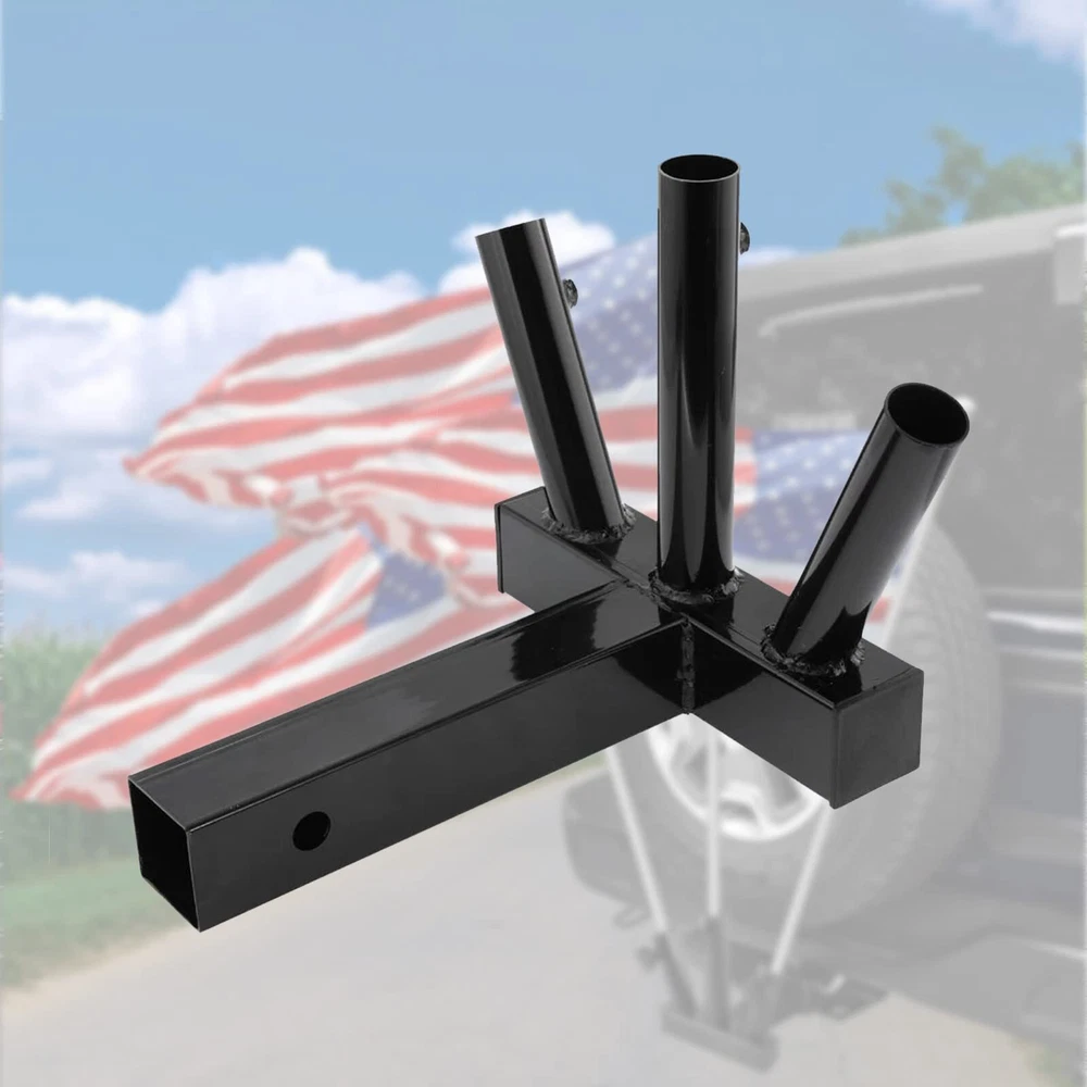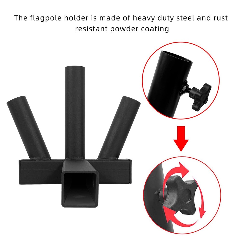 Universal Hitch Mount Flagpole Holder - 3 Head Trailer Hitch Flag Pole Holder ✔Product Details: Flag Pole holder(3 Head) ✔Colour: Black ✔Compatible for any vehicle with standard 2"hitch receiver, The flagpole holder is suitable for poles with a max diameter of 1.5". ✔Great for SUV, RV, Pickup, Truck, Camper, Trailer, etc. Features: 💎 1.The flag mount truck comes with 3 durable tightening screw knob and the angled holder could make the flag more fluttering. 💎 2.This High-quality flag holder features a design that securely holds up to 3 flags, ensuring you never have to leave your passion on the flagpole at home. 💎 3.Use premium steel material, good rigidity and stability. The surface is coated with a black oxide layer, strong and durable, anti-corrosion and anti-rust, anti-deformation and anti-impact for long-lasting reliability. 💎 4.Simple easy installation. Design with hand knob tightening screws, just insert mount into the hitch receiver and lock into place using the hitch pin. 🍏 How To Install: ➀.Slide the bracket into the hitch receiver. ➋.Put the plug through the hitch receiver and hitch mount flagpole holder. ➂.Locked the base onto the receiver with an snap pin. ➍.Put the Flag Pole into to the hitch mount flagpole holder. ➄.Adjust the height of Flag Pole, then tighten the screws. ➏.Finish the installation, NO tools required. Tips If there is a spare tire where the flagpole holder is installed, it is recommended to install an extra 2 inch hitch extender (purchased by yourself), so that the spare tire will not block the flagpole mount. An extra hitch tightener (purchased by yourself) can help you secure the connection between the flagpole holder and the hitch receiver on your vehicle. Package Contents: 1 x Hitch mount flag pole holder(3 Head) 1 x Hitch pin 3 x Plum Screw - Your Professional Tool House PREMIUM MATERIAL - Flag pole holder is made of heavy duty steel and rust-resistant powder coating, with a Drain-off Hole on the bottom to drain away raindrops or melt snow, better enhance longer lifespan.The flagpole holder has been upgraded, it can fix up to 3 flags, and come with 3 durable tightening screw knob, which is safe and practical. SCOPE OF APPLICATION - Camper rv hitch mount flagpole holder fit for standard 2 inch receiver, including SUV, RV, Pickup, Truck, Camper, Trailer, etc. If there is a spare tire where the flagpole holder is installed, it is recommended to buy another extender. This way the spare tire will not block the flagpole mount. The flagpole holder is suitable for poles with a max diameter of 1.5". EASY INSTALLATION - Flexible to use,slide the mount into the hitch receiver, and then fix it with the hitch pin in the package. After the flagpole is inserted, it can be fixed by tightening the plum screw without using any tools. PACKAGE INCLUDING - Car receiver flag pole mount come with 1 x Hitch Mount Flagpole Holder, 3 x Plum Screw, 1 x Hitch Pin. Firmly holds your national flag, team flag or other thing you want to display, perfect for showcase your character/passion with a big flag in car show, sport event, off-road races, travel, family vacation, etc. - Universal fitment 3 trailer hitch flagpole holders for any vehilcle with standard 2" hitch receivers. We offer a 12-month , feel free to us with any questions.