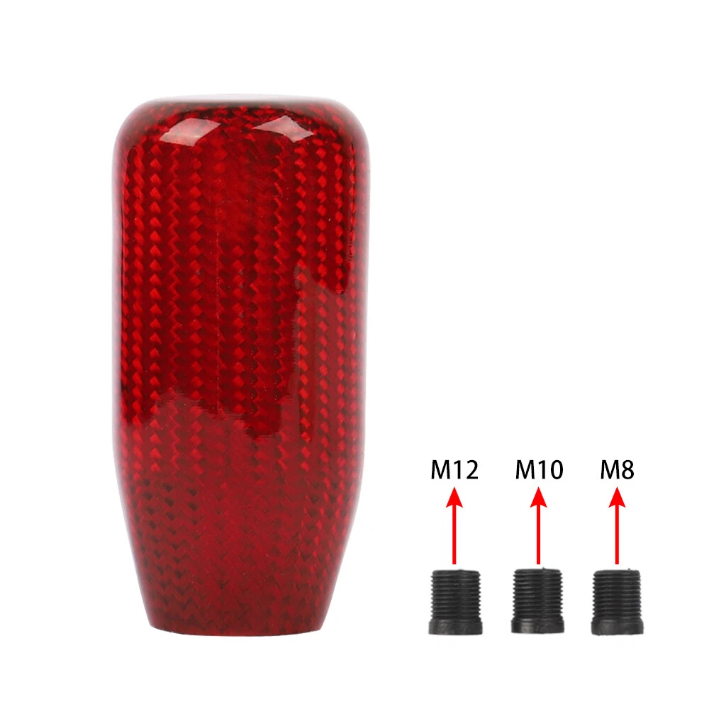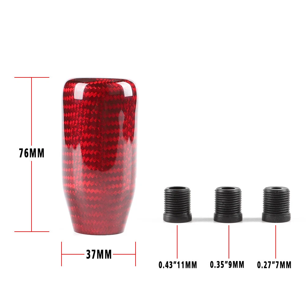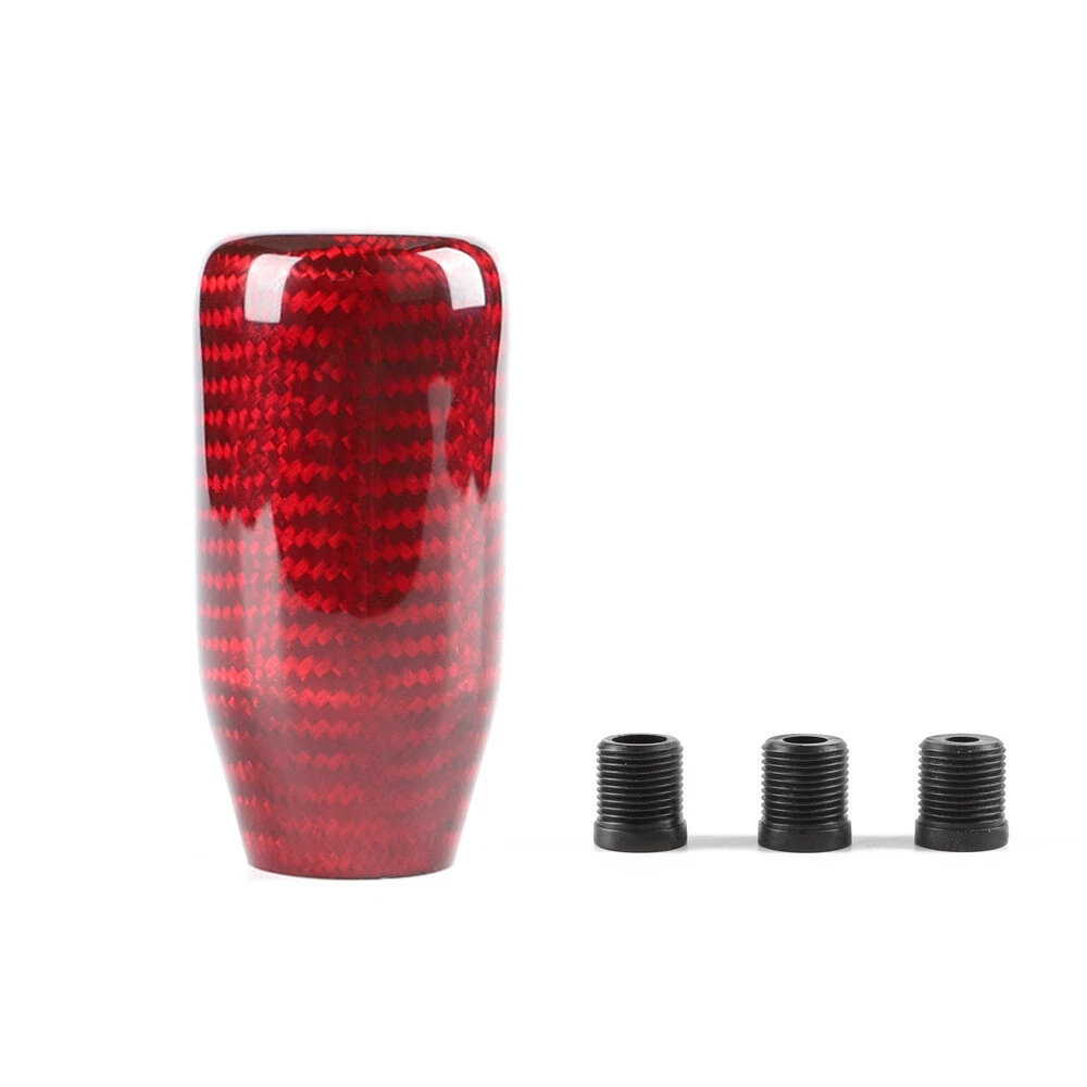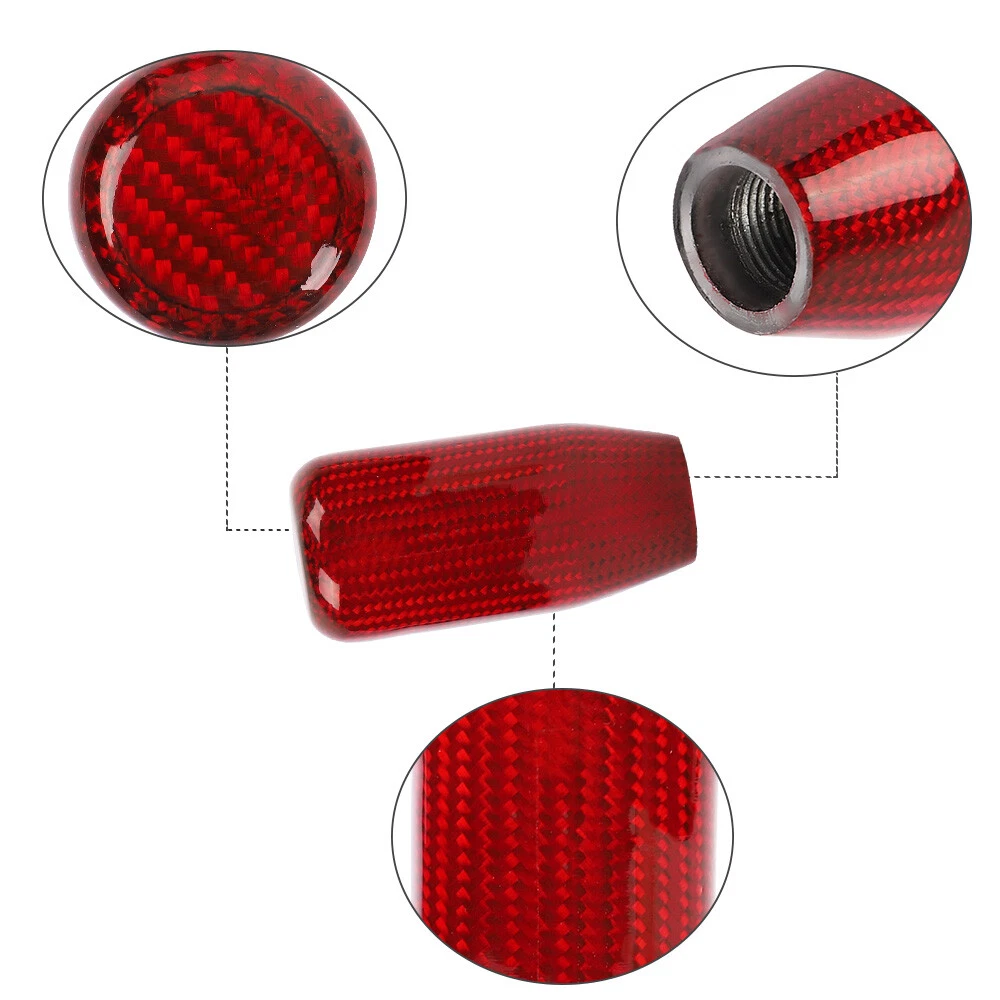 DESCRIPTION 100% Brand New and High Quality , Never Used or Installed Material : Made Of High Quality Real Carbon Fiber Color : Red/black/silver Carbon Fiber Size : about 75mm x 35mm x 25mm / 2.95" x 1.37" x 0.98" ( As picture show ) Direct replacement of the original knob, Comes with 3 thread adapters ( 8mm, 10mm, 12mm) Fitment: Universal Fit For Most Manual Transmission Vehicle (All Manual Car, No Button Shift Knob Automatic Car) No modification required from stock application so long as thread adapter matches Easy to install, direct screw on installation Gives your vehicle a sporty feel Improves the look and style of your vehicle * Professional Installer is Highly Recommended (No Instruction Included) Package includes: 1 x Shift Knob 3 x Adapters INSTALLATION: Remove the original factory gear knob from shifter Place the new knob over the shifter and fasten the correct nut Make sure the knob is firmly attached