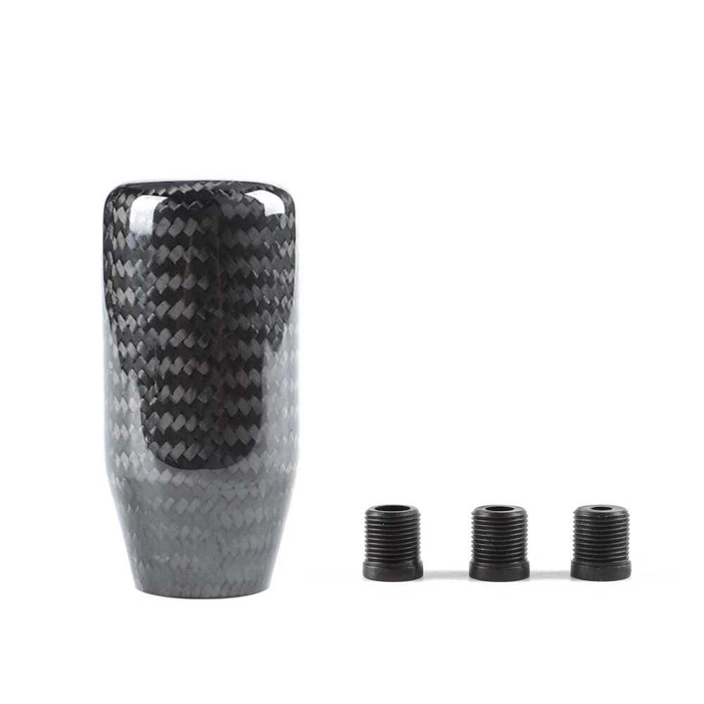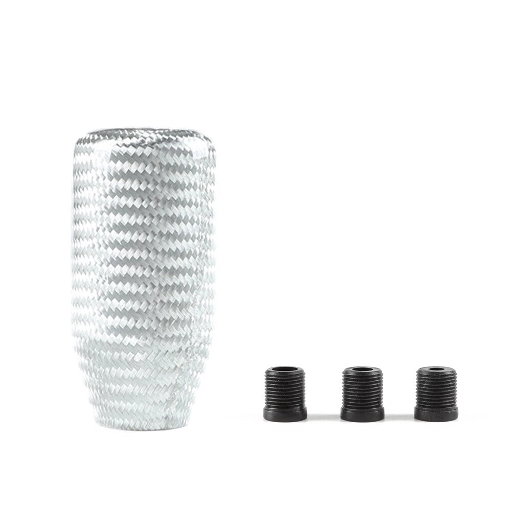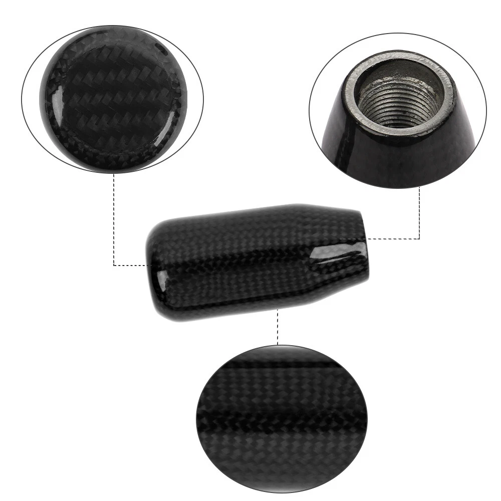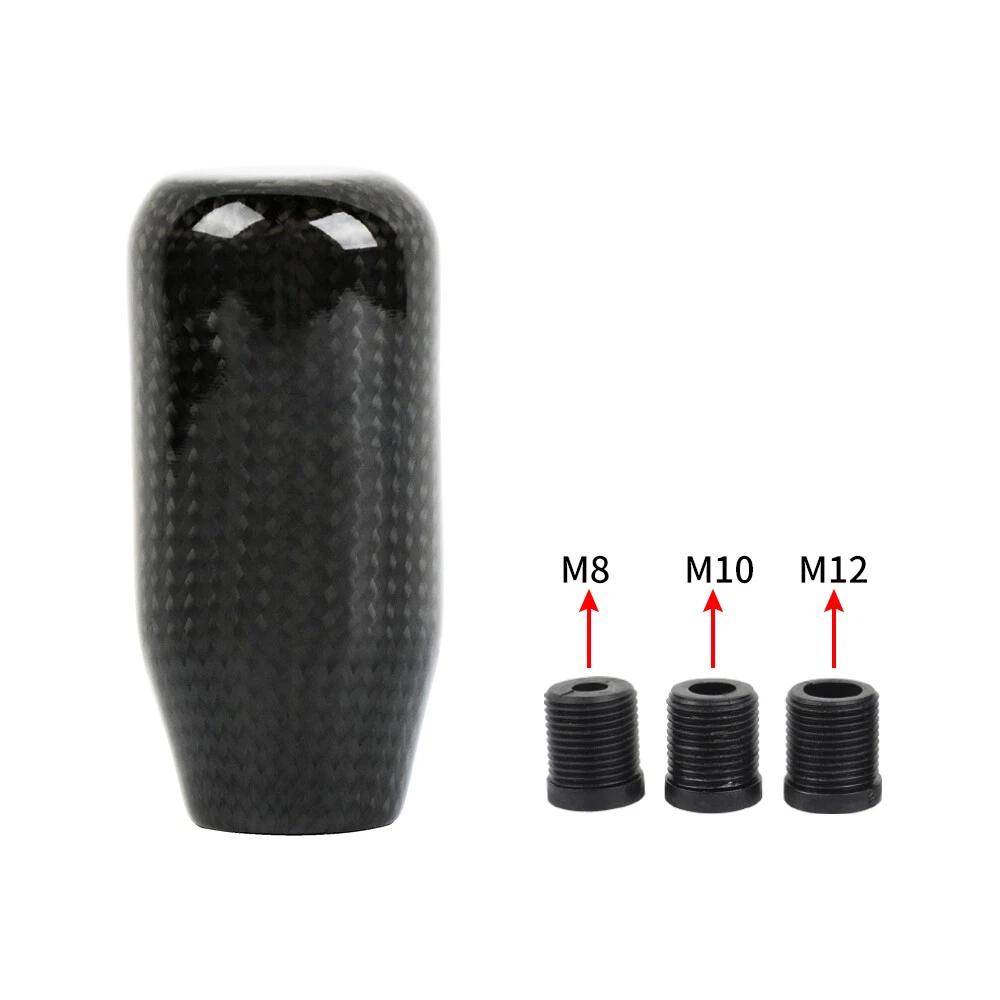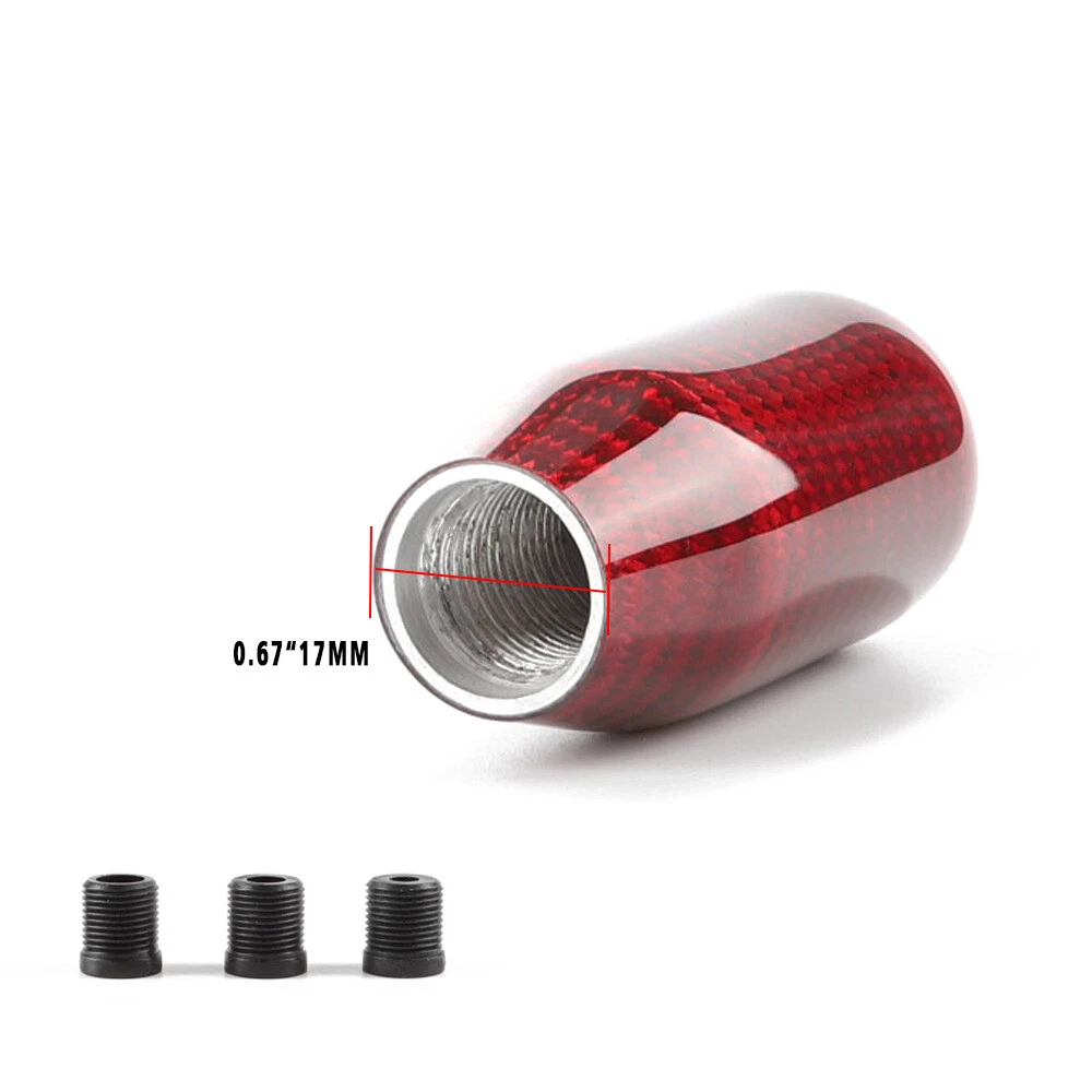 DESCRIPTION 100% Brand New and High Quality , Never Used or Installed Material : Made Of High Quality Real Carbon Fiber Color : Red/black/silver Carbon Fiber Size : about 75mm x 35mm x 25mm / 2.95" x 1.37" x 0.98" ( As picture show ) Direct replacement of the original knob, Comes with 3 thread adapters ( 8mm, 10mm, 12mm) Fitment: Universal Fit For Most Manual Transmission Vehicle (All Manual Car, No Button Shift Knob Automatic Car) No modification required from stock application so long as thread adapter matches Easy to install, direct screw on installation Gives your vehicle a sporty feel Improves the look and style of your vehicle * Professional Installer is Highly Recommended (No Instruction Included) Package includes: 1 x Shift Knob 3 x Adapters INSTALLATION: Remove the original factory gear knob from shifter Place the new knob over the shifter and fasten the correct nut Make sure the knob is firmly attached