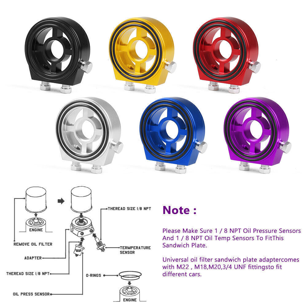 Product Description M20 Universal Car Oil Filter Temp Pressure Cooler Gauge Sandwich Plate Adapter Note:Silver by default.Leave us a ebay note if you need Black/Gold/Red/Blue/Purple.Thank you Feature: 1. This product has a rich color design, with six color styles to choose from, which can meet your needs for different color preferences 2. Provides direct mounting between oil cooler and oil filter without any engine block drilling or relocation 3. Universal oil filter sandwich plate adapter comes with M22, M18, M20, 3/4 UNF fittings to fit different cars 4. Before installing the adapter, an oil cooler must be installed to reduce the engine temperature, improve the engine protection, improve the heat dissipation effect, improve the dynamic performance, and make the engine work more smoothly and more powerful torque output 5. Wide application, suitable for TOYOTA - 3/4 UNF-16, for PEUGEOT - M20xP1.5, for VAUXHALL M20xP1.5 & 3/4 UNF-16, for PORSCHE - 3/4 UNF-16 for VOLVO - 3/4 UNF-16,for RENAULT - M20xP1.5 & 3/4 UNF-16 and other models Parameter: Material: aluminum alloy Size: 8.9*9.1cm Adapter specifications: M22, M18, M20, 3/4UNF Color: Silver Applicable models: TOYOTA - 3/4 UNF-16,for PEUGEOT - M20xP1.5,for VAUXHALL M20xP1.5 & 3/4 UNF-16, for PORSCHE - 3/4 UNF-16for VOLVO - 3/4 UNF-16, for RENAULT - M20xP1.5 & 3/4 UNF-16,for VW 3/4 UNF-16,for SAAB - M20xP1.5 & 3/4 UNF-16,for ALFA ROMEO - 3/4 UNF-16,for SEAT - 3/4 UNF-16, for AUDI - 3/4 UNF-16, for SKODA - 3/4 UNF-16 for BMW - 3/4 UNF-16 for CITROEN - M20xP1.5, for FIAT - 3/4 UNF-16 ,for FORD - 3/4 UNF-16, for HONDA - M20xP1.5, for NISSAN - 3/4 UNF-16 Include: 1* oil cake 4*Adapters (M22, M18, M20, 3/4UNF) Time-limited discount: 600W Watts Solar Panel Kit 12V 100A Battery Charger with Controller Caravan Boat 24.5 USD Free shipping 4 Pack Nipple Chicken Water Cup Drinking Poultry Auto Cup Farm backyard Feeder 18.29 USD Free shipping Engine Timing Kit for Ford/Mazda (Camshaft & Flywheel Locking Tools) 65.05 USD 72.28 USD Free shipping 10% off 30ml Professional Ink Eternal Tattoo Permanent Set 16 Colors Set 1oz Authentic 57.09 USD Free shipping Women's Lace Floral Long-Sleeve Mesh Sheer Crop T-Shirt Top 9.18 USD Free shipping Buttocks Enhancement Pump Breast Lifting Vacuum Cupping Suction Therapy Device E 32.76 USD Free shipping