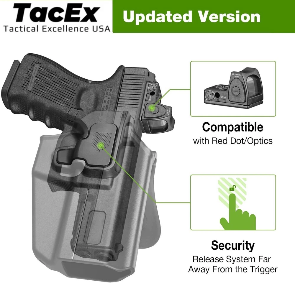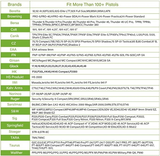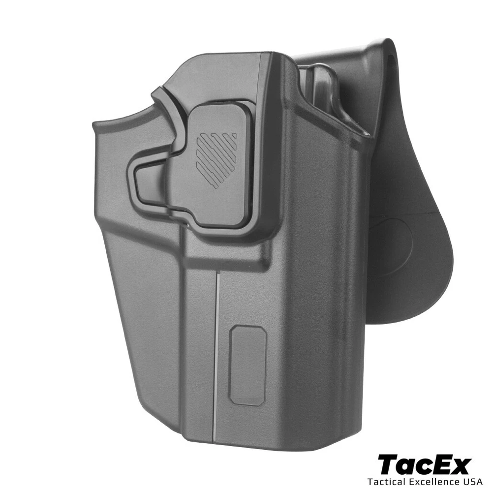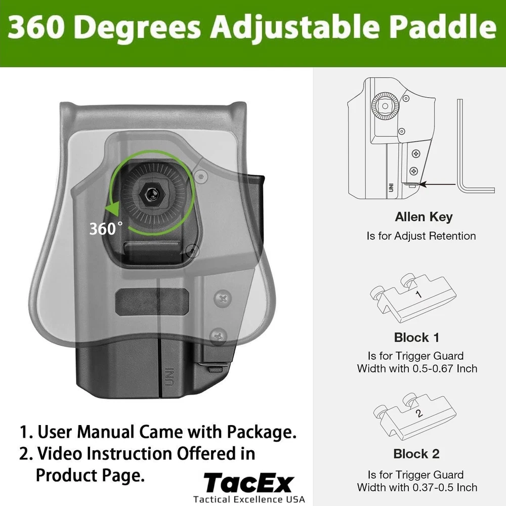 Universal OWB Pistol/Gun Paddle Holster w/ Quick Release Button Fits 100 Models Fits most Brands Standard Size/ Full Size/ Compact - Our UNI PRO holster is suitable for pistols with a trigger guard size of 0.37-0.67 inch Fits all red dot sights/optics Easy adjust to fits more than 100+ pistol, Please check diagram to help you better understand how to adjust this holster to fit different sizes of handguns. ( Allen Key is included ) Universal holster index finger release system far away from the trigger of the pistol Level II retention. Allows you to place your index finger (Trigger) in the perfect position that enables a smooth, quick draw from this holster Made of Nylon PA66 material, which is resistance to low and high temperature Designed for tactical training, hunting, military, the range, law enforcement agencies, personal defense, daily carry and open carry of any kind Holster will fit 1.5’’, 1.75’’, 2.0’’ wide belt Paddle is 360-degrees adjustable for all carrying position Locking Feedback & Trigger Guard Cover Note- This universal holster not for micro-compact a Lifetime Warranty If you are not 100% satisfied, we provide full refund or replacement to you no question asked