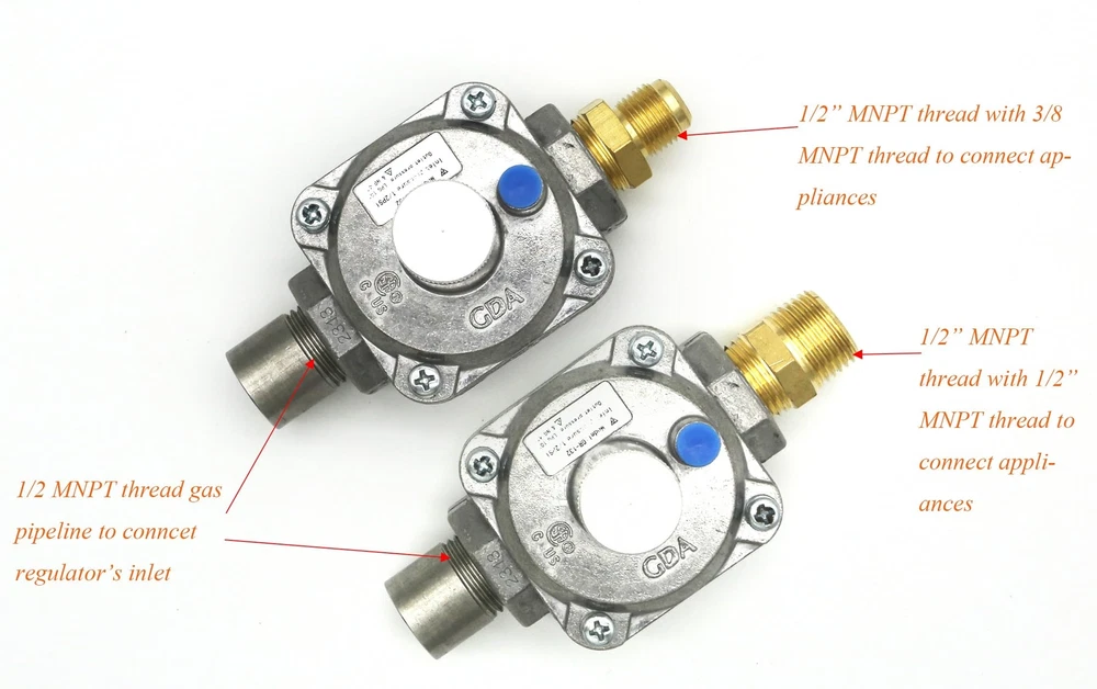 Applications. This pressure regulator fits for propane gas grills, heaters, ovens, gas welding equipments, etc Maximum flow capacity: 80,000 BTU/Hr Inlet pressure: 1/2" PSIG(Max). Outlet pressure: 10" WC(Set) Pipe thread sizes: 1/2"-14NPT inlet & 1/2"-14NPT outlet gas pipe Materials: Aluminum die casting Working ambient temperature is from 32°F to 225°F (0°C - 107°C)