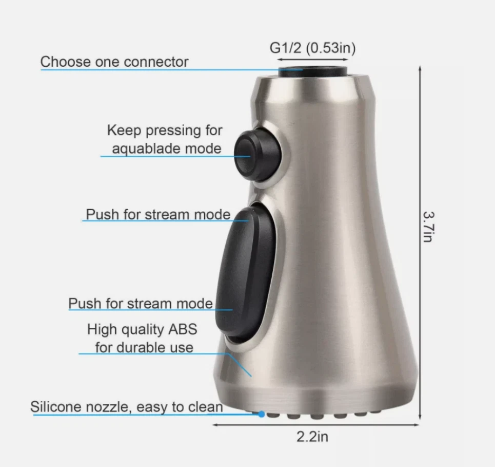 Product Feature : 【Premium Quality】 Crafted from high-grade ABS plastic with a premium chrome finish, our pull-down faucet spray head ensures durability and rust resistance, providing everyday convenience for various rinsing and filling needs. 【9 Different Adapters】 Our faucet spray head replacement includes 9 adapters, catering to various connections. Compatible with major brands of faucet hose connectors such as Moen, Delta, AquaSource, Kohler, Hansgrohe, Grohe, and so on. Please note that it is not compatible with most Pfister or Glacier Bay hoses. 【3-Mode Spray Options】 Enjoy three water modes: stream, spray, and aquablade. The aquablade mode provides powerful flushing to remove food debris. Easily switch between water modes with the push of a button. 【Removable & Washable Faucet Aerator】 We provide a free aerator key for easy removal or replacement of the faucet aerator for cleaning purposes. The interior multi-mesh aerator ensures a quiet, no-splashing aerated stream, filtering out most impurities. Cleaning the aerator ensures a continuous flow of clean water. 【Easy to Install】 Installation is a breeze! No tools required. In just minutes, unscrew your old faucet head and replace it with our new one for immediate use. Product Specification: Type: Pull Down Faucet Material: Engineering-grade ABS plastic Outer Diameter: G1/2 (20mm) Connection: G1/2 Male Thread, 5/8-16 UN, 5/8-18 UNF,4 Male Thread(17.1mm, 16.4mm, 15.5mm and 14mm) Overall Height: 4.09". (104 mm) Max. Width: 2.24". (57 mm) Package Included: 1 x Faucet Spray Head 9 x Connectors 1 x Aerator Key Tool Shipping * All items are in US warehouse and will be dispatched within 24 hours after receipt of payment. Please note that items purchased on weekends and Bank Holidays will be dispatched on the next working day. * It usually takes 3-5 working days for the delivery. But, the transit time is highly depend on Postal Service after we dispatched.If you have any problems, please feel free to contact us. * We ship items to your eBay confirmed address only. Please make sure your address on eBay is matched with your shipping address before you pay. * We are unable to take any responsibility for wrong address, any custom delay or tax. Returns * If the item can't works fine, please check twice to confirm that the item is defective, and contact our customer service representative asap let's know the detailed problem, we will do our best to server you. * If the package damaged during the freight, please refuse to sign for the package and return to us, then contact us promptly. * All of the Non-Seller mistake returns for refund are subject to 20% re-stock fee. And buyer should pay for the return shipping fee.(E.g choose the wrong size or wrong item) * We only accept the original package. Please make sure the item have No man-made sabotage. If you purchased in improper condition, please Note that the shippping and handling fee will not be refunded, all return shipping fee should paid by the buyer unless item DOA. * Guaranteed to Not be DOA and 100% working. Warranty covers replacement or repair. * Buyers are responsible for part return shipping fees on return package. * We reserve the right to refuse any returns for objective reasons. Contact Us * If you are dissatisfied for any reason, please don't leave negative/neutral feedback without asking. We work hard to make sure EVERY CUSTOMER 100% SATISFIED and resolve any problem for you. We always l eave positive feedback to all our customers. * If you are satisfied with the product you received,please leave us Positive Feedback and 5 Scores DSR * We are strive to providing 100% satisfaction services for our customers. Your satisfaction is our greatest pursuit. Positive Feedback is very important to us! Thank you!