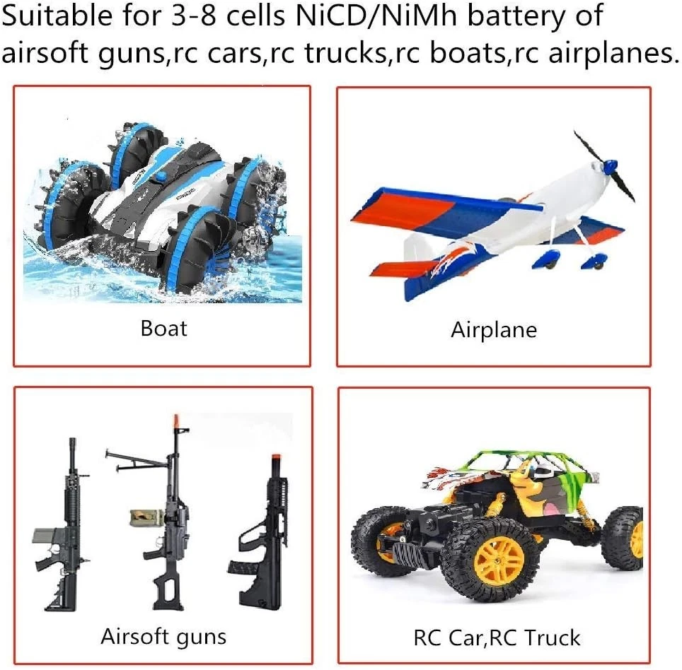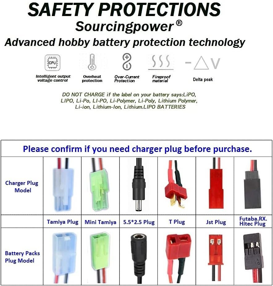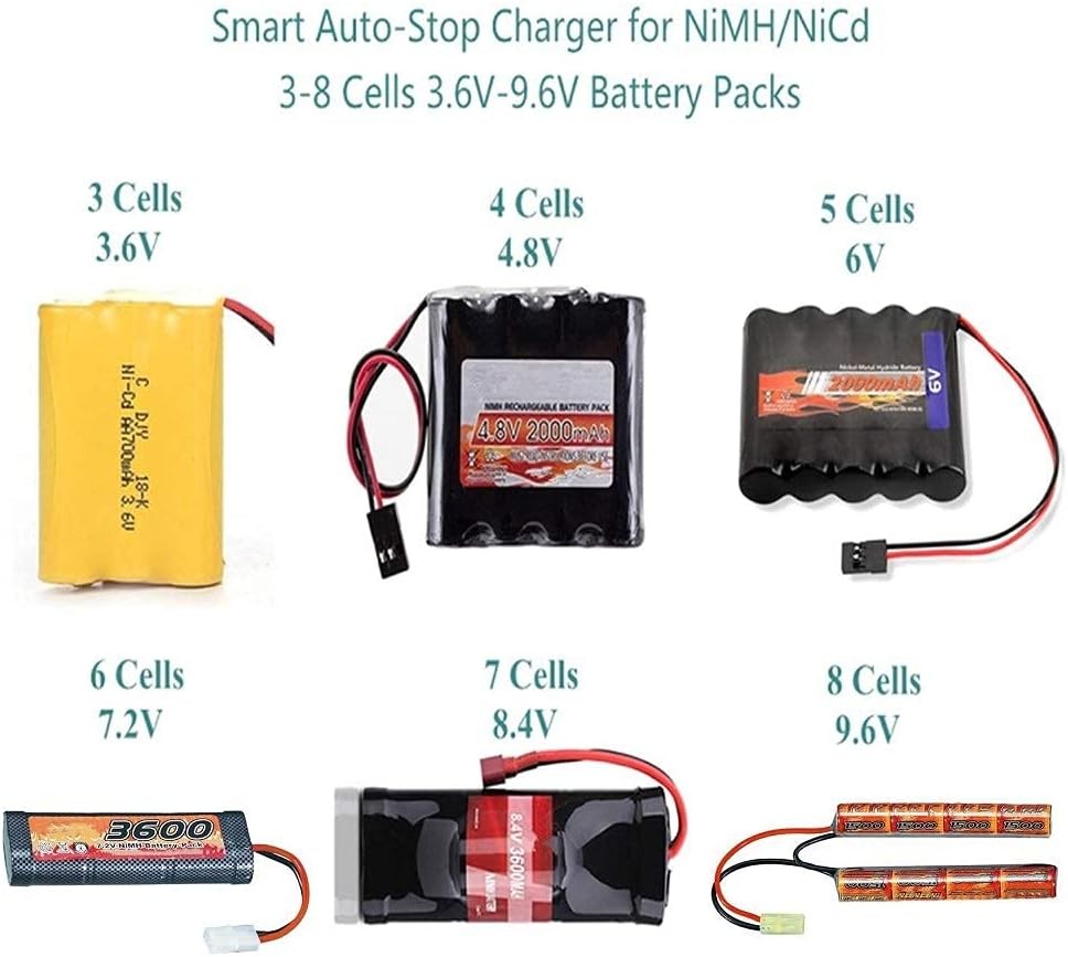 Universal RC Battery Charger for 3.6V-9.6V NiMH/NiCd Packs Red, Black Product Details Package Dimensions: 3 x 2.8 x 2 inches Item Weight: 5.6 ounces Item model number: Autocharger-2.0 Manufacturer: Sourcingpower Brand: Sourcingpower Color: Red, Black Output Voltage: 9.6 Volts Specification Met: CE Input Voltage: 120 Volts (AC) AUTO STOP SMART BATTERY CHARGER- Charges the NiMH/NiCd battery pack of 3-8 cells(3.6V,4.8V,6.0V,7.2V,8.4V,9.6V). The battery is automatically powered off when fully charged; TRICKLE CHARGE- The maximum charging time is 6 hours. There is trickle current after the power is turned off. Fast charge for NiCd/NiMH battery pack; HOBBY BATTERY CHARGER- With Delta Peak detection function, at the same time can eliminate the memory effect of the battery. Power all your hobbies with one charger. Such as battery packs for rc helicopters,tamiya rc trucks, Airsoft gun, RC Cars, and or remote controlled toys. Includes standard size Tamiya connector, standard to mini Tamiya adapter; 3.6V-9.6V NiMH/NiCd Battery Packs Hobbies For Airsoft Batteries; Make sure this is what you want. Not applicable: LiPO, LIPO, Li-Po, LI-PO, Li-Polymer, Li-Poly, Lithium Polymer, Li-ion, Lithium-Ion, Lithium. Only suitable for 3-8 cells of NiMH/NiCd Battery Packs. Mostly used for battery charging of toy, model cars, boats, aircraft,etc.